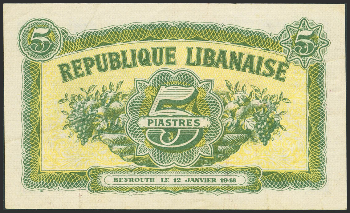 LEBANON. 5 Piastres. 12 January 1948. Republique Libanaise. (Pick: 40). Extremely Fine.