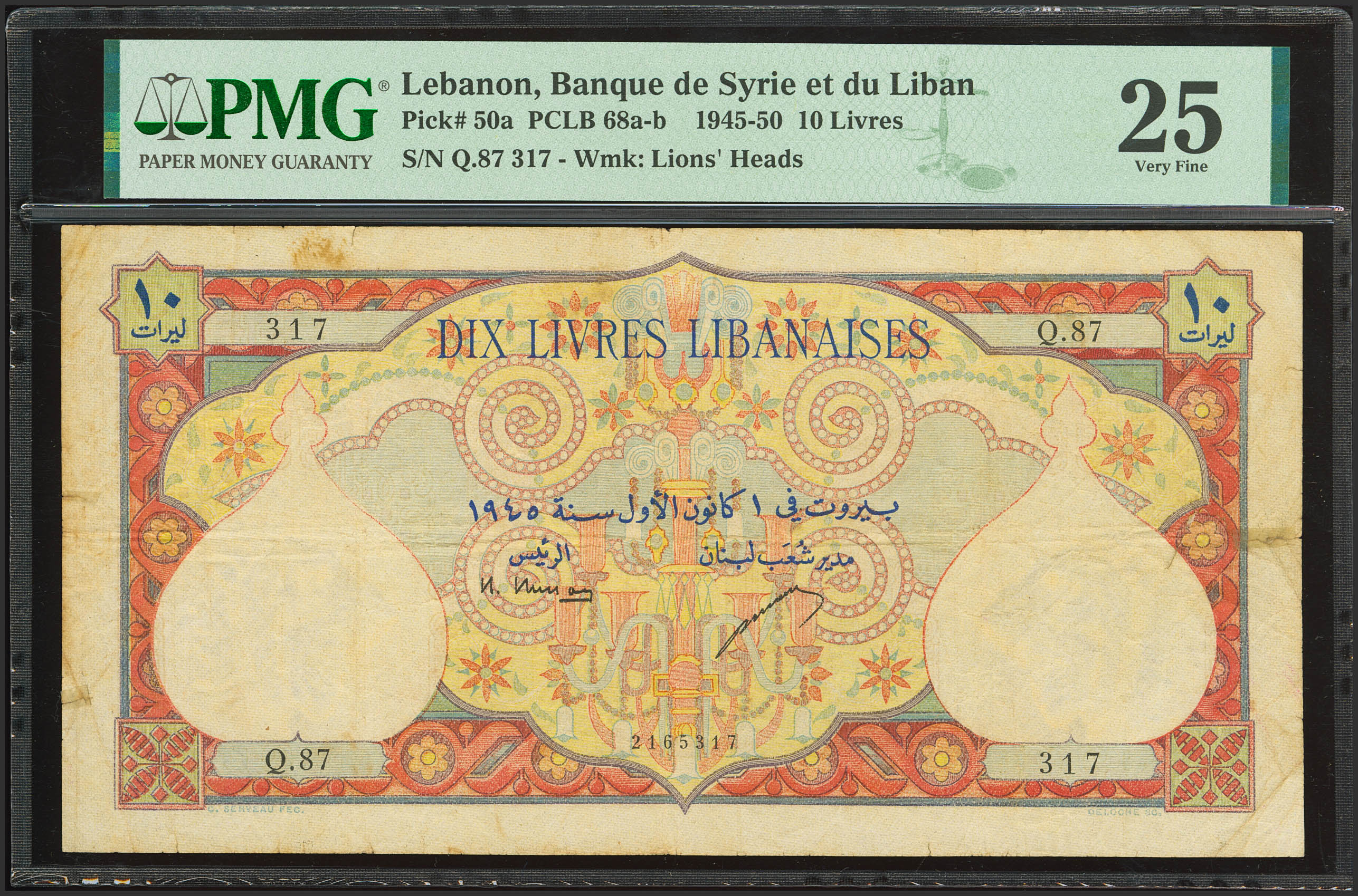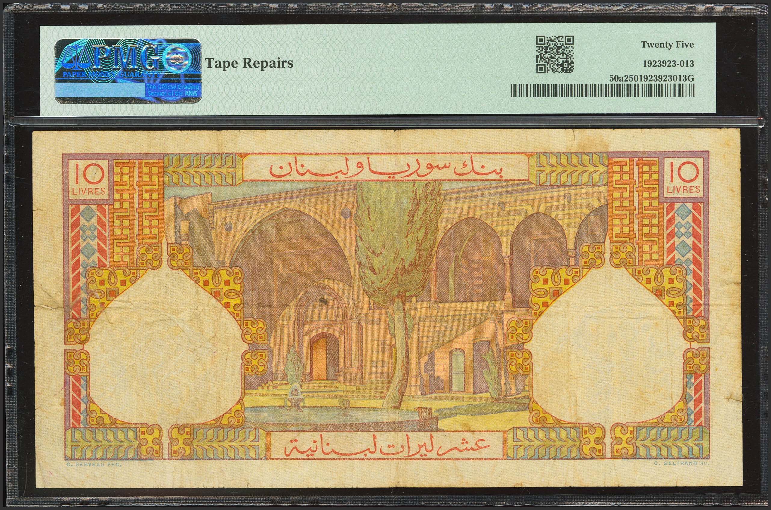 LEBANON. 10 Livres Libanaises. 1945. Banque de Syrie et du Liban. (Pick: 50a). PMG25 (tape repairs).