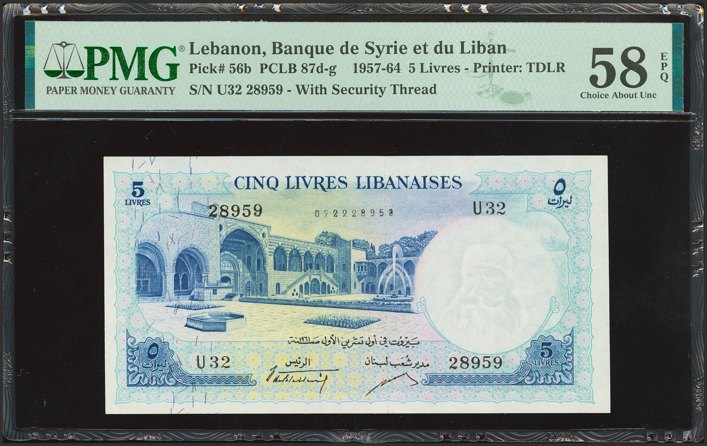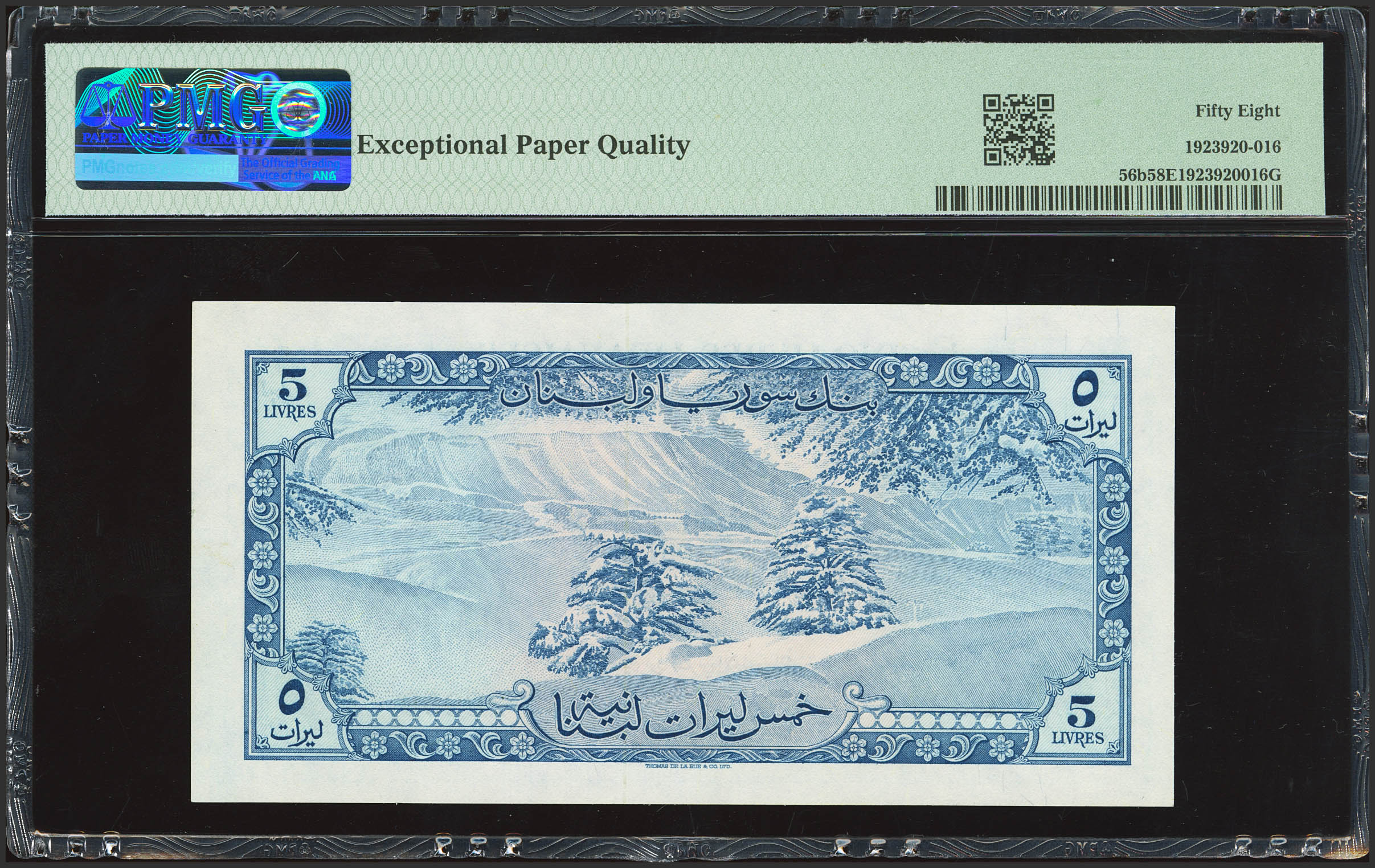 LEBANON. 5 Livres Libanaises. 1961. Banque de Syrie et du Liban. (Pick: 56b). PMG58EPQ.