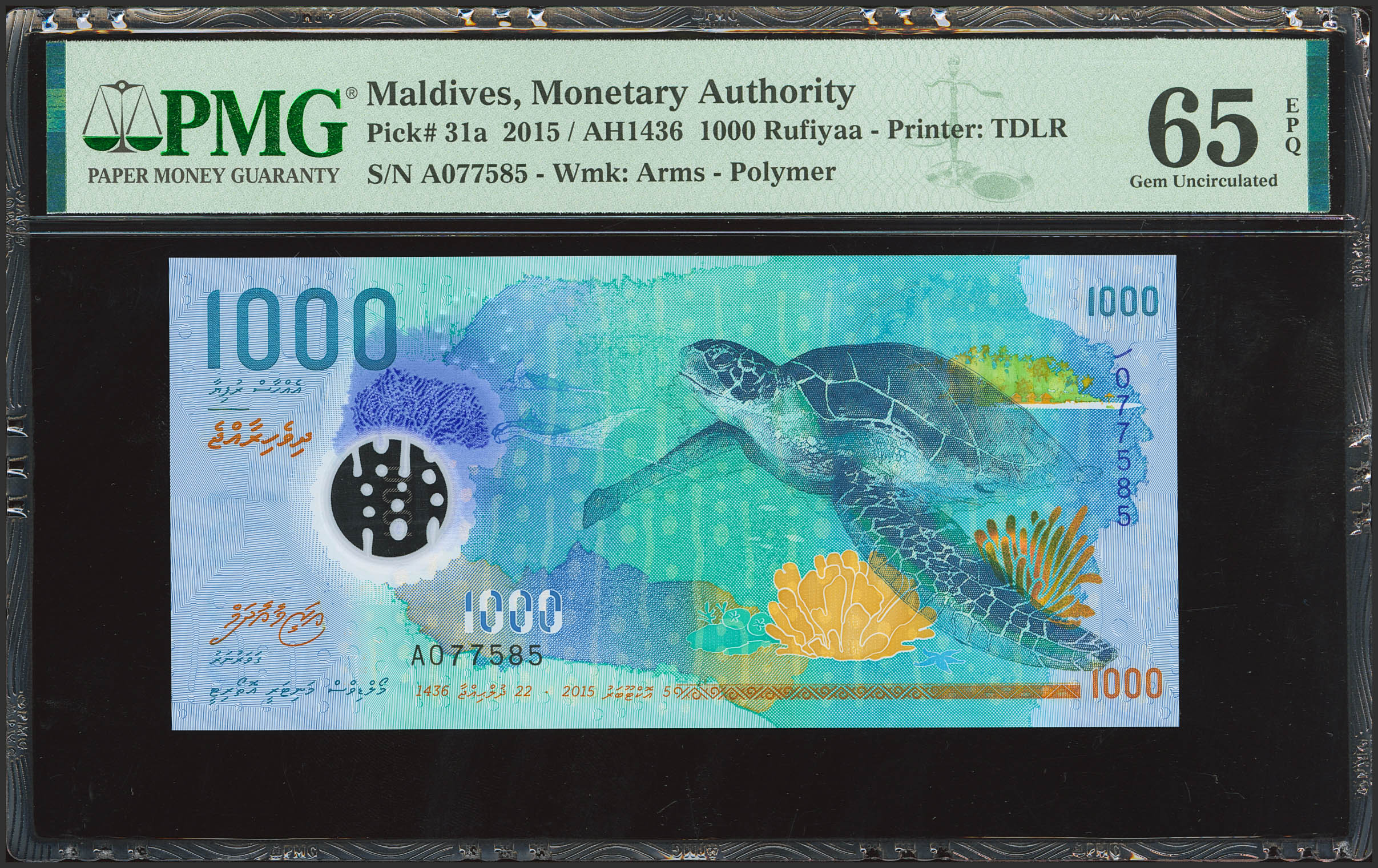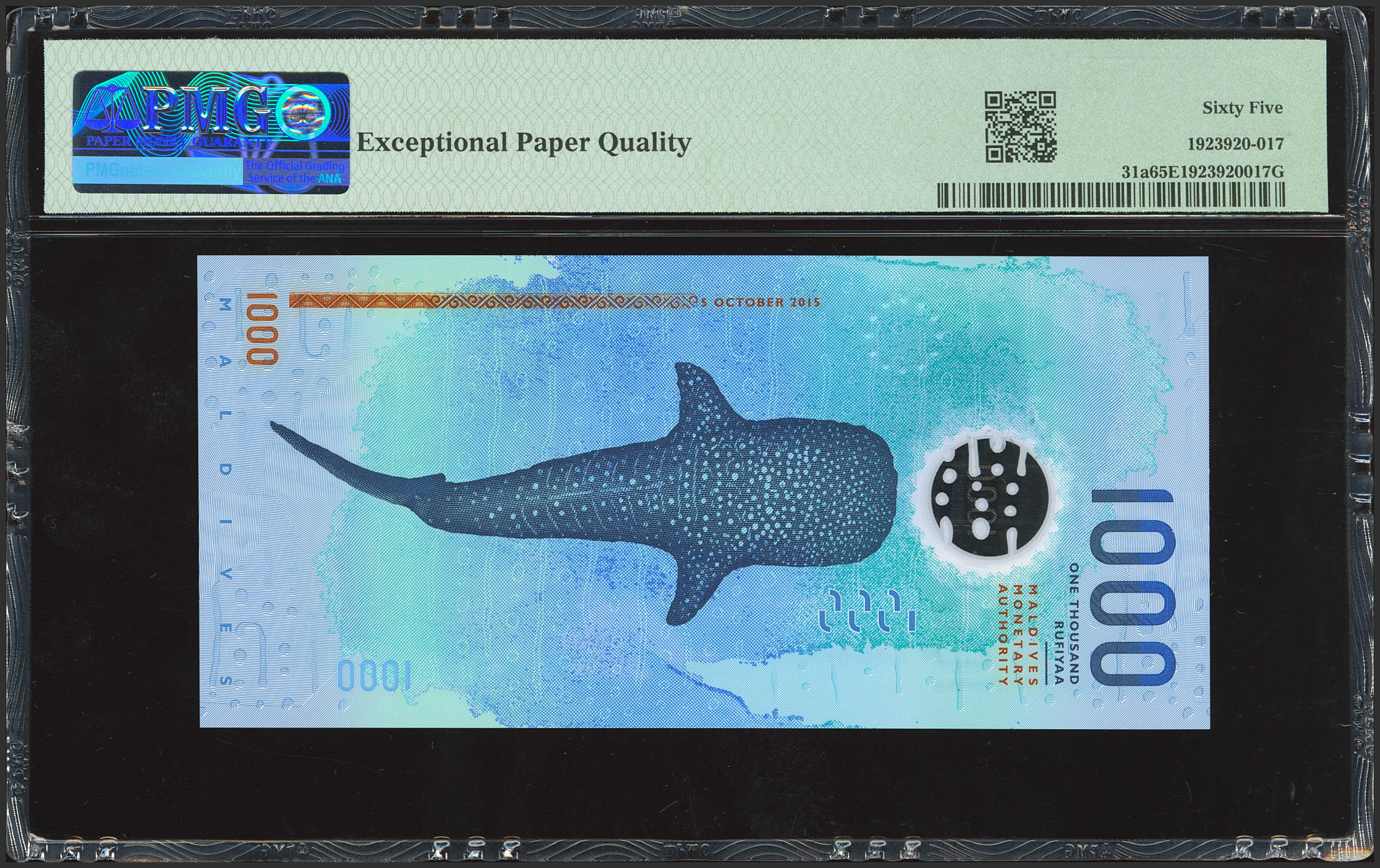 MALDIVES. 1000 Rufiyaa. 5 October 2015. Maldives Monetary Authority. (Pick: 31a). PMG65EPQ.