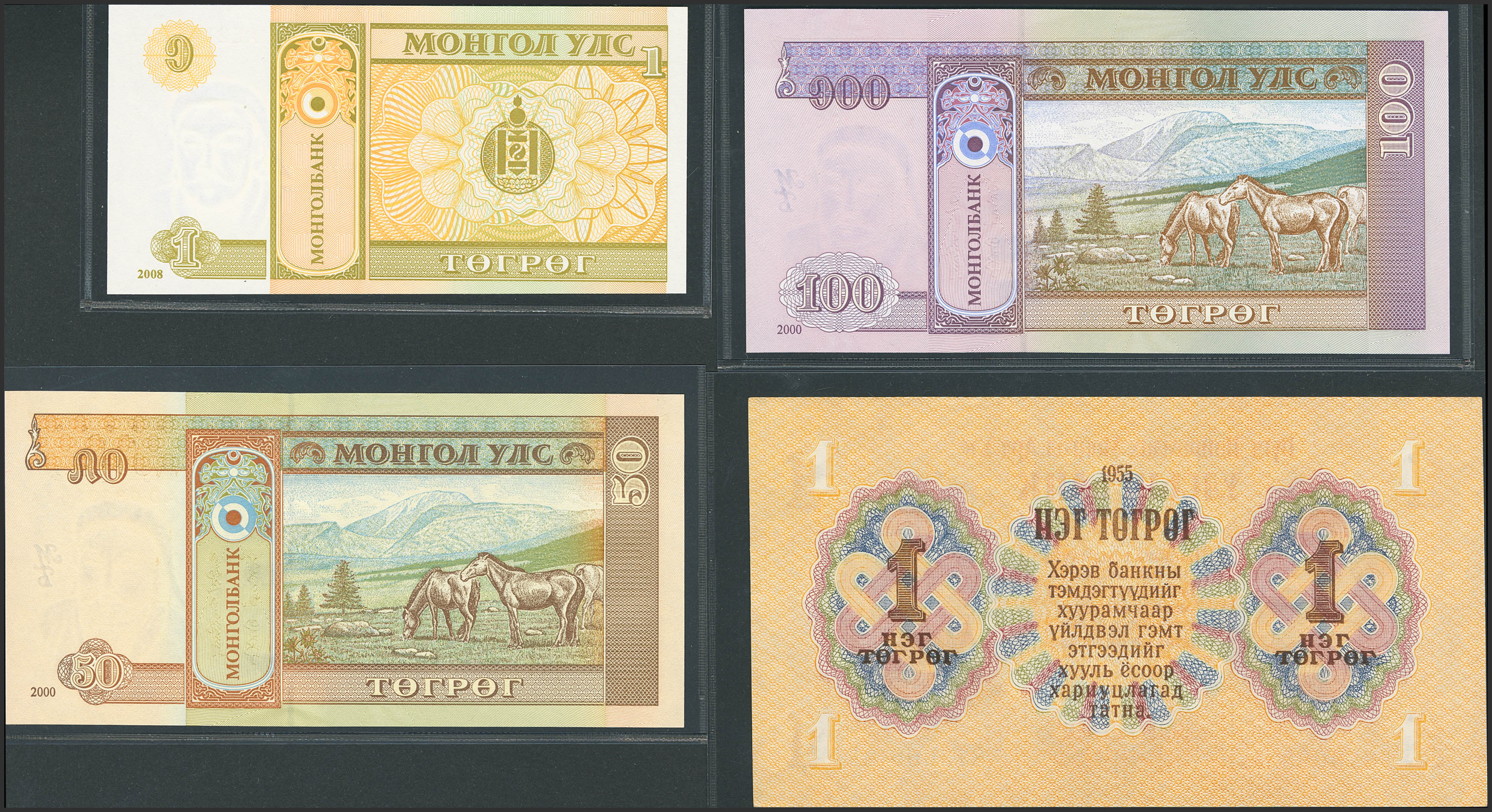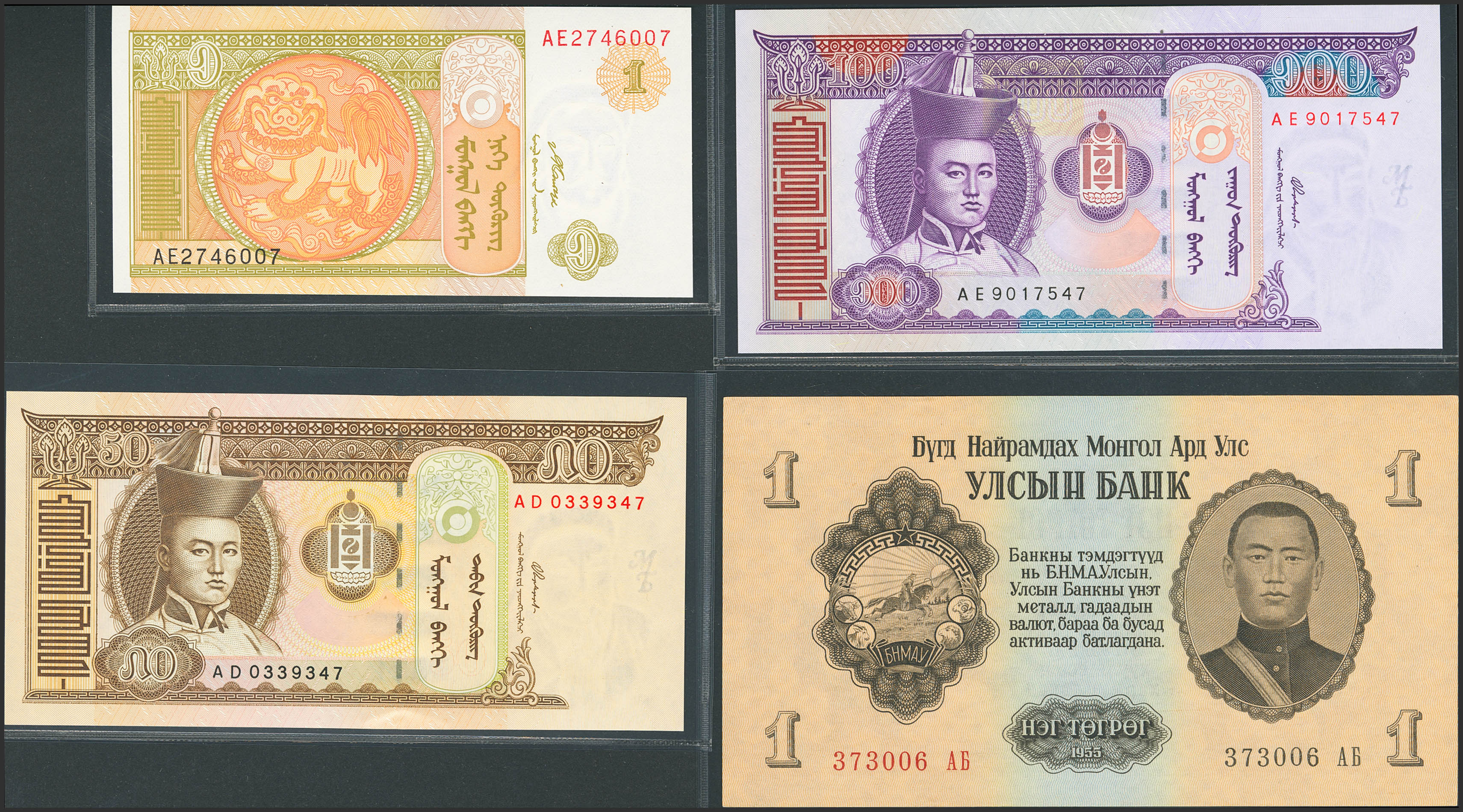 MONGOLIA. Lot of 3 notes of 1, 50 and 100 Tugrik. 1955, 2000 and 2008. Ulsiyn Bank and Mongolbank. (Pick: 28, 61Aa, 64a, 65a). Uncirculated.