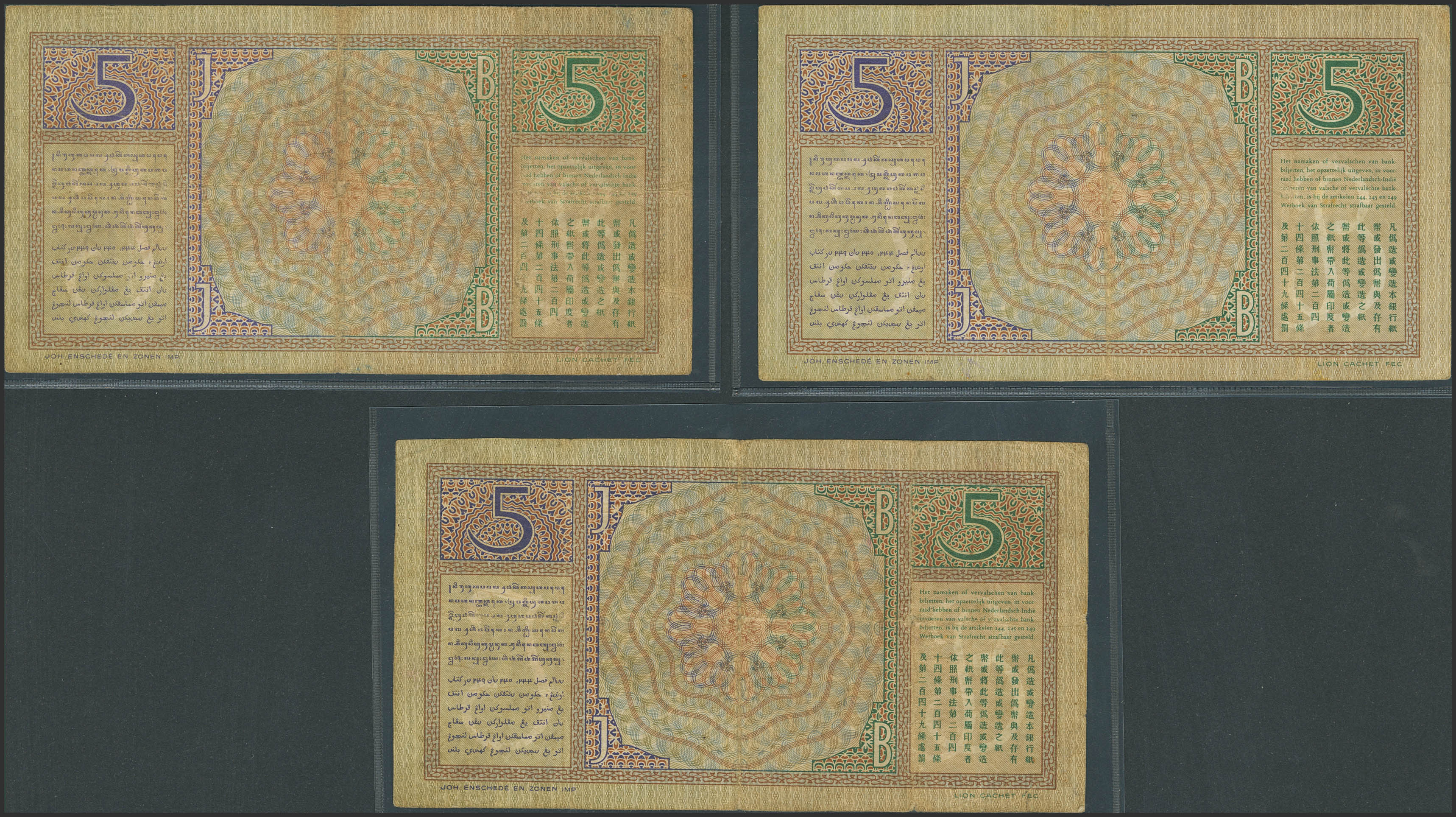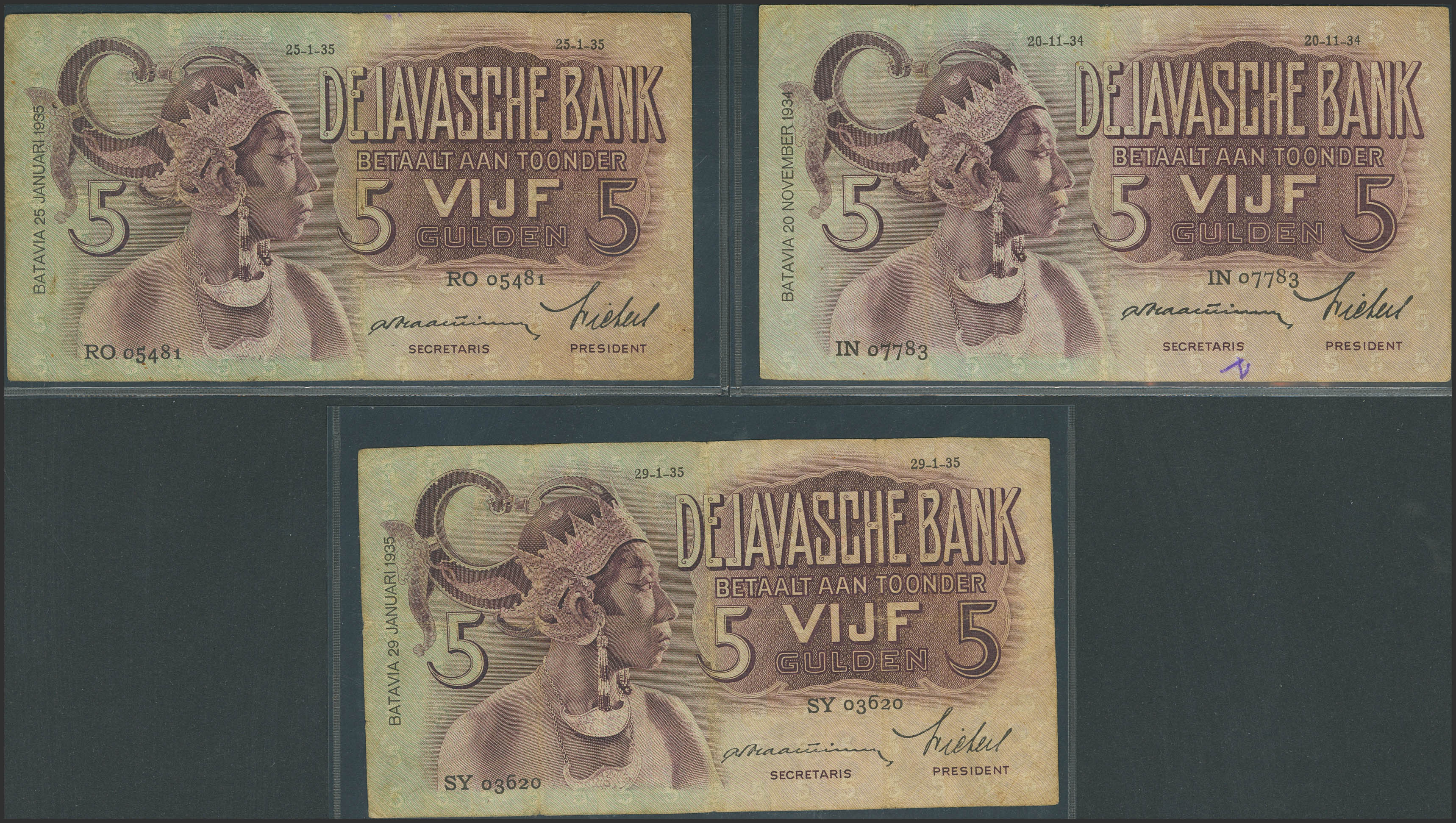 NETHERLANDS INDIES. Lot of 3 notes of 5 Gulden. 1934-1935. Javasche Bank. Different dates. (Pick: 78a). Fine / Very Fine, graffiti, pinholes.