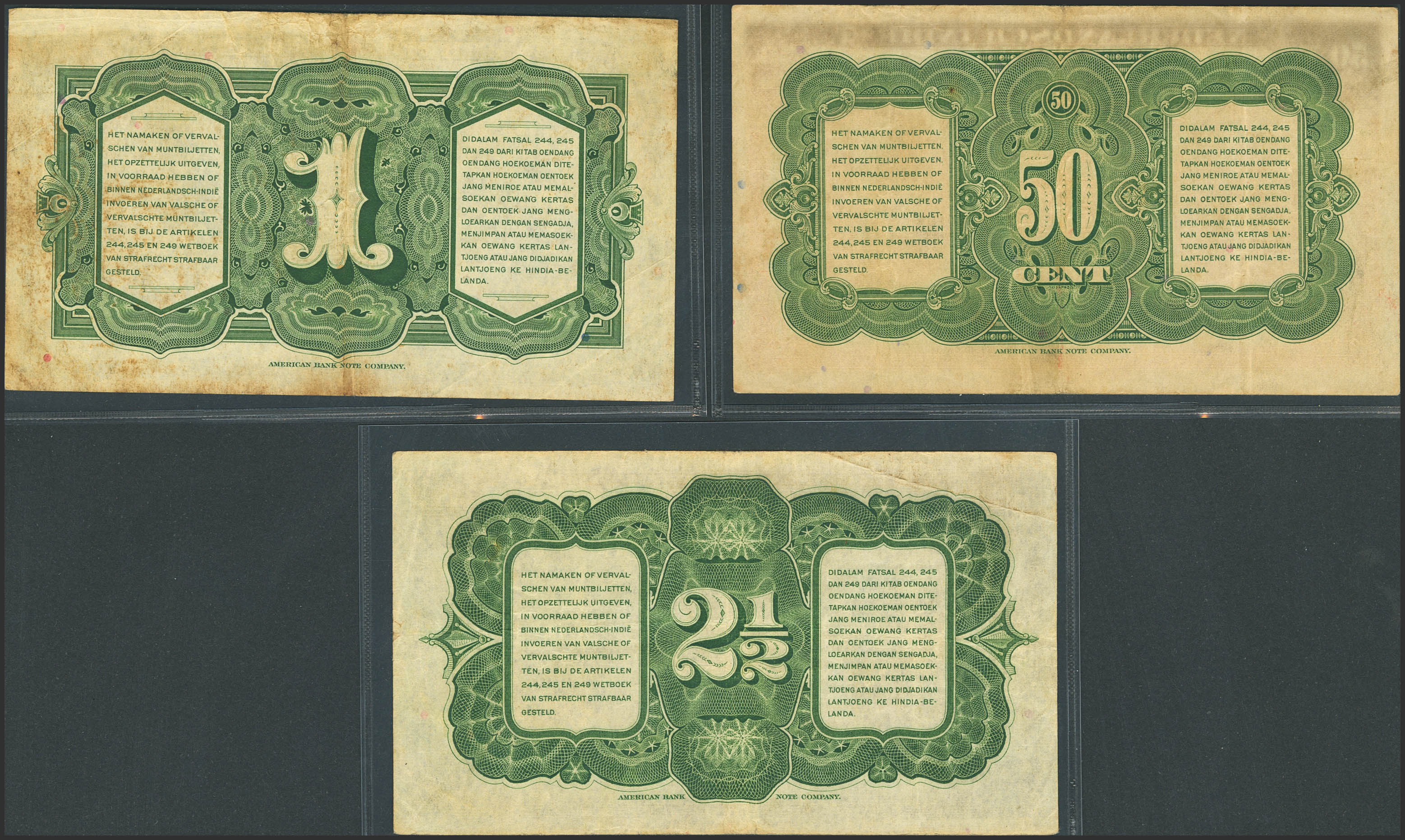 NETHERLANDS INDIES. Lot of 3 notes of 50 Cent, 1 and 2´5 Gulden. 2 March 1943. Ministry of Finance. Javasche Bank. (Pick: 110a, 111a, 112a). More than Very Fine, some are dirty.