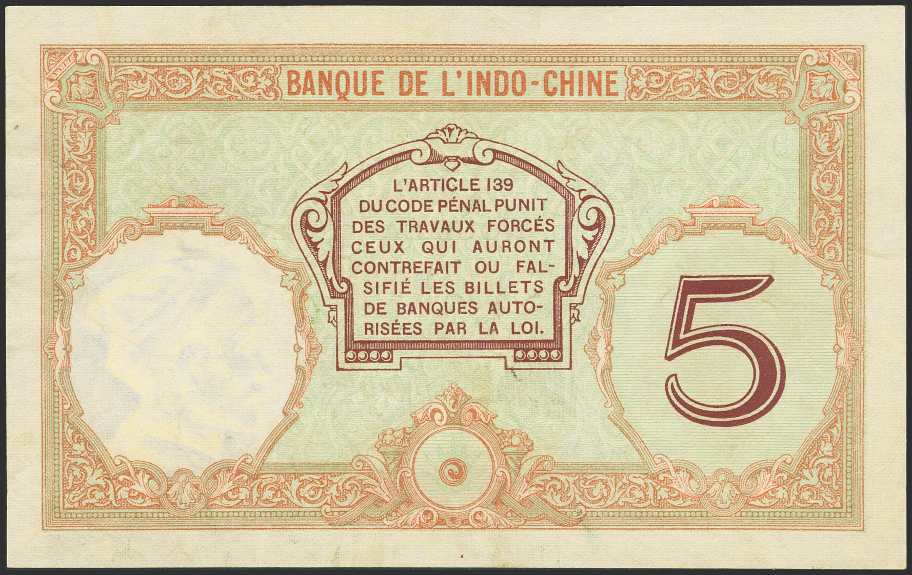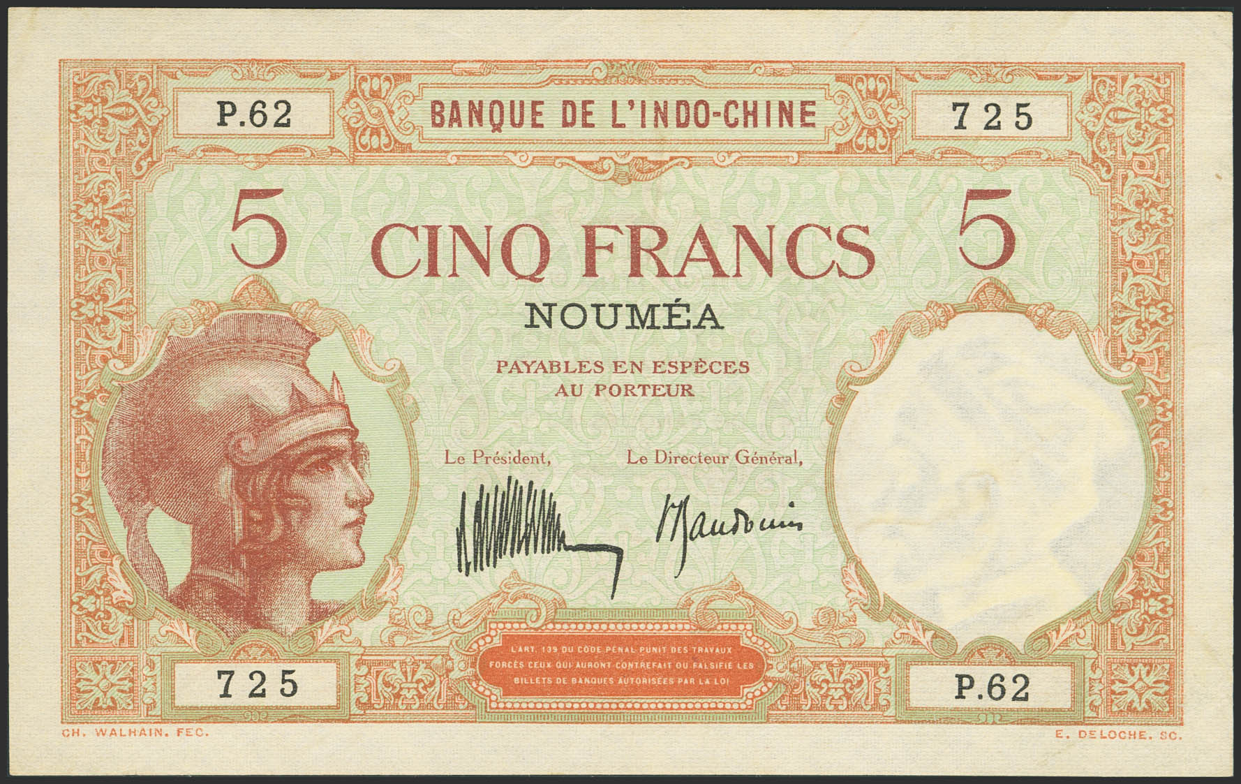 NEW CALEDONIA. 5 Francs. (1926ca). Banque de L´Indo-Chine. Noumea. Thion de la Chaume and Baudouin signatures. (Pick: 36b). Extremely Fine.