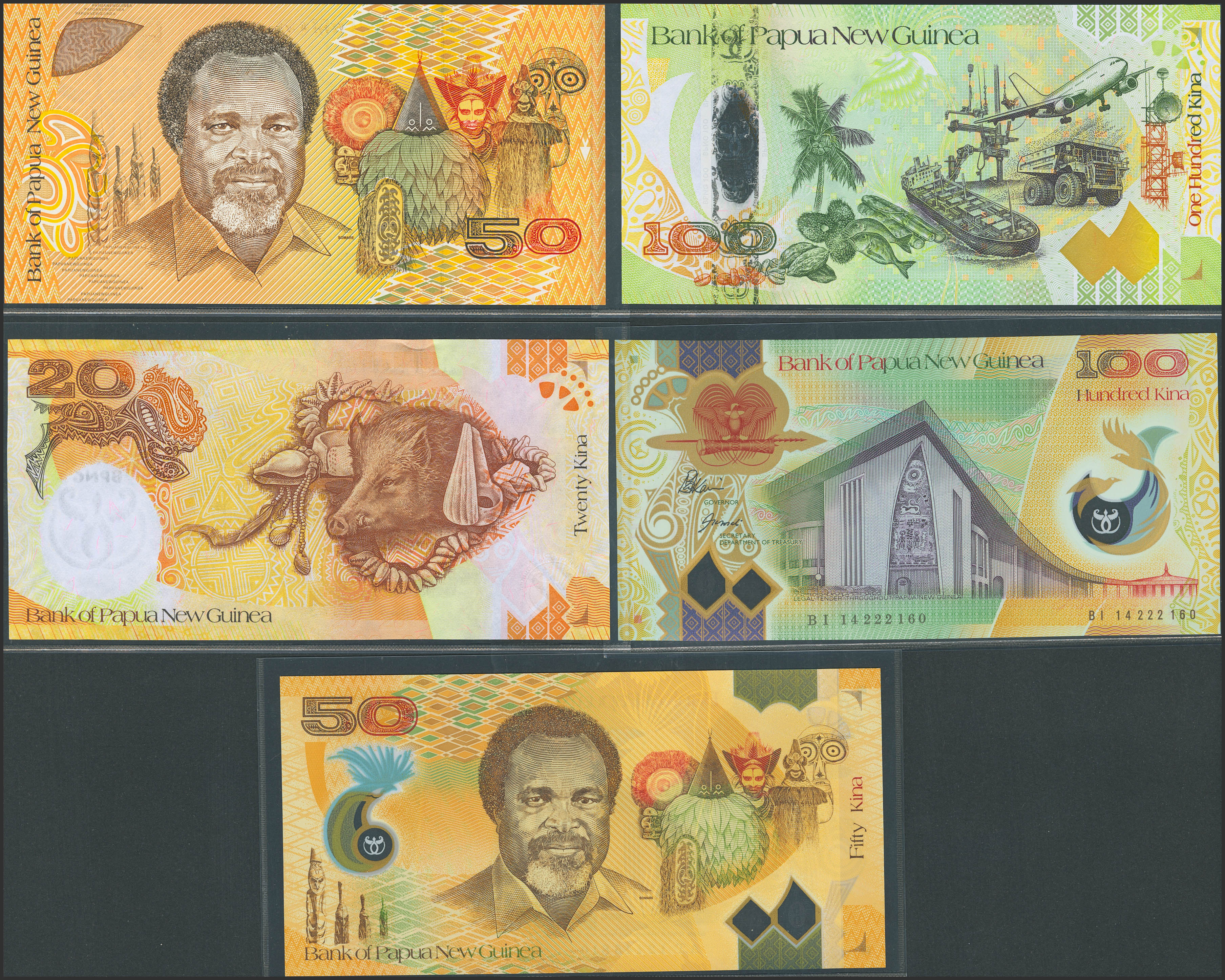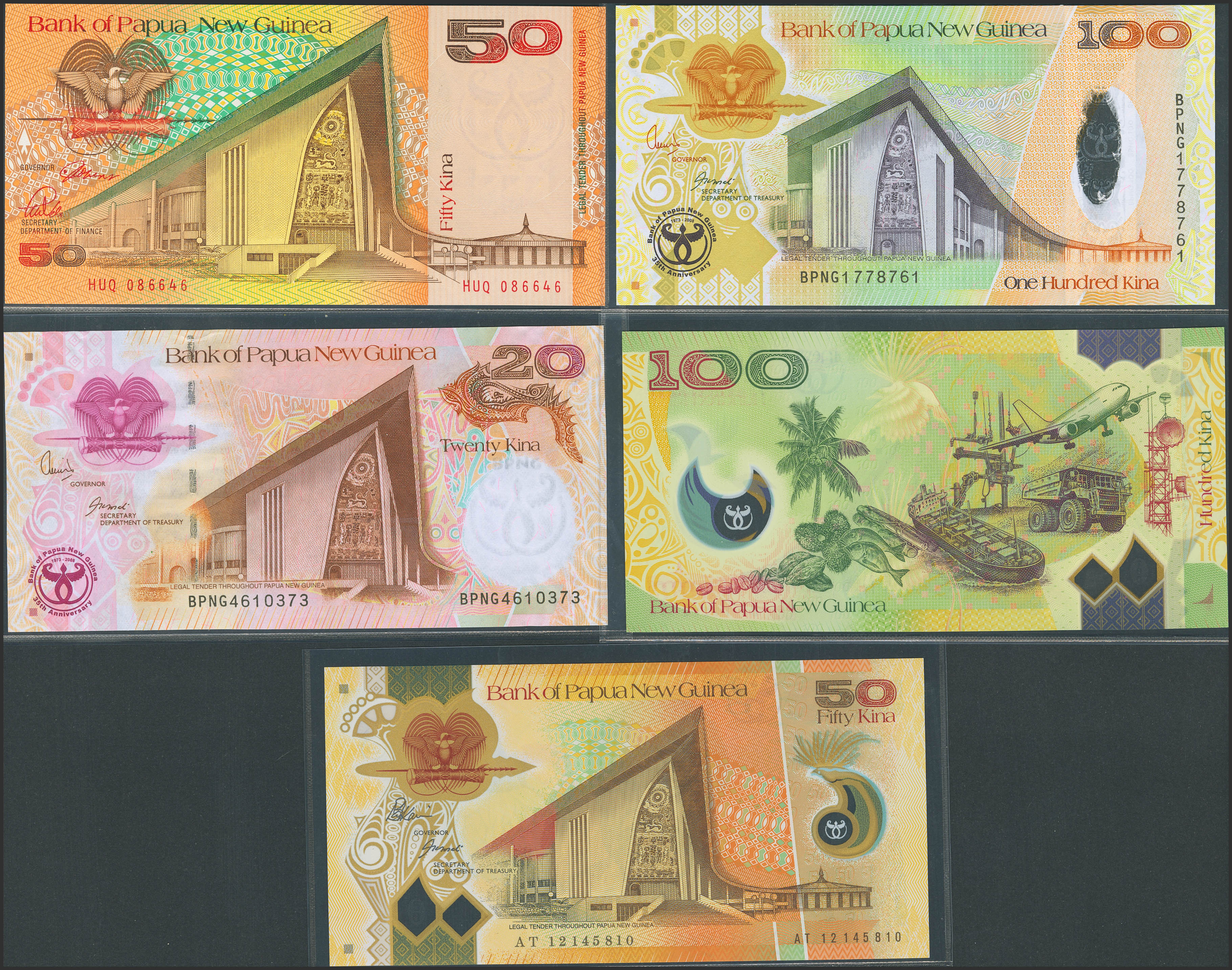 PAPUA NEW GUINEA. Lot of 5 notes of 20, 50 and 100 Kina. 1991-2008. Bank of Papua New Guinea. (Pick: 11a, 32b, 33c, 36a, 37a). Uncirculated.