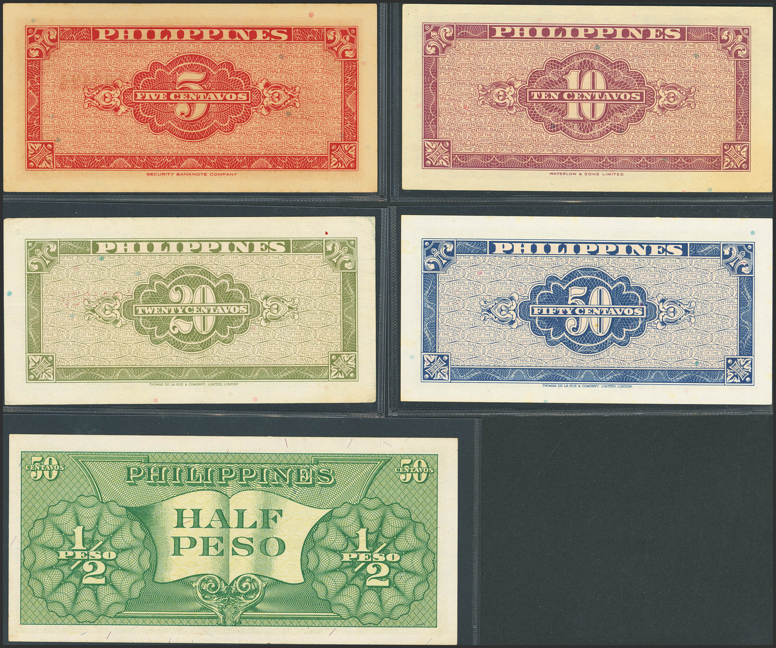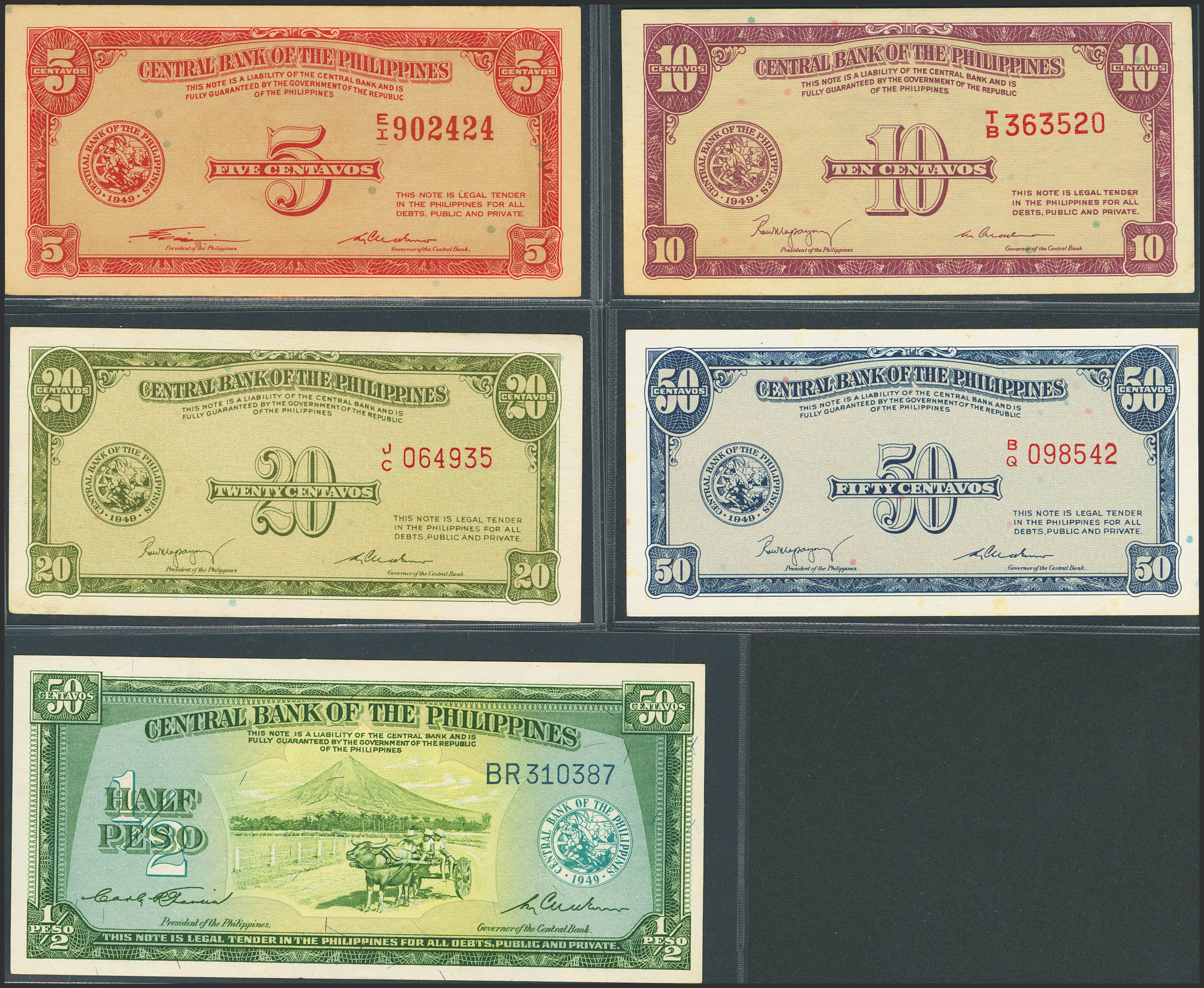 PHILIPPINES. Lot of 5 notes of 5, 10, 20 and 50 Centavos and ½ Peso. (1949ca). Central Bank. (Pick: 125a, 128, 130a, 131a, 132a). Extra Fine to Uncirculated.
