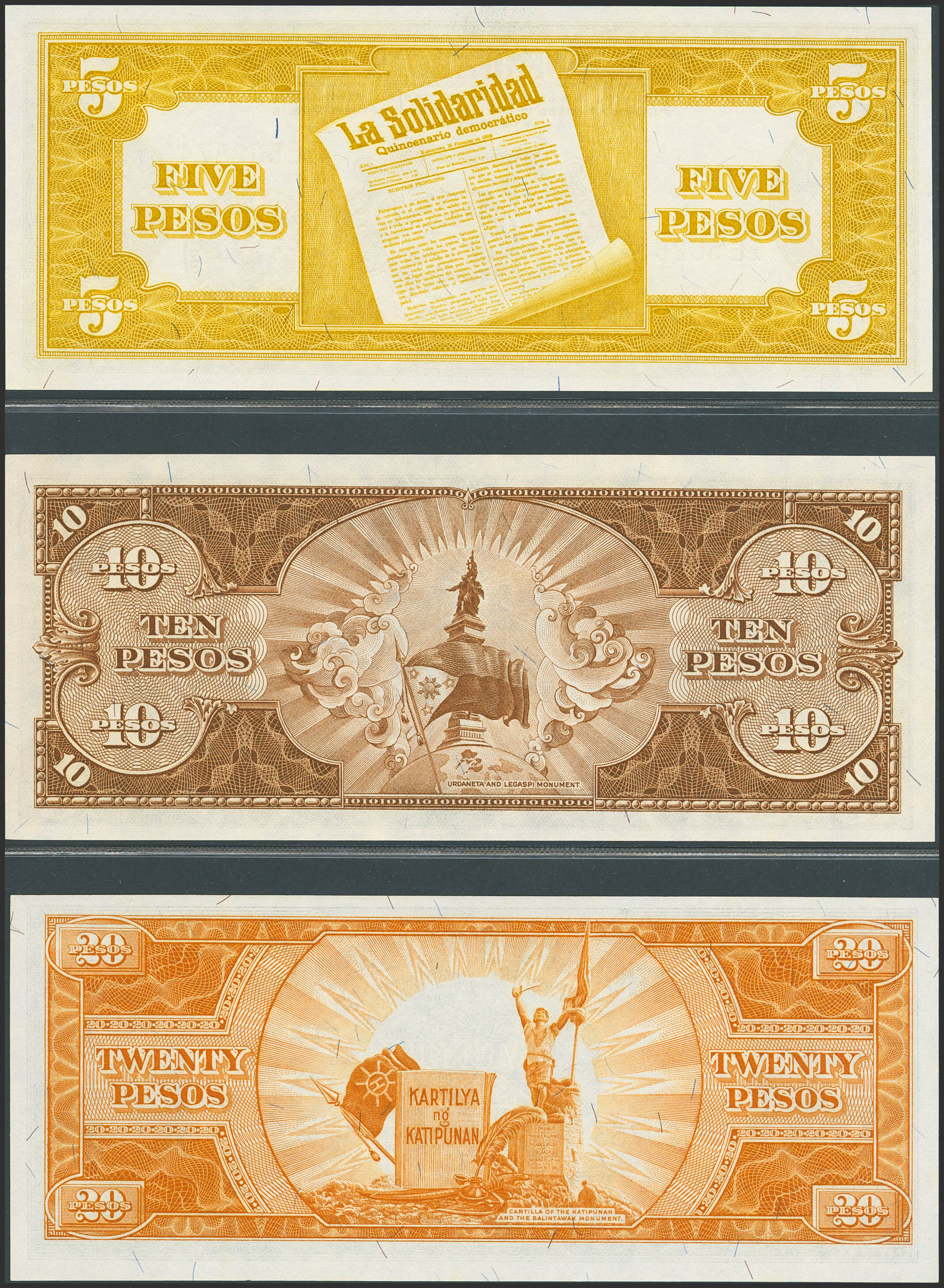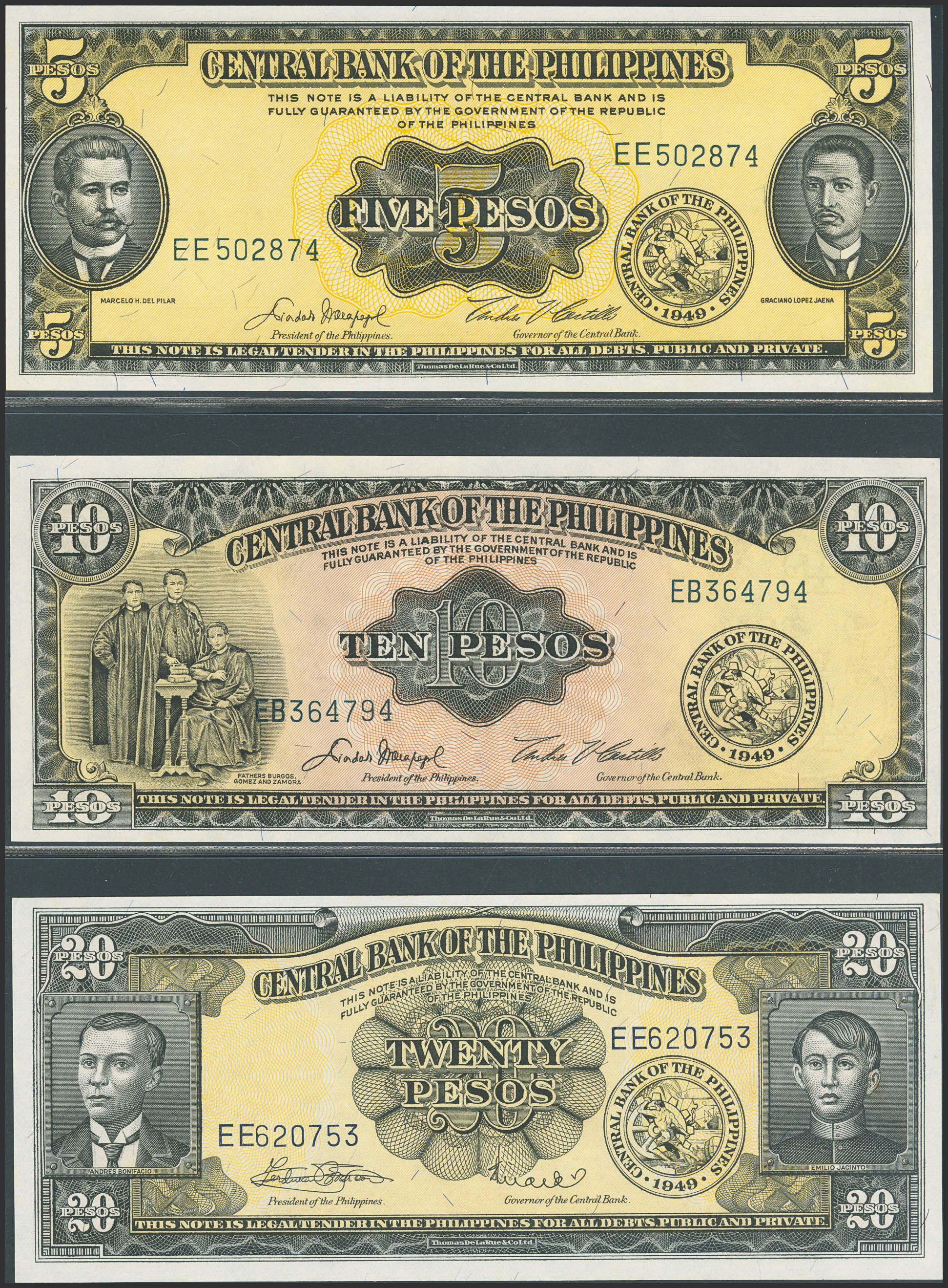 PHILIPPINES. Lor of 3 notes of 5, 10 and 20 Pesos. (1949ca). Central Bank. (Pick: 135e, 136e, 137e). Uncirculated.