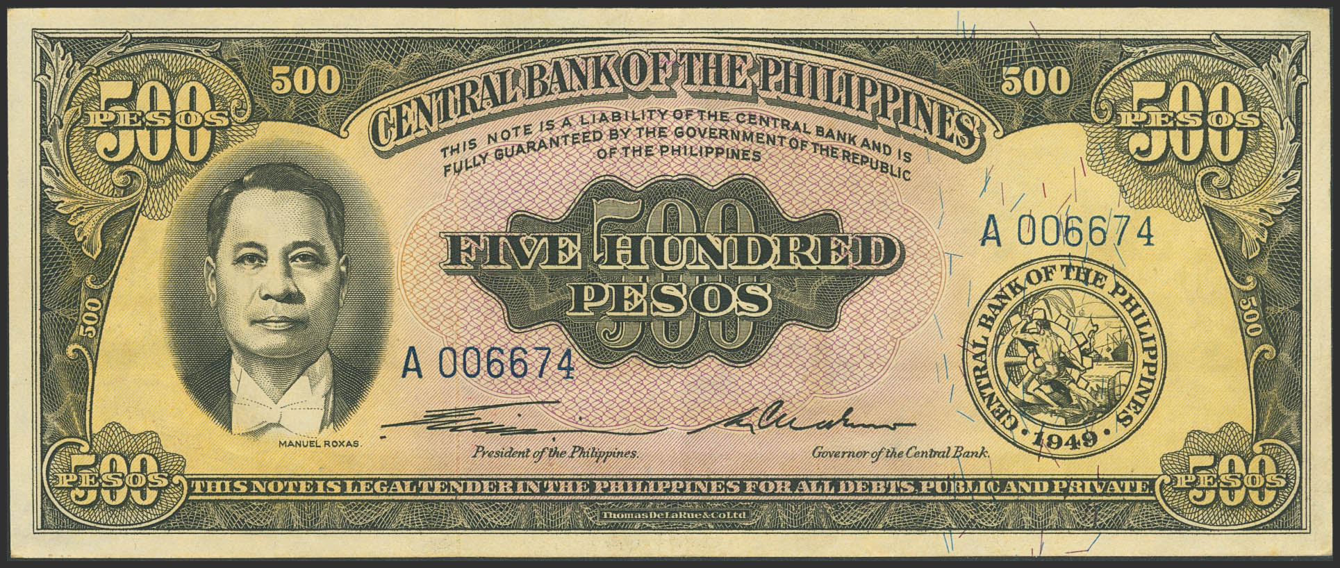 PHILIPPINES. 500 Pesos. (1949ca). Central Bank. (Pick: 141a). Extremely Fine.