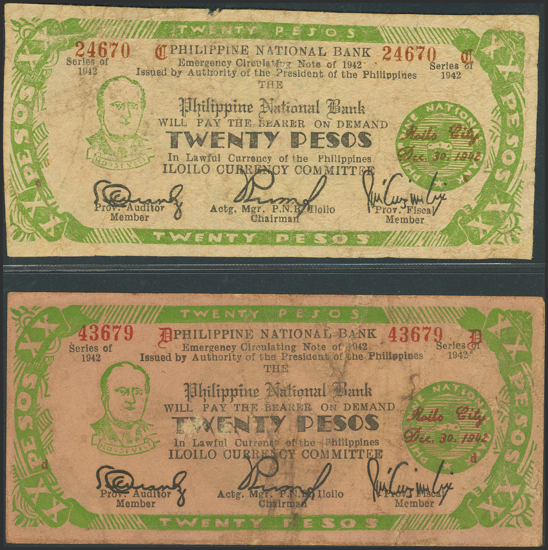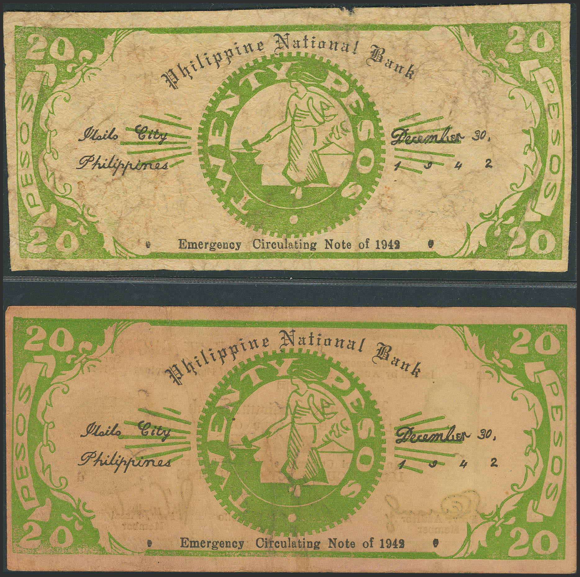 PHILIPPINES. Lot of 2 notes of 20 Pesos. (1942ca). Philippine National Bank. Iloilo City. (Pick: S315a). Very Fine and Fine.