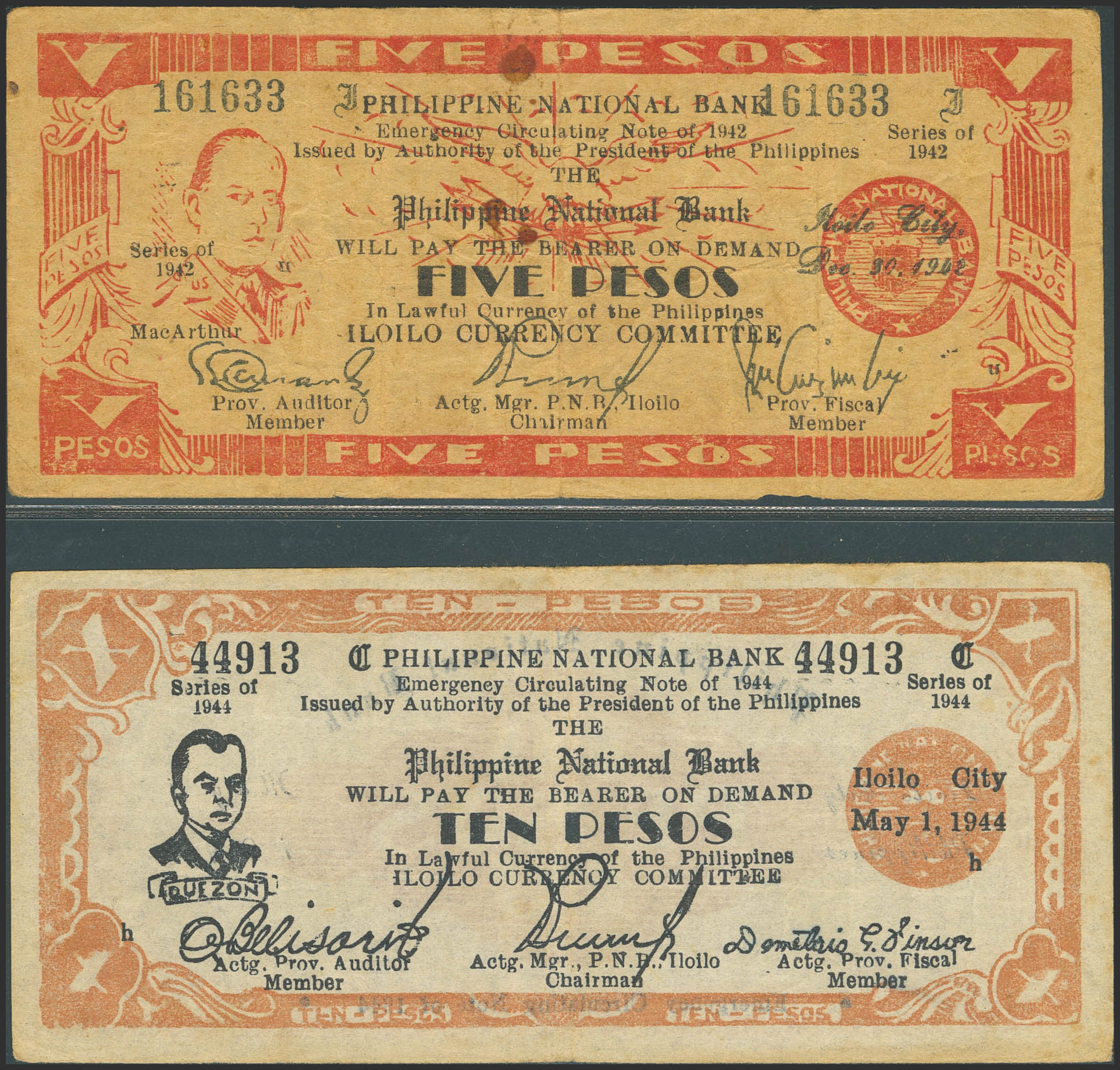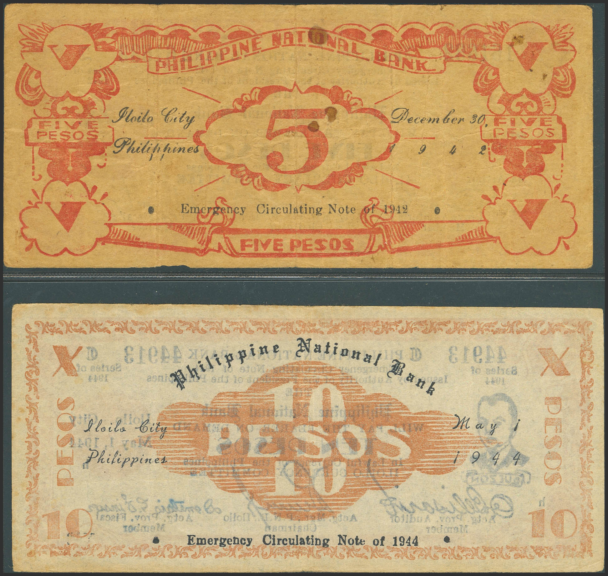 PHILIPPINES. Lot of 2 notes of 5 and 10 Pesos. (1942ca). Philippine National Bank. Iloilo City. (Pick: S316, S342). More Than Very Fine and More Than Fine.