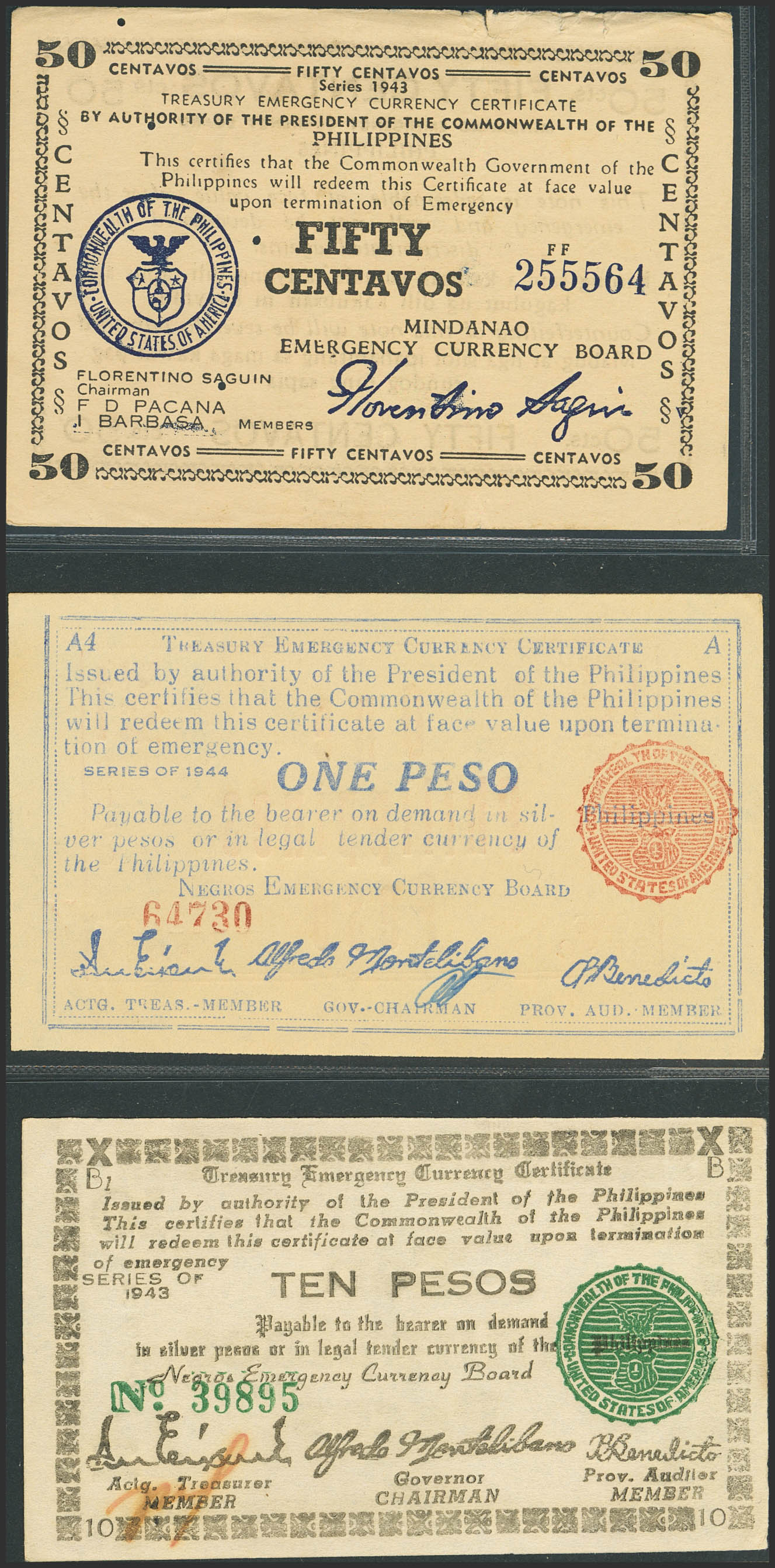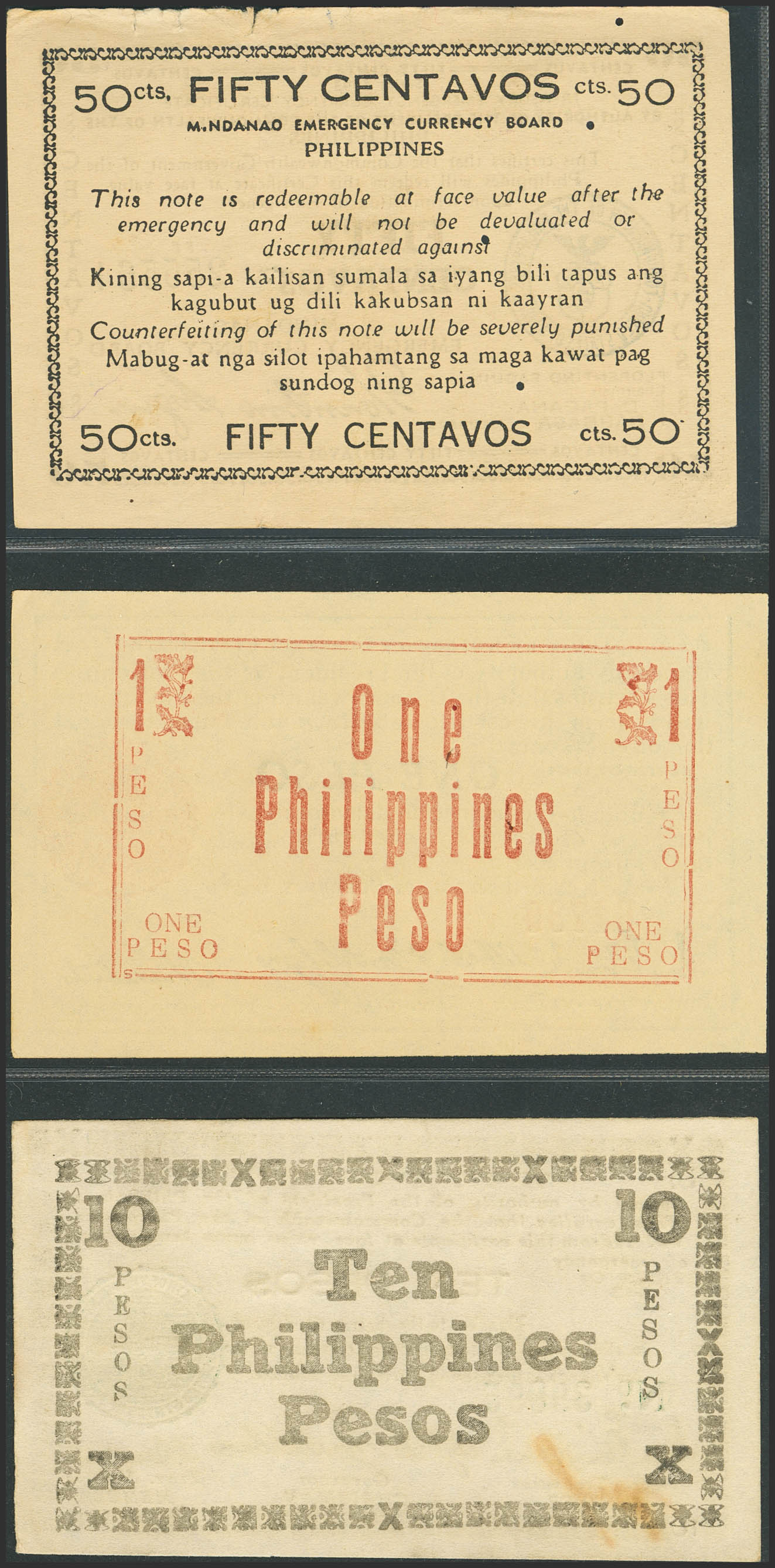 PHILIPPINES. Lot of 3 notes of 50 Centavos and 1 and 10 Pesos. 1943 and 1944. Mindanao Emergency Currency Board and Negros Emergency Currency Board. (Pick: S504, S663, S668a). The 50 Centavos note has tears and 4 pinholes. Less than uncirculated (2) and Extra Fine (1).