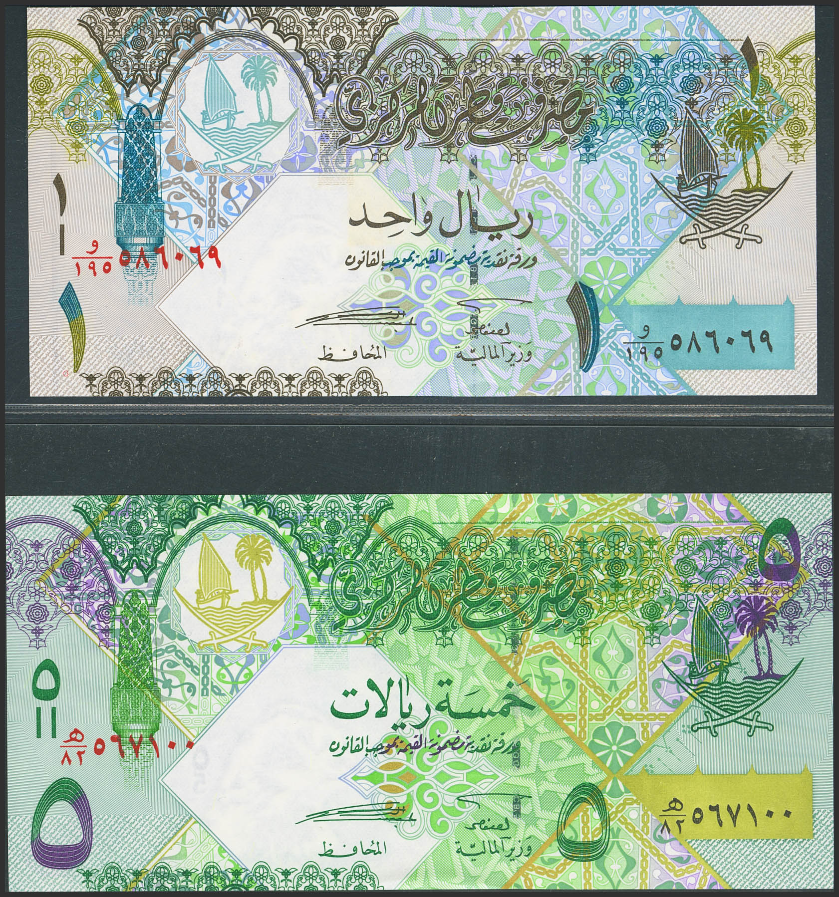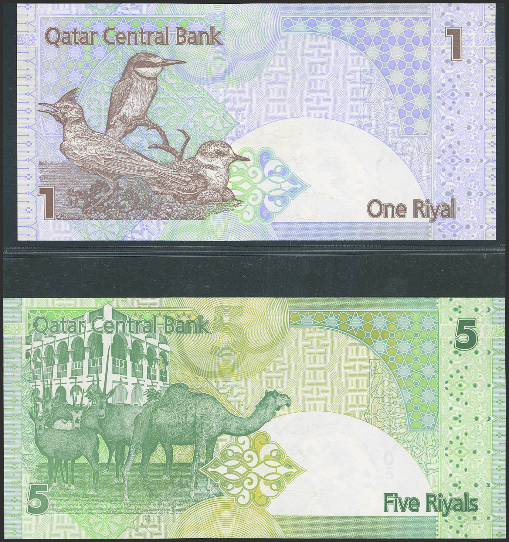 QATAR. Lot of 2 notes of 1 and 5 Riyal. (2008ca). Central Bank. (Pick: 28, 29). Uncirculated.