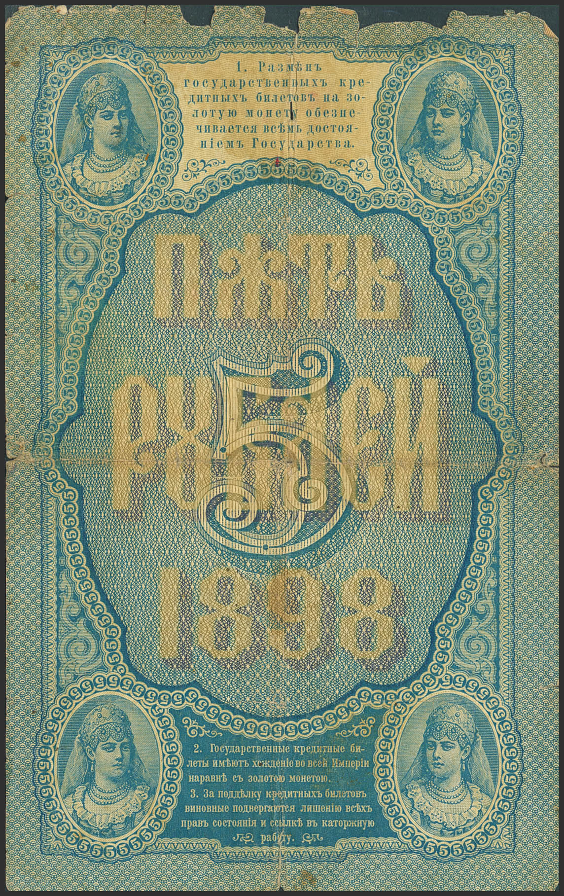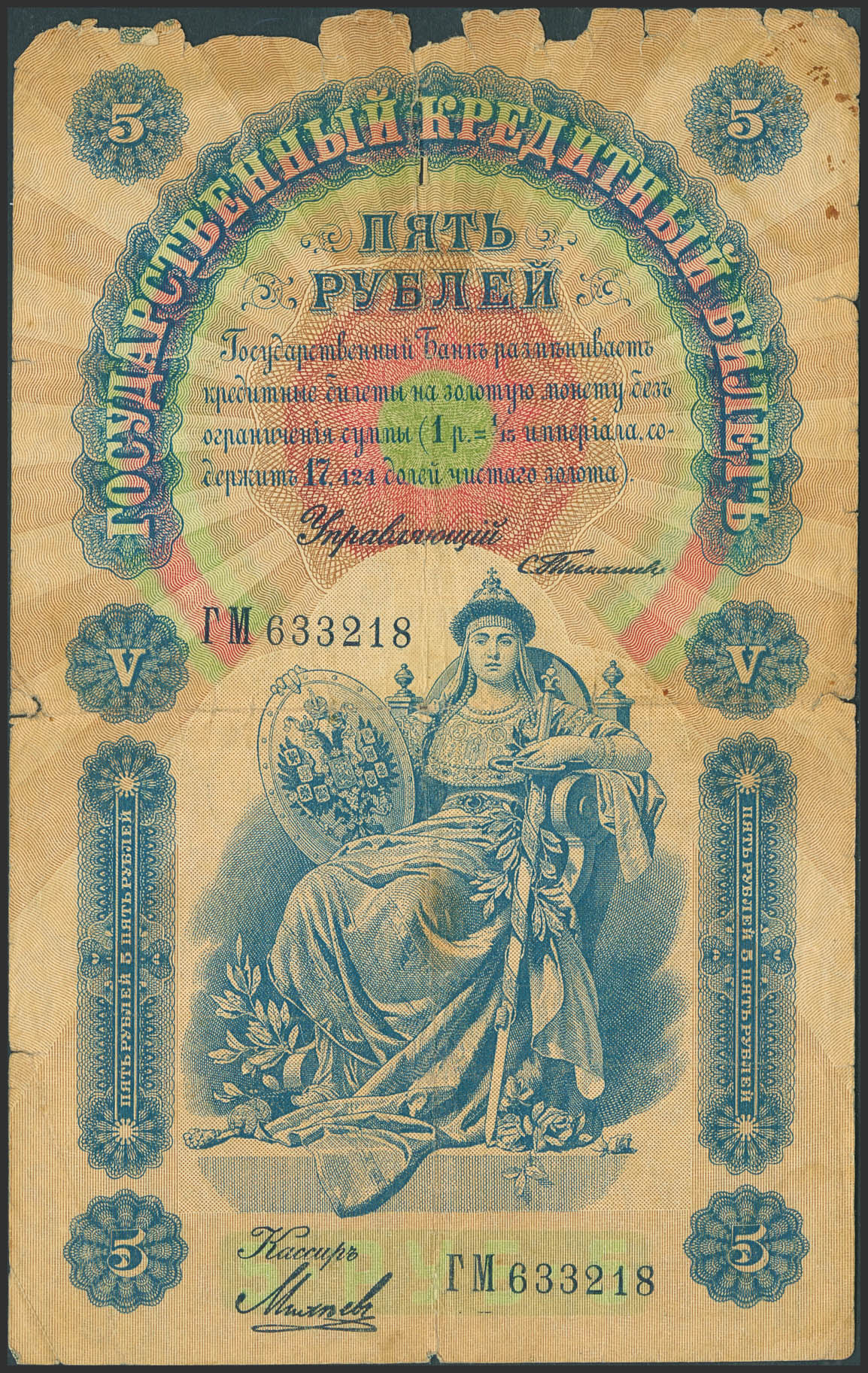 RUSSIA-EMPIRE. 5 Rubley. 1898. Gosudarstvenniy Bank. Signatures of Timashev and Mikheyev. (Pick: 3b). Pieces missing from the margins, tears and pinholes. Fine.