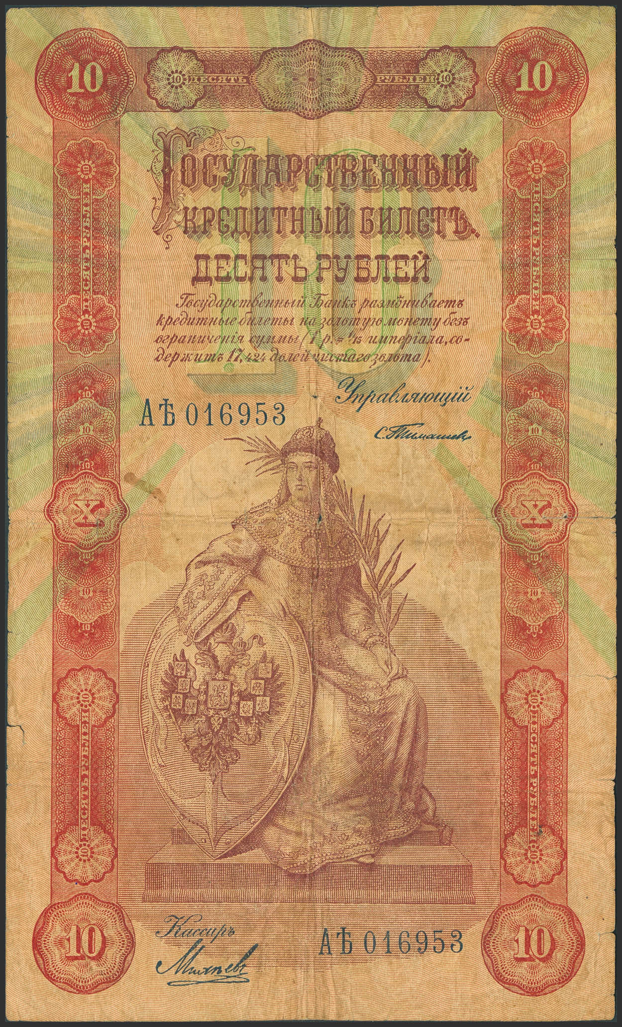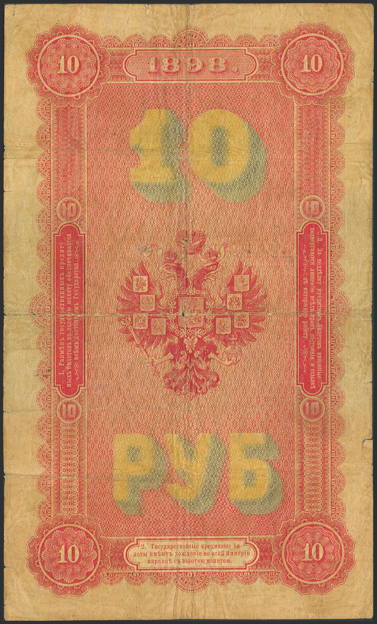 RUSSIA-EMPIRE. 10 Rubles. 1898. Gosudarstvenniy Bank. (Pick: 4b). Fine, pinholes, tears.