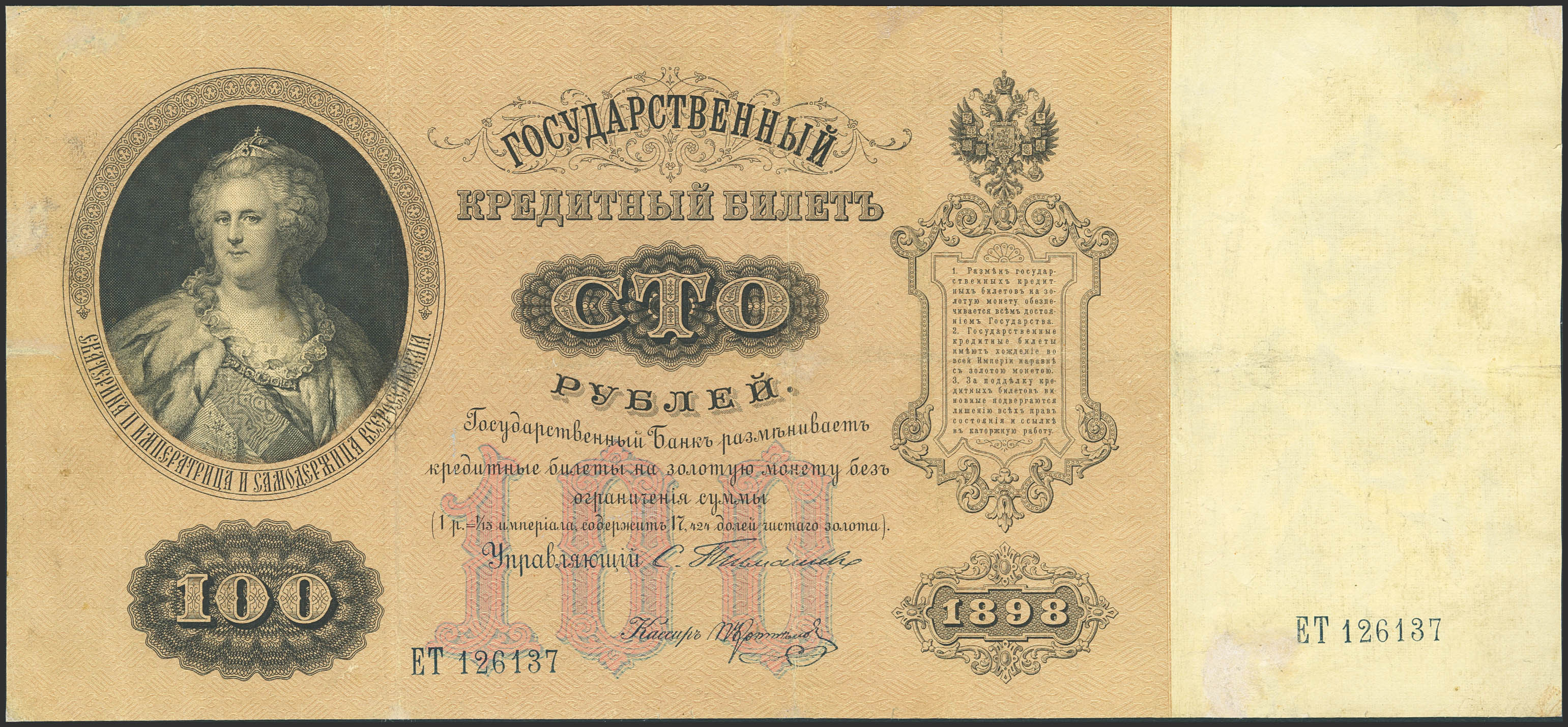 RUSSIA-EMPIRE. 100 Rubley. 1898. Gosudarstvenniy Bank. Timashev and Koptelov. (Pick: 5b). Very Fine, restored.