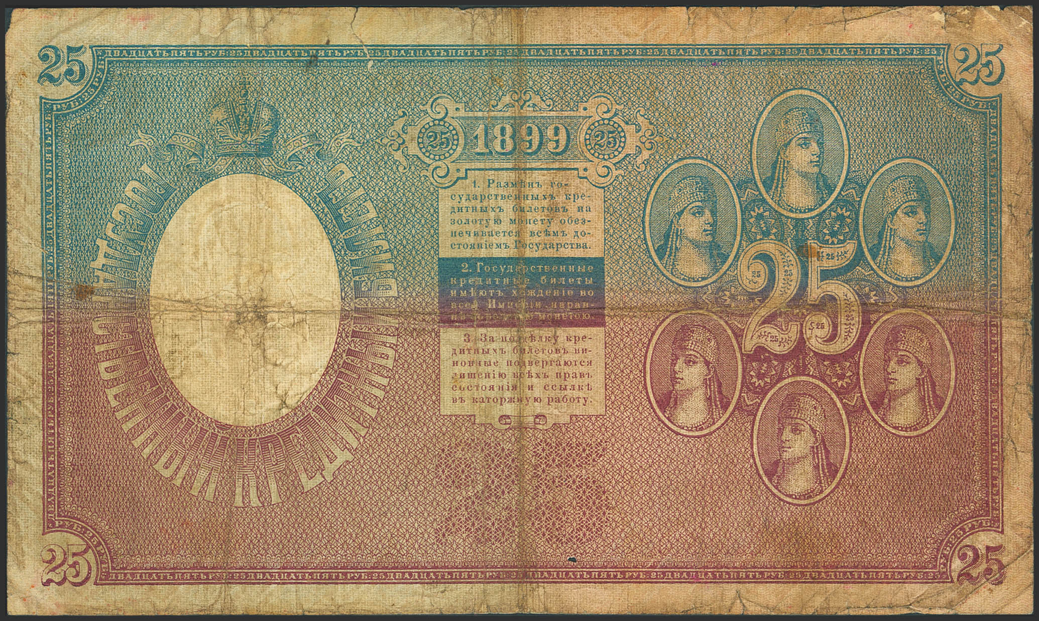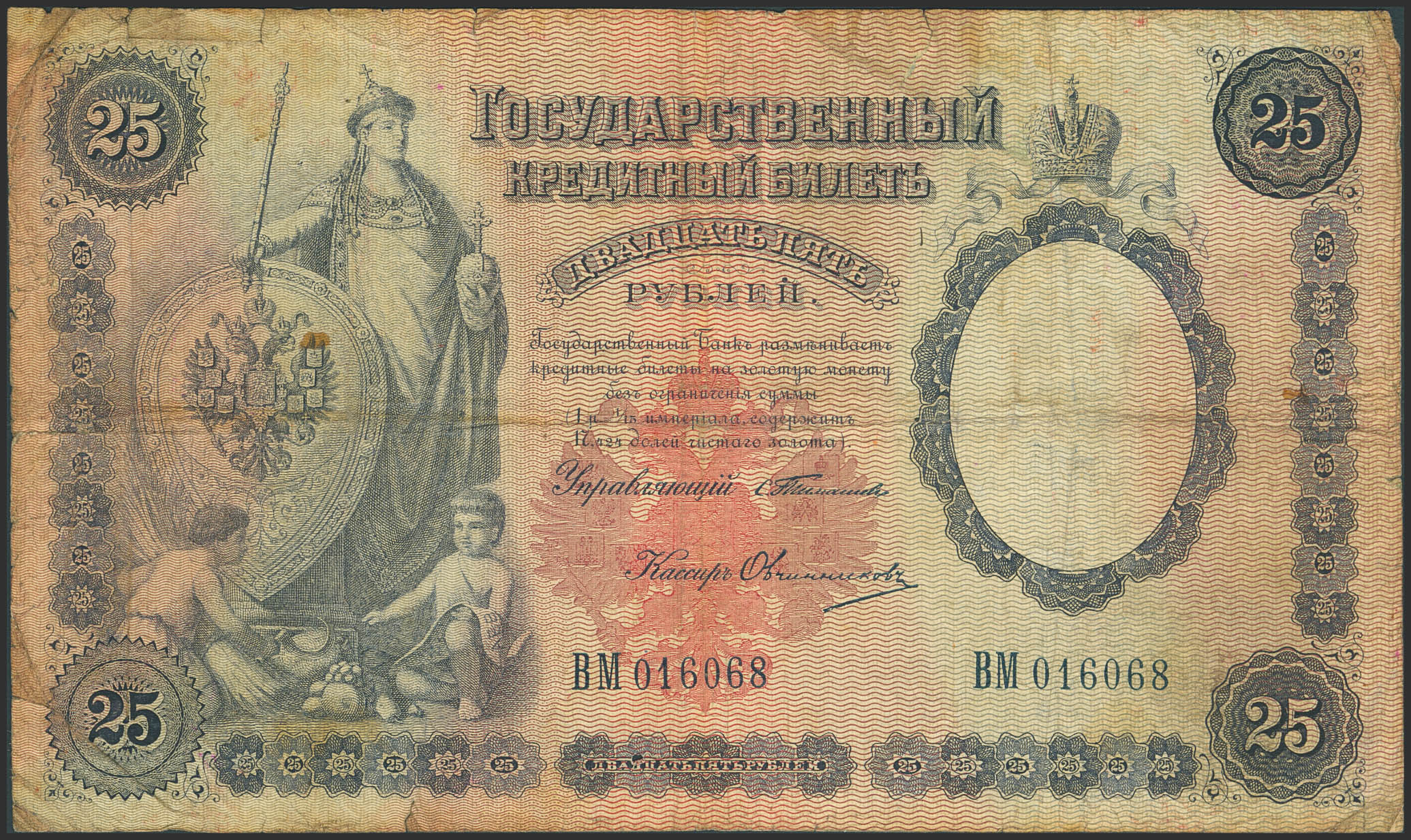 RUSSIA-EMPIRE. 25 Rubles. 1899. Gosudarstvenniy Bank. Timashev and Ovchinnikov. (Pick: 7b). Fine, pinholes, tears.