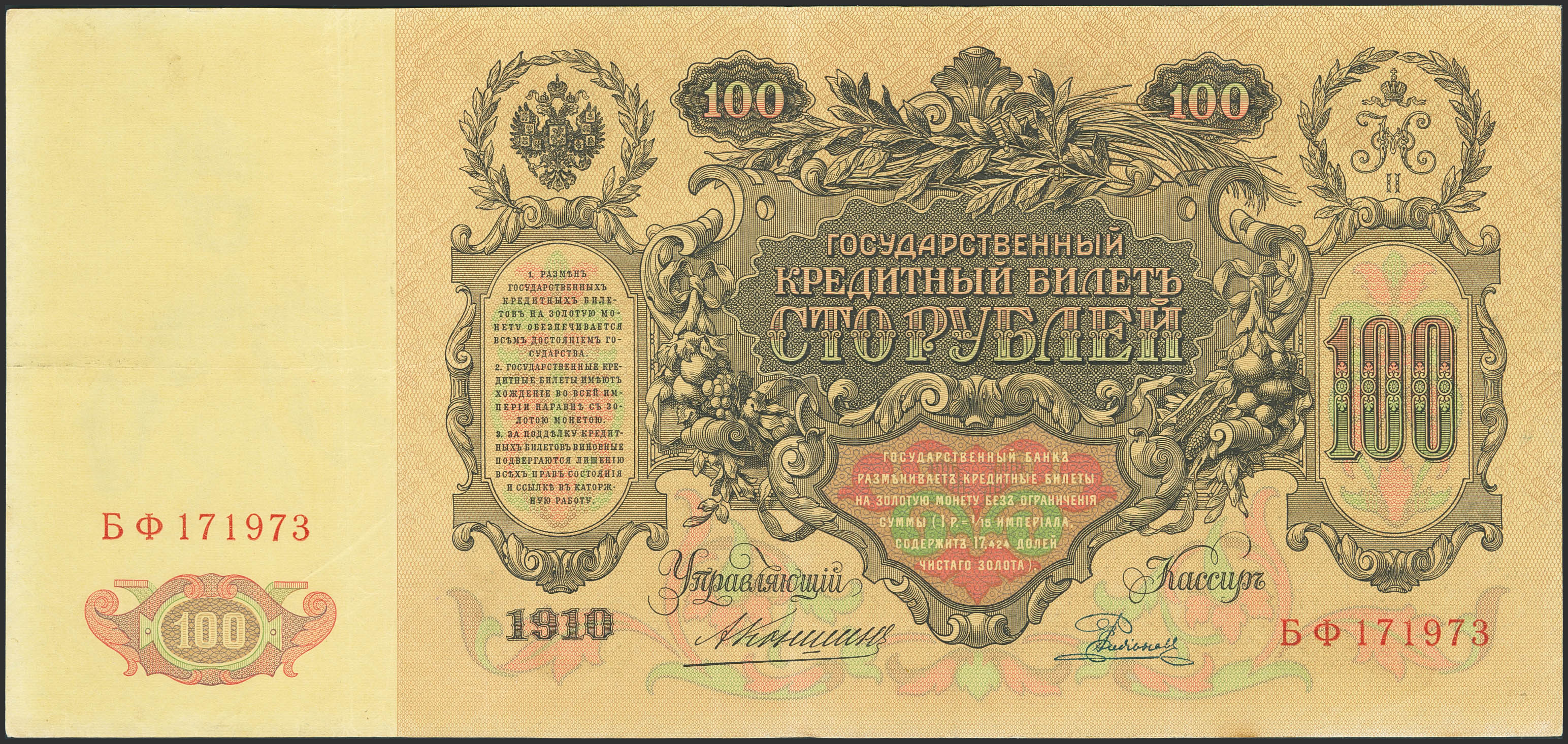 RUSSIA-EMPIRE. 100 Rubley. 1910. Gosudarstvenniy Bank. Konshin and Rodyonov. (Pick: 13a). Extremely Fine.