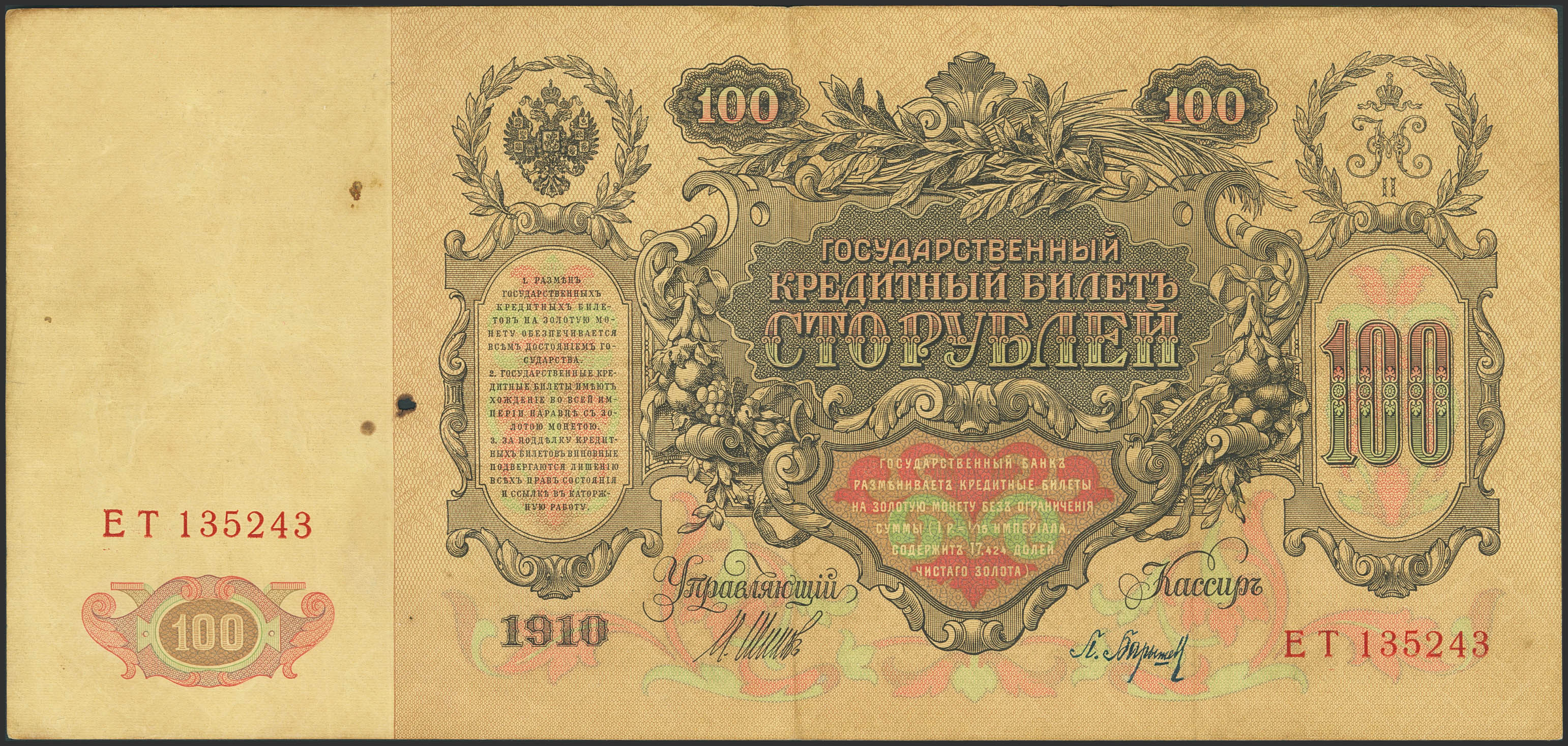RUSSIA-EMPIRE. 100 Rubley. 1910. Gosudarstvenniy Bank. Shipov and Baryshev. (Pick: 13b). Very Fine, pinholes, hole.