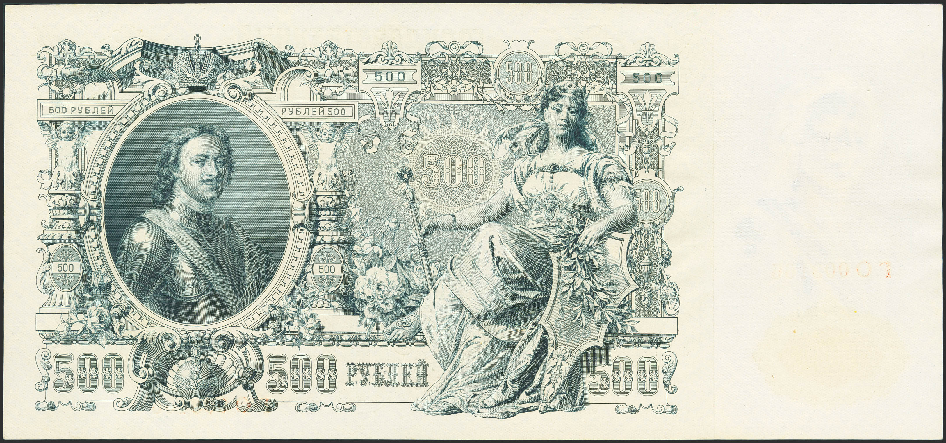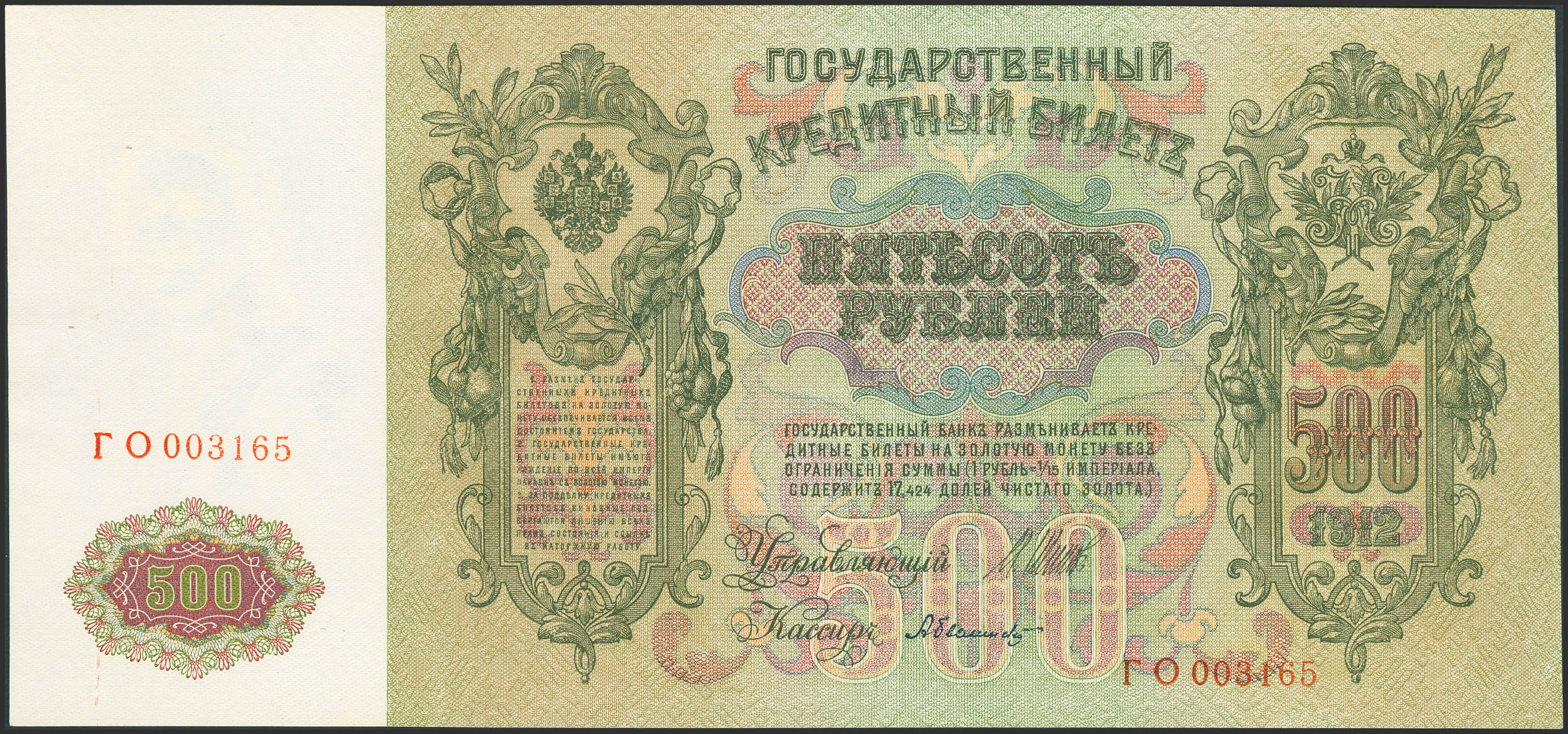 RUSSIA-EMPIRE. 500 Rubley. 1912. Gosudarstvenniy Bank. Shipov and Bylinskiy. (Pick: 14b). Less than Uncirculated.