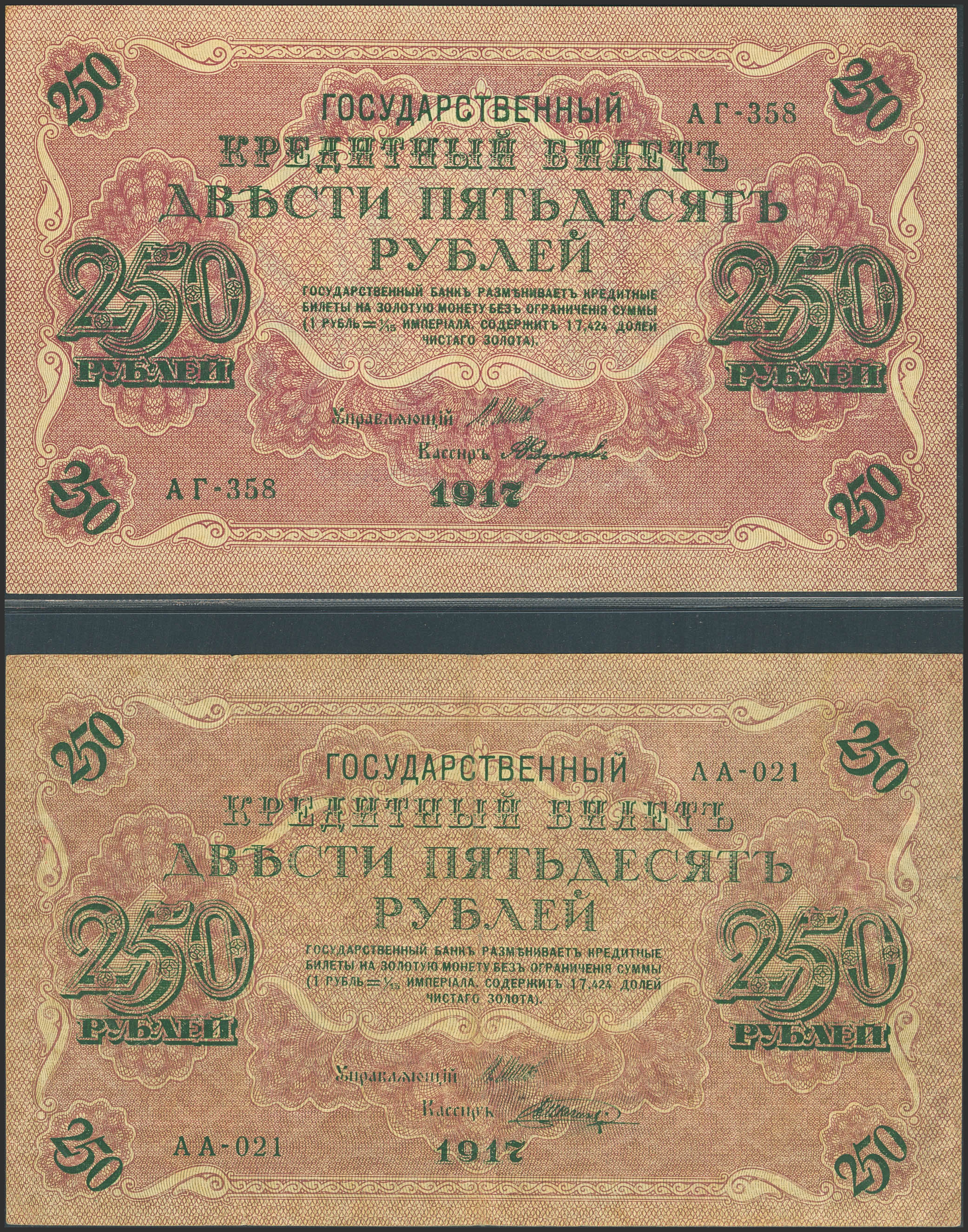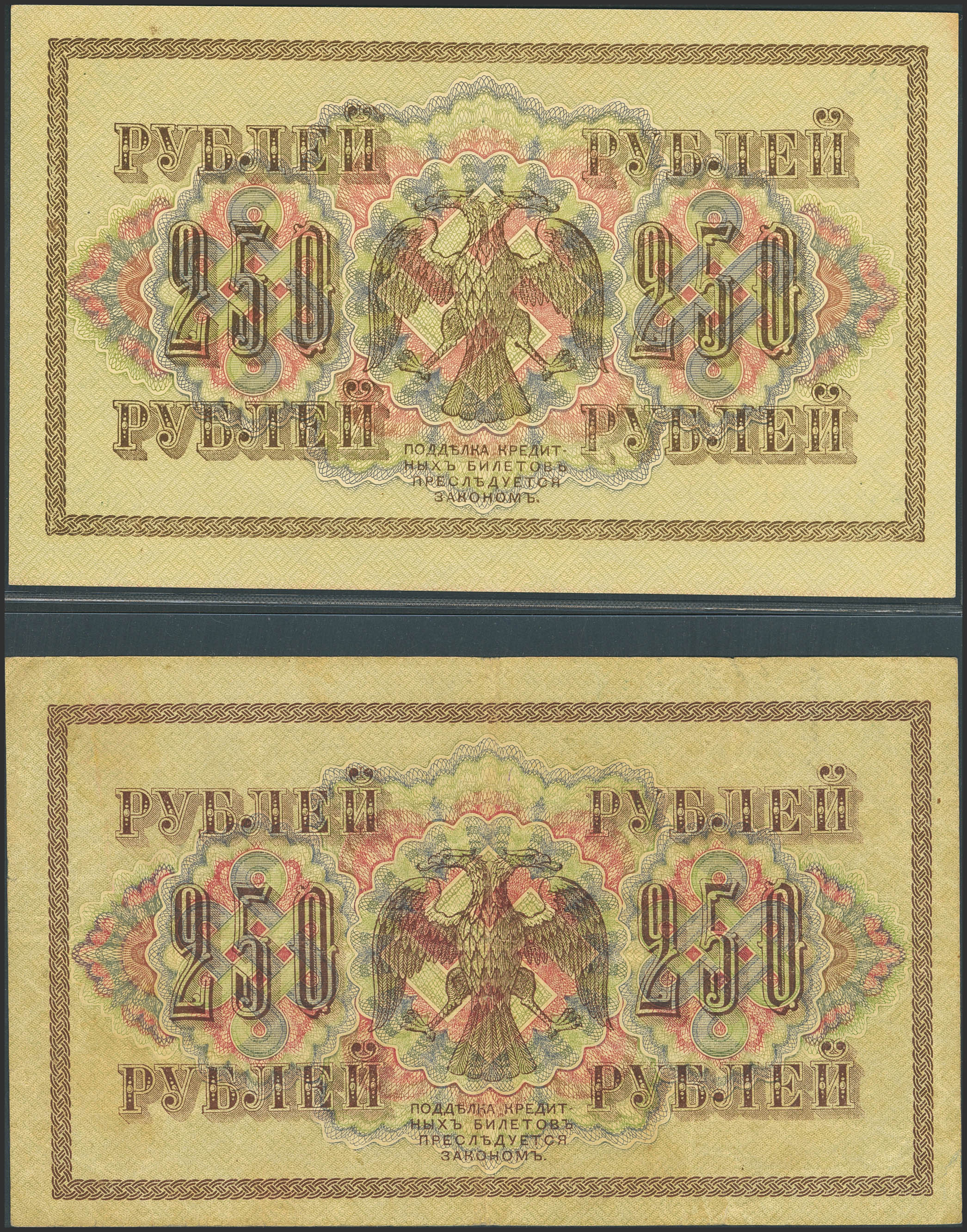 RUSSIA-PROVISIONAL GOVERNMENT. Lot of 2 notes of 250 Rubles. 1917. Gosudarstvenniy Bank. Different signatures. (Pick: 36). Almost Uncirculated and Very Fine.