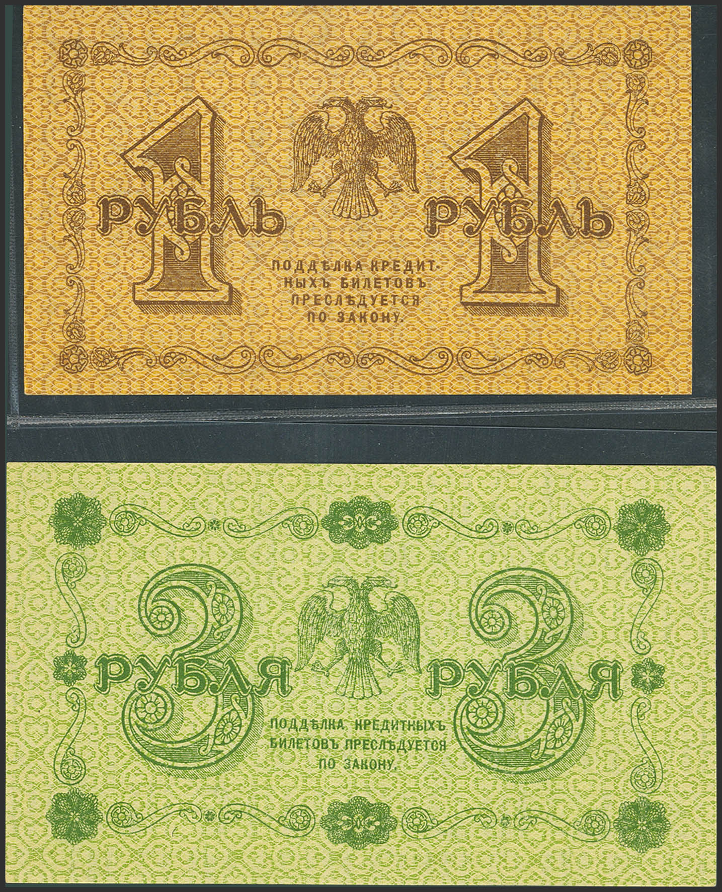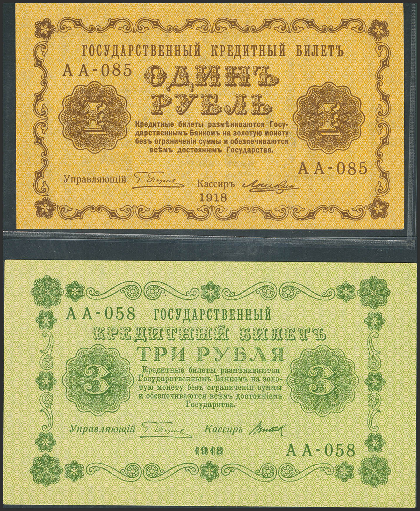 RUSSIA-RSFSR. Lot of 2 notes of 1 and 3 Rublya. 1918. Gosudarstvenniy Bank. (Pick: 86a, 87). Uncirculated and Less than Uncirculated.