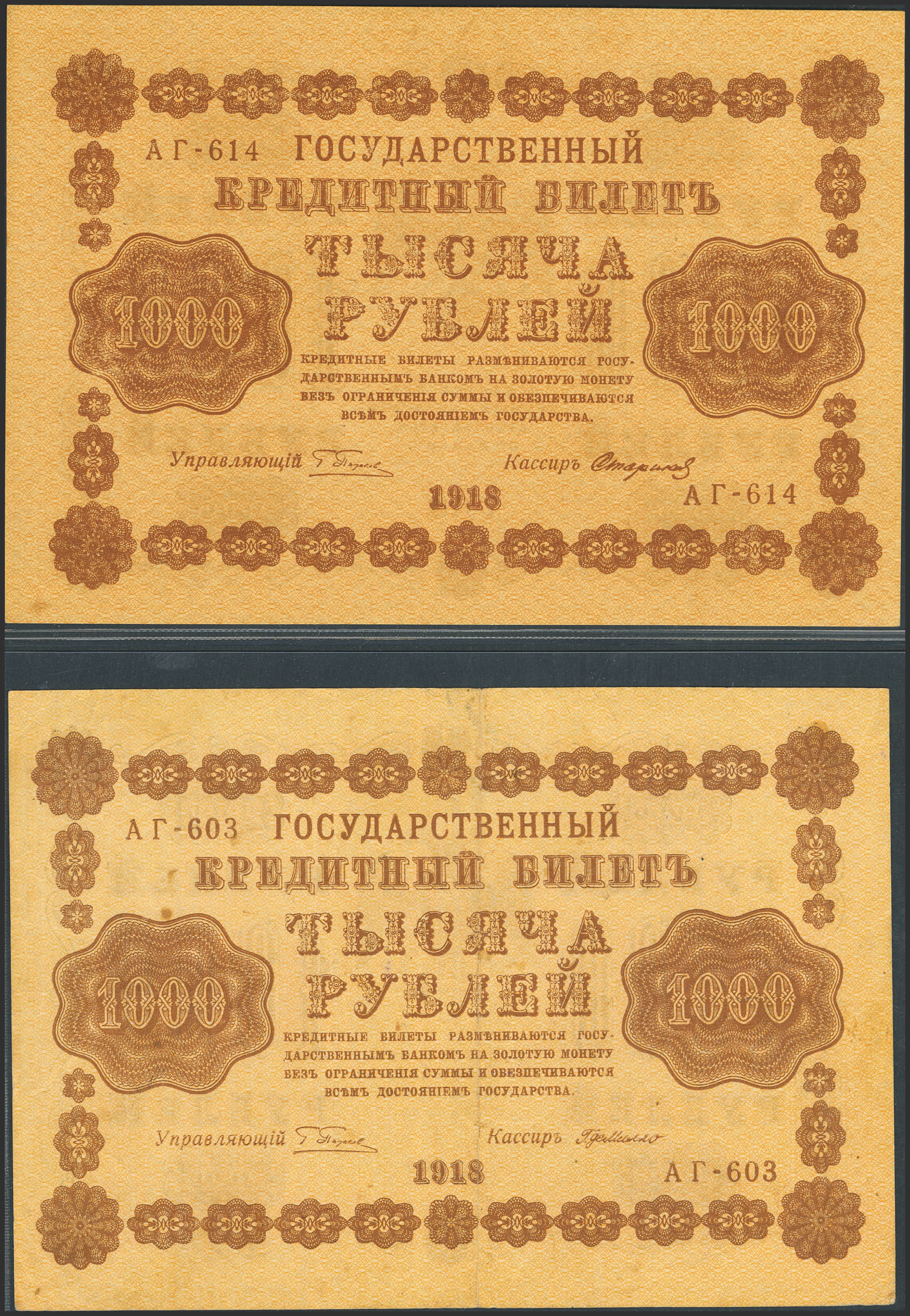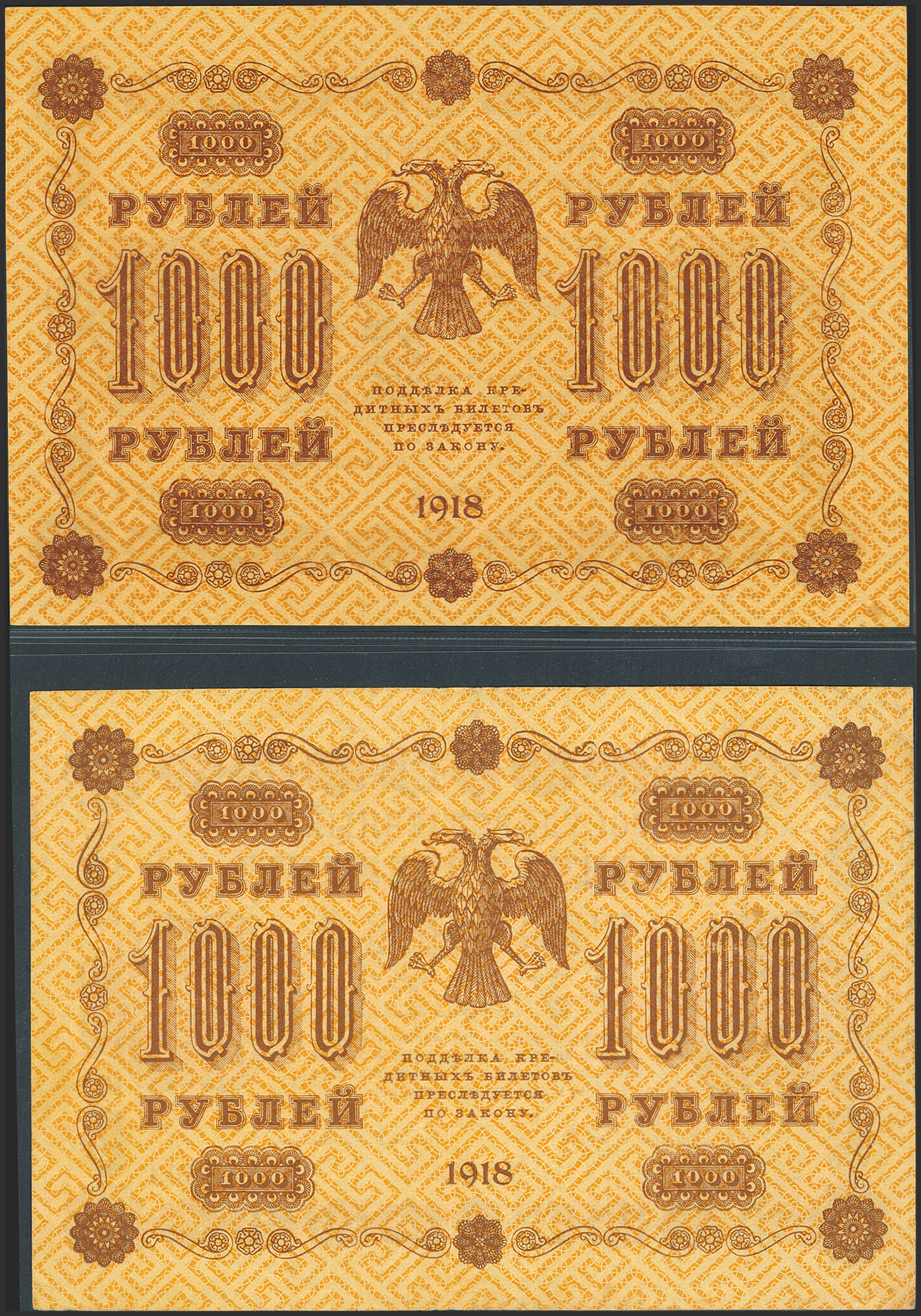 RUSSIA-RSFSR. Lot of 2 notes of 1000 Rubley. 1918. Gosudarstvenniy Bank. De Millo and Starikov. (Pick: 95). More than Very Fine and Almost Uncirculated.