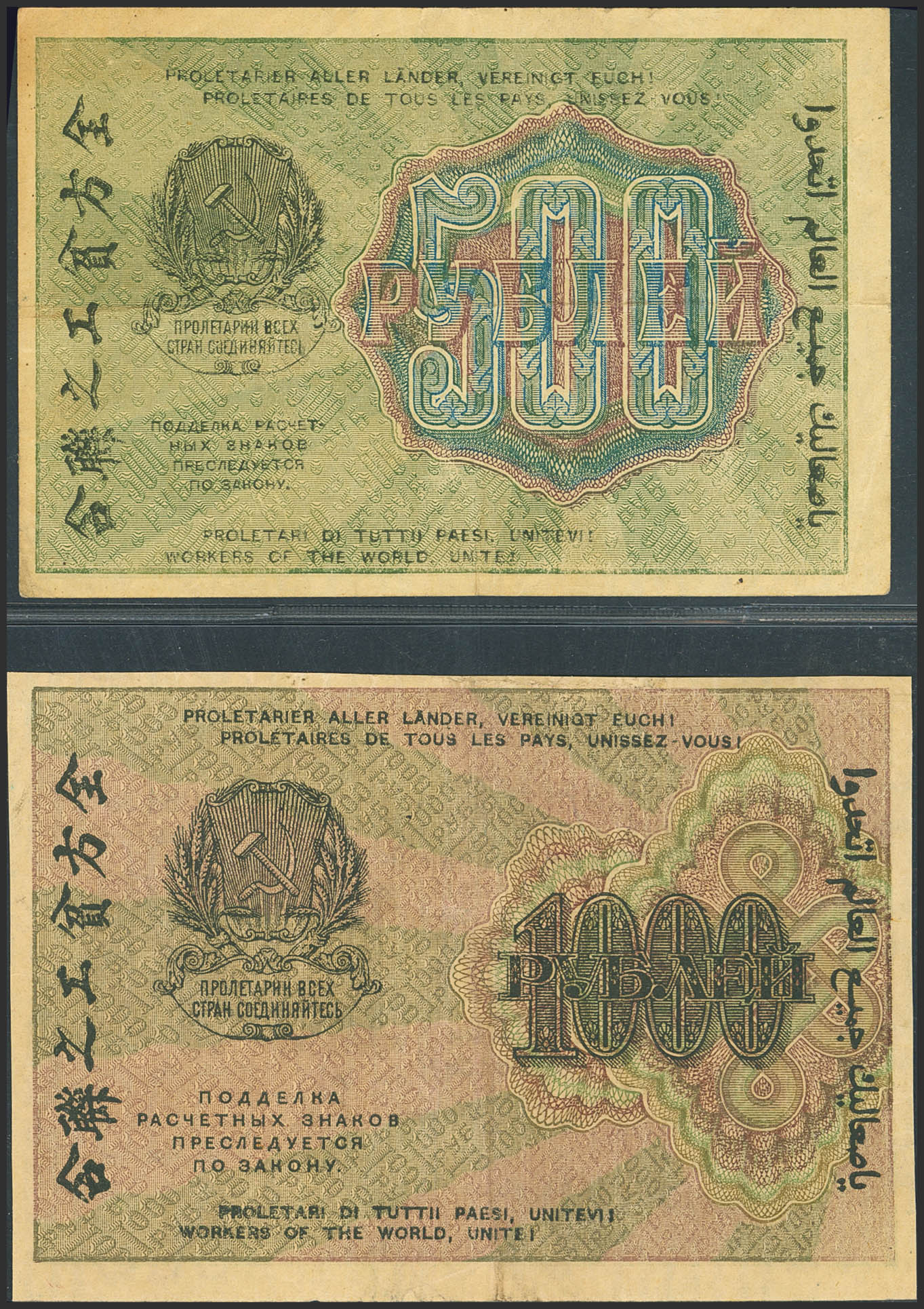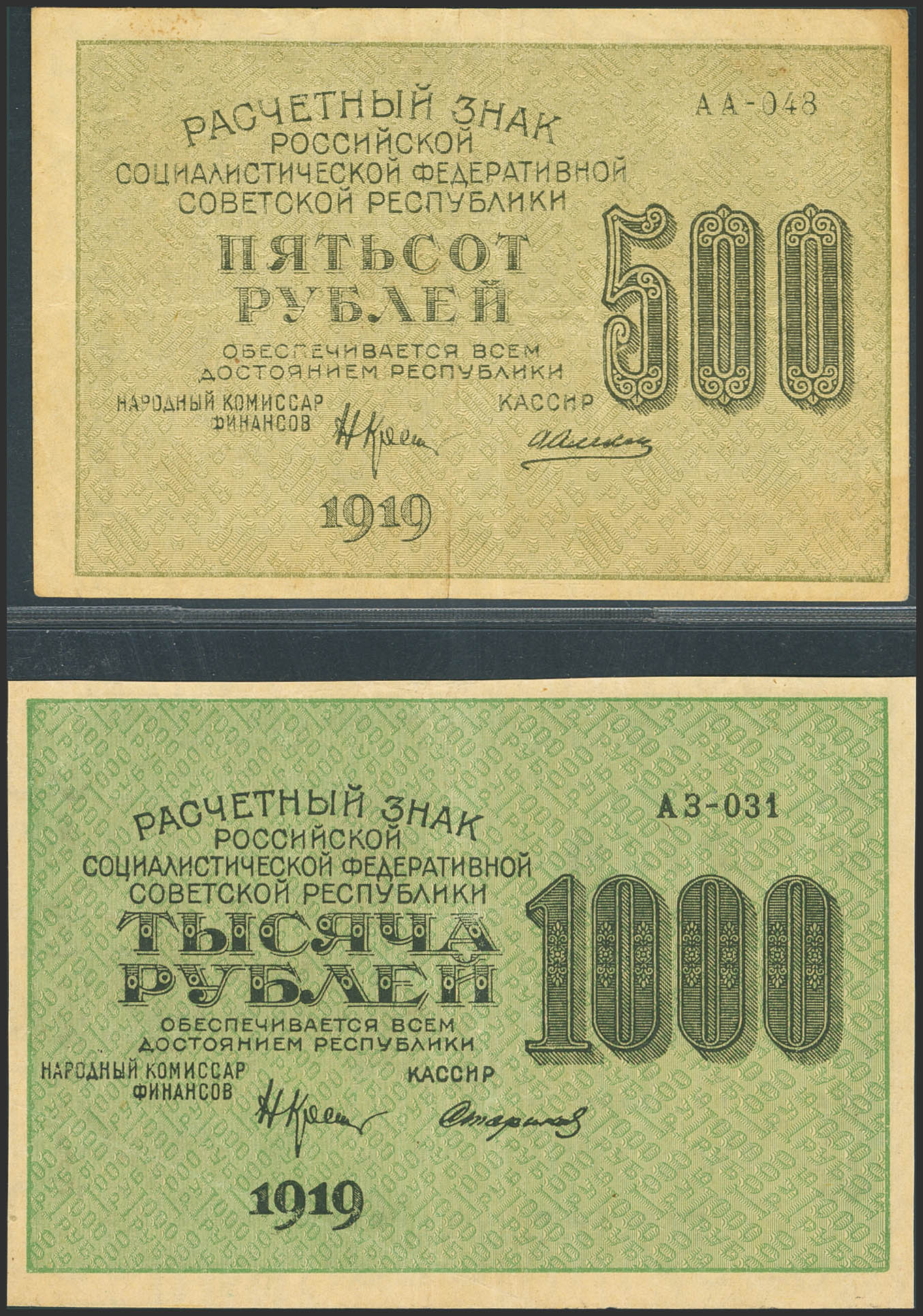 RUSSIA-RSFSR. Lot of 2 notes of 500 and 1000 Rubles. 1919. Narodniy Komissariat Finantsov. (Pick: 103a, 104a). More than Very Fine and More than Extremely Fine.