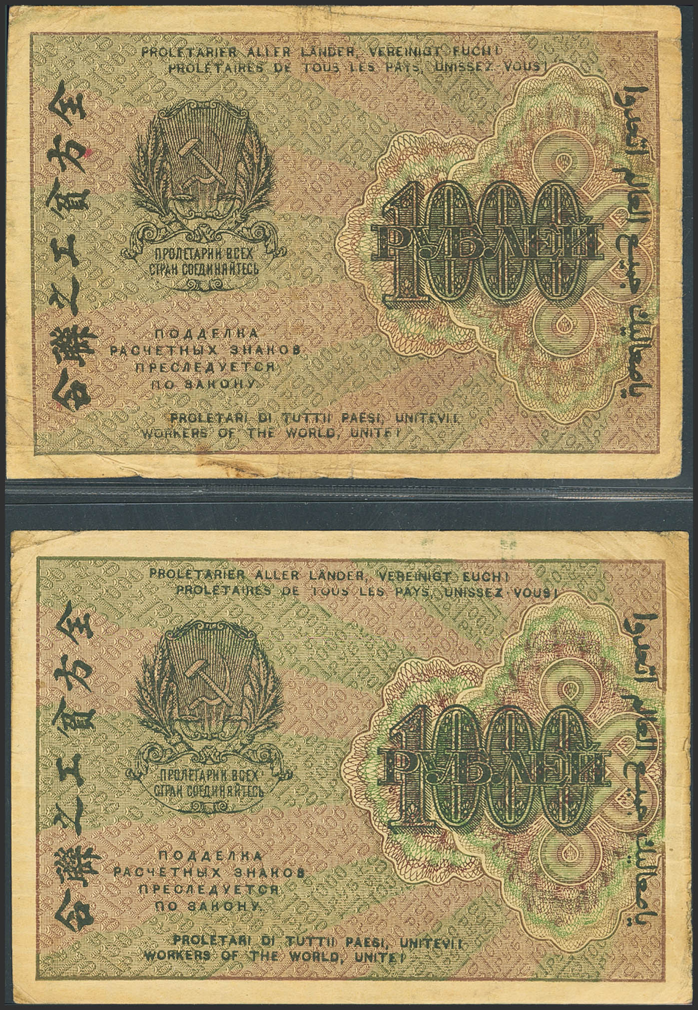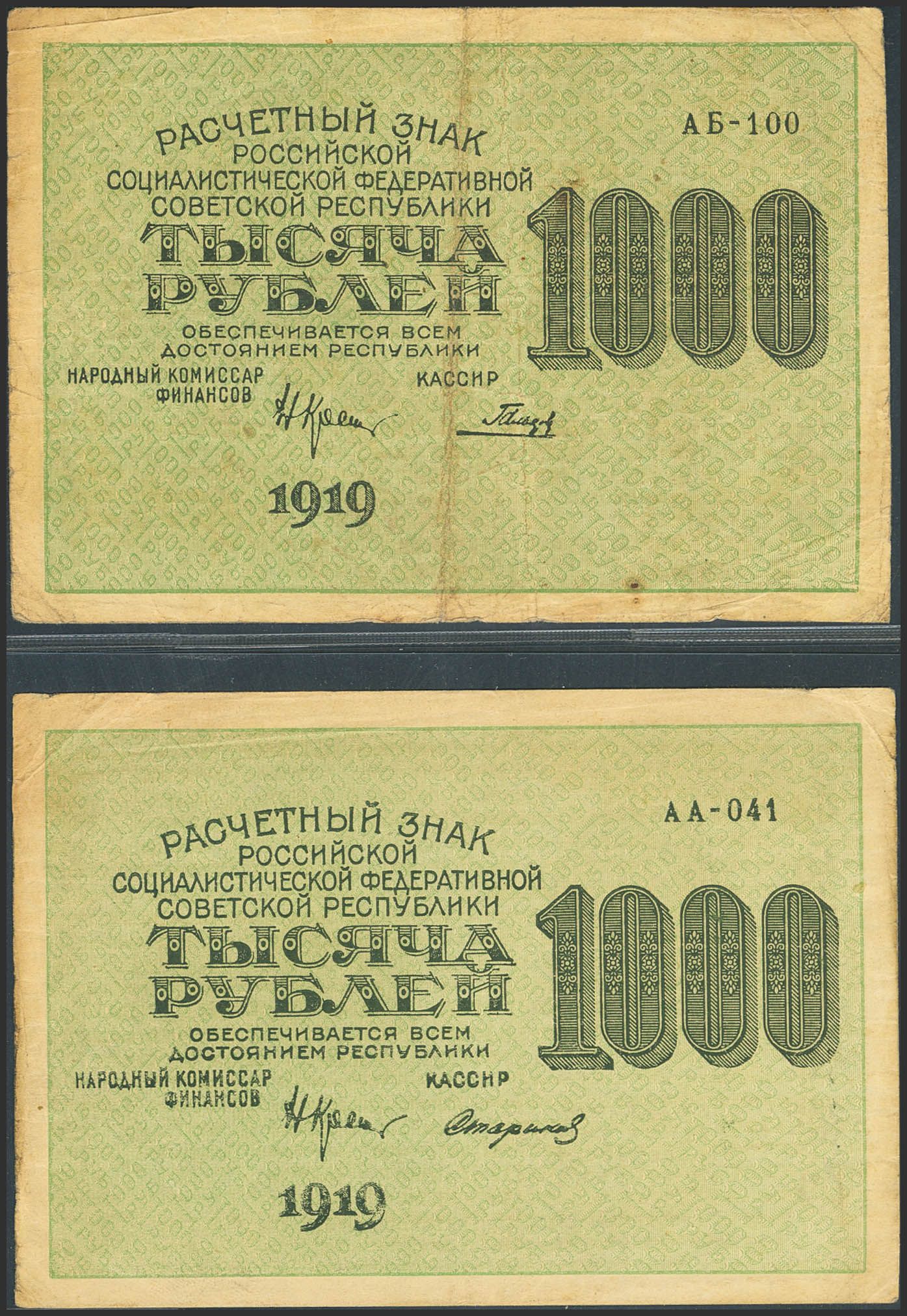 RUSSIA-RSFSR. Lot of 2 notes of 1000 Rubles. 1919. Narodniy Komissariat Finantsov. (Pick: 104c, 104e). Very Fine and More than Extremely Fine.
