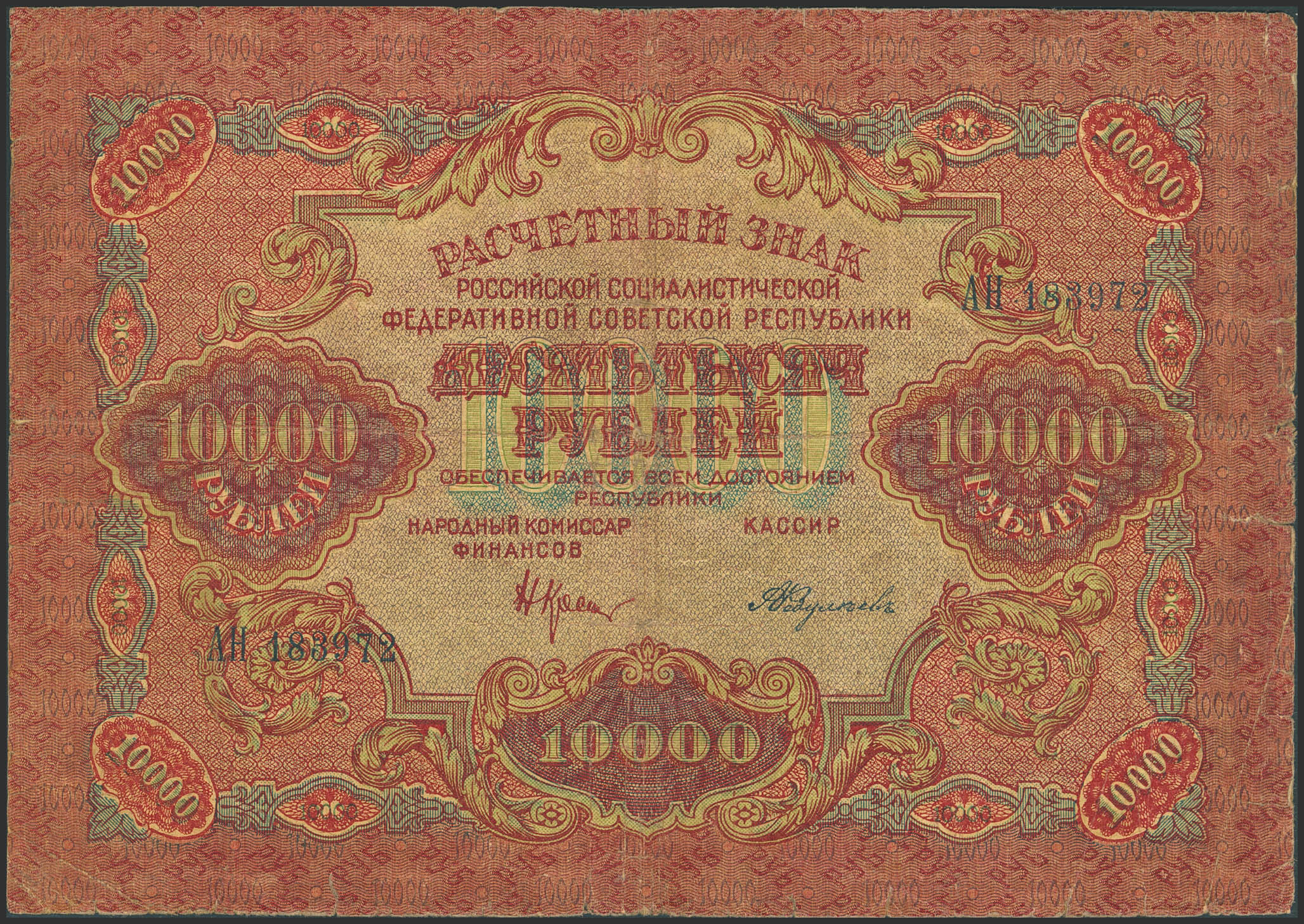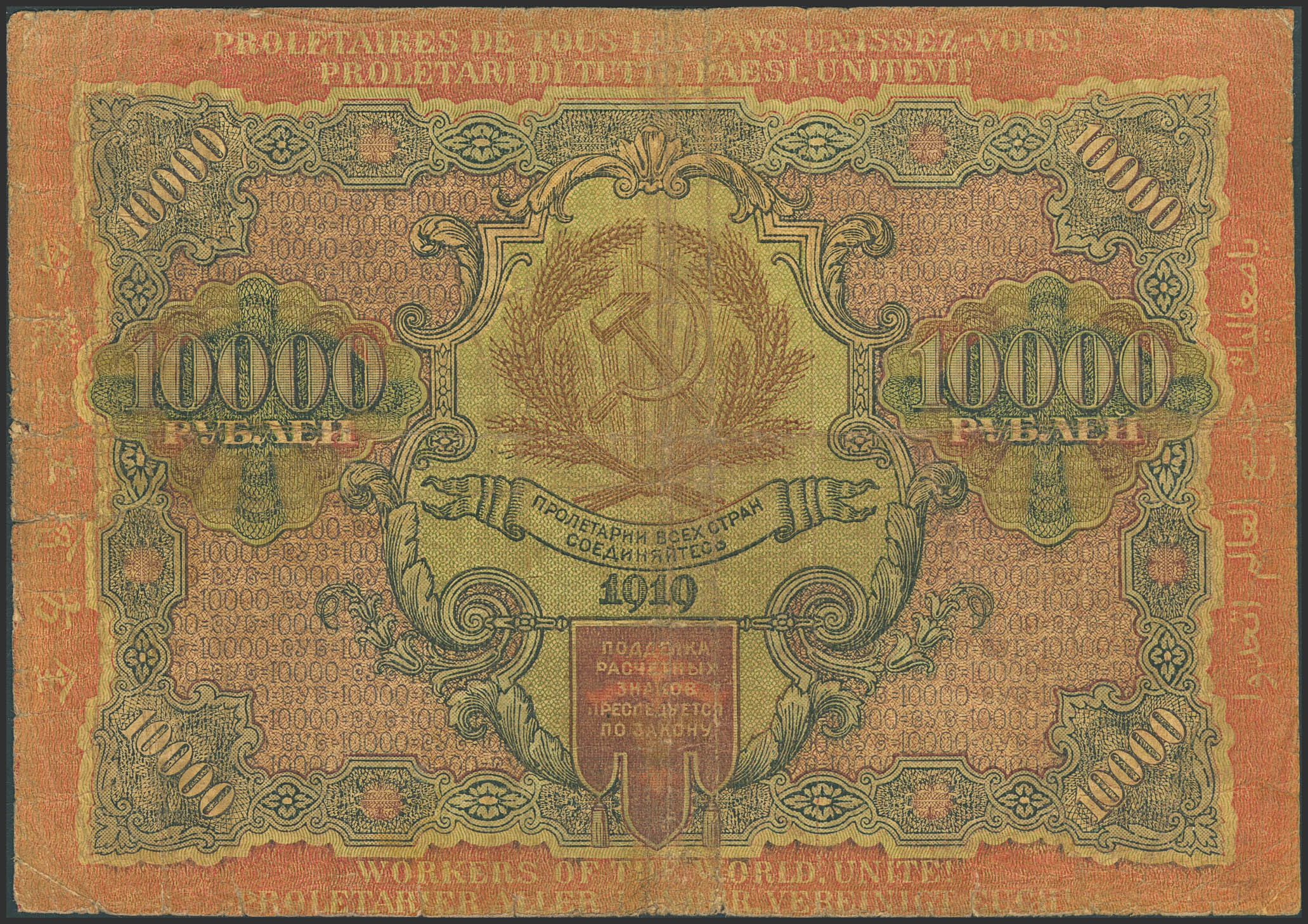 RUSSIA-RSFSR. 10000 Rubley. 1919. Narodnniy Komissariat Finantsov. Feduleyev. (Pick: 106a). Fine, pinholes, tears.