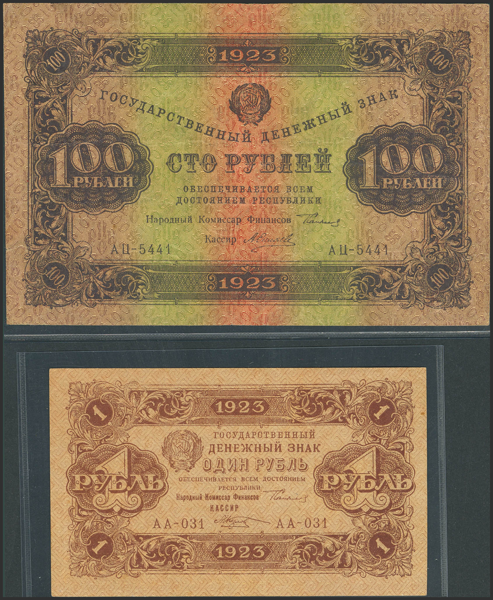 RUSSIA-RSFSR. Lot of 2 notes of 1 and 100 Rubles. 1923. Narodniy Komissariat Finantsov. (Pick: 163, 168). Very Fine and More than Extremely Fine.