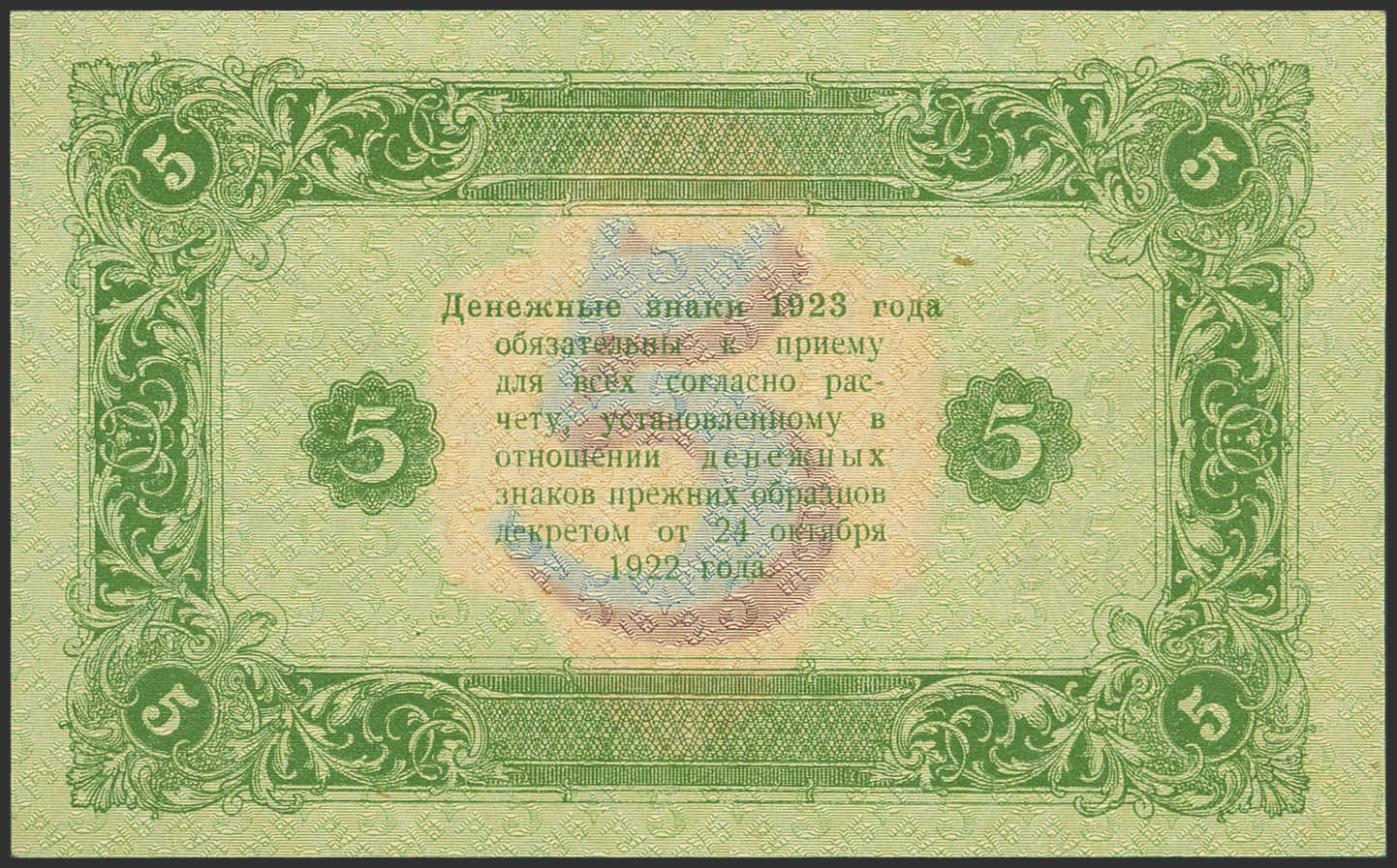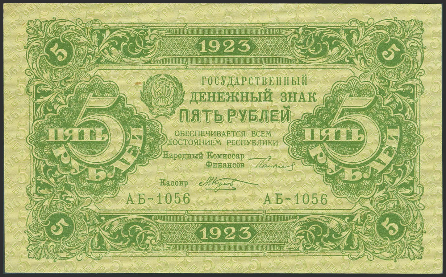 RUSSIA-RSFSR. 5 Rubley. 1923. Narodniy Komissariat Finantsov. Lower signature of Kozlov. (Pick: 164). Almost Uncirculated.