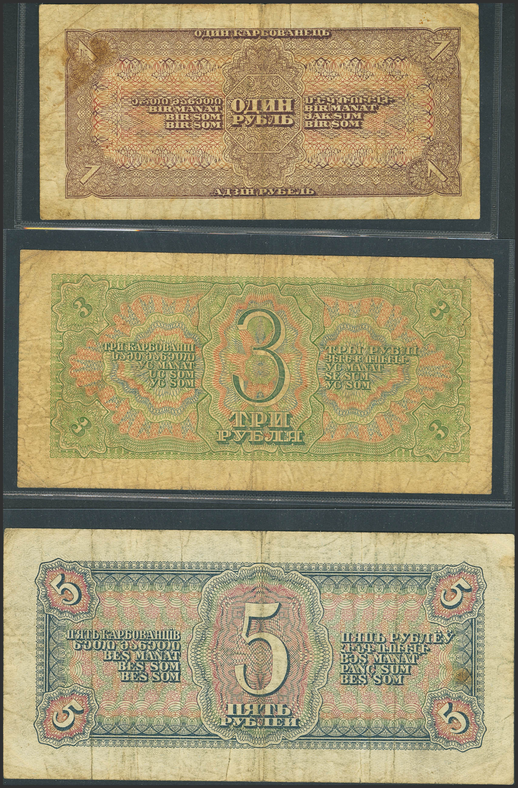 RUSSIA-SOVIET UNION. Lot of 3 notes from 1 at 5 Rubles. 1938. Treasury. (Pick: 213, 214, 215a). More than Fine.