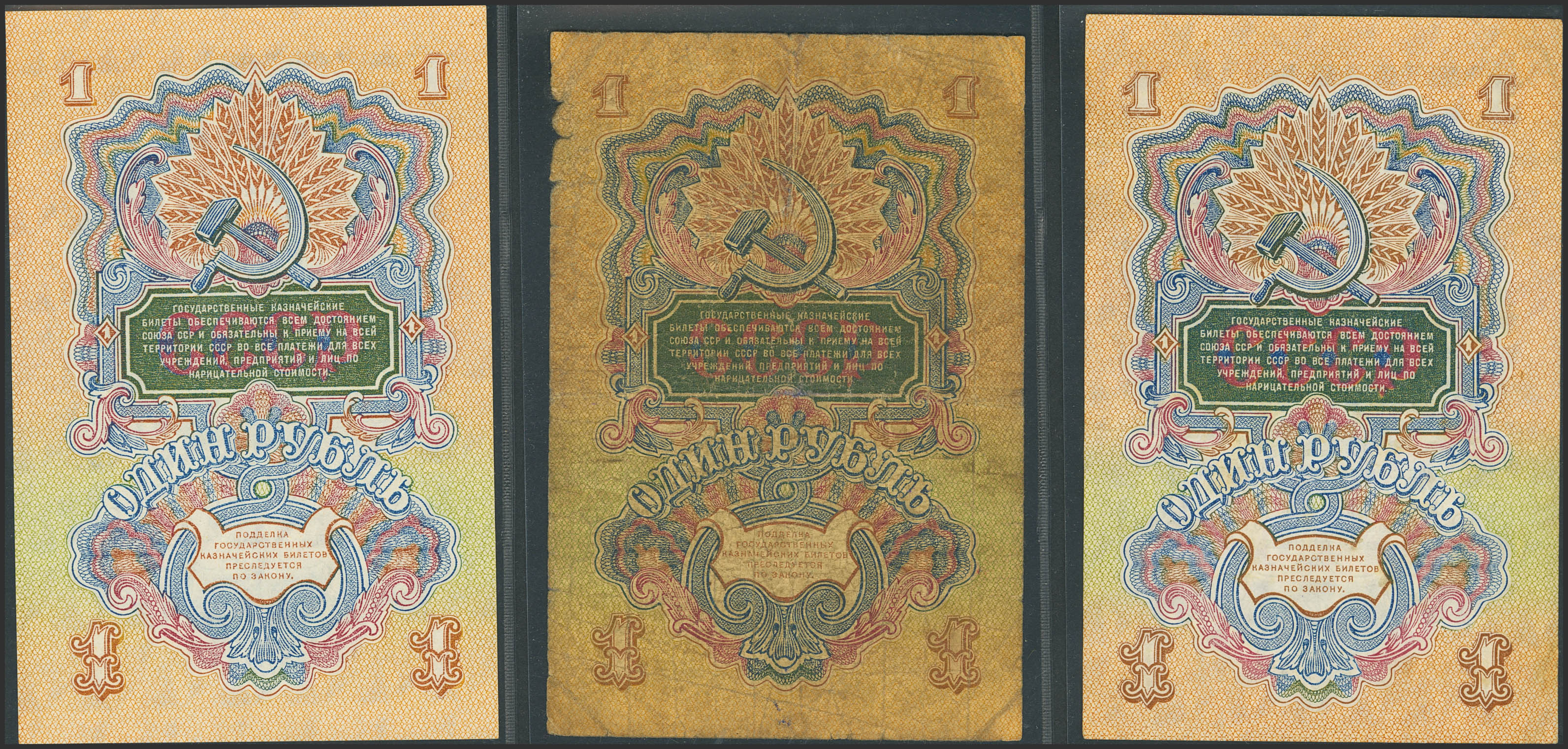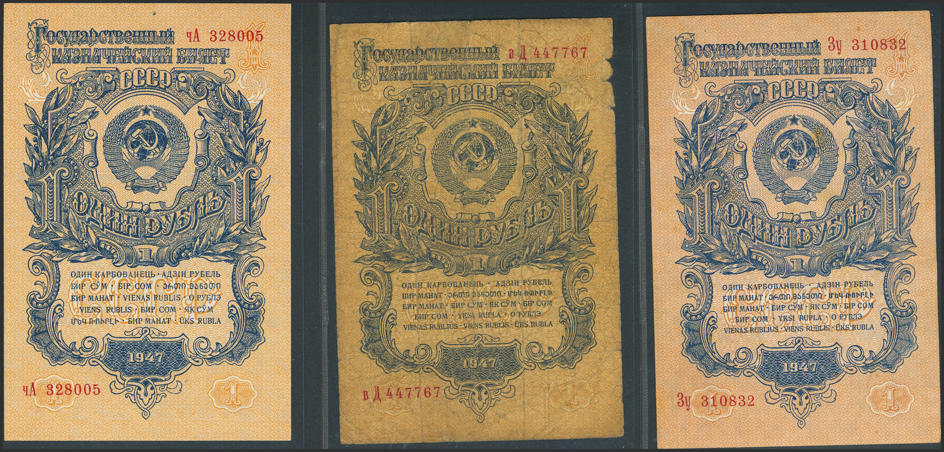 RUSSIA-SOVIET UNION. Lot of 3 notes of 1 Ruble. 1947. Treasury. Arms on front with 8 bands at left (2) and Arms on front with 7 bands at left (1). (Pick: 216, 217). More than Extremely Fine (2) and Fine.