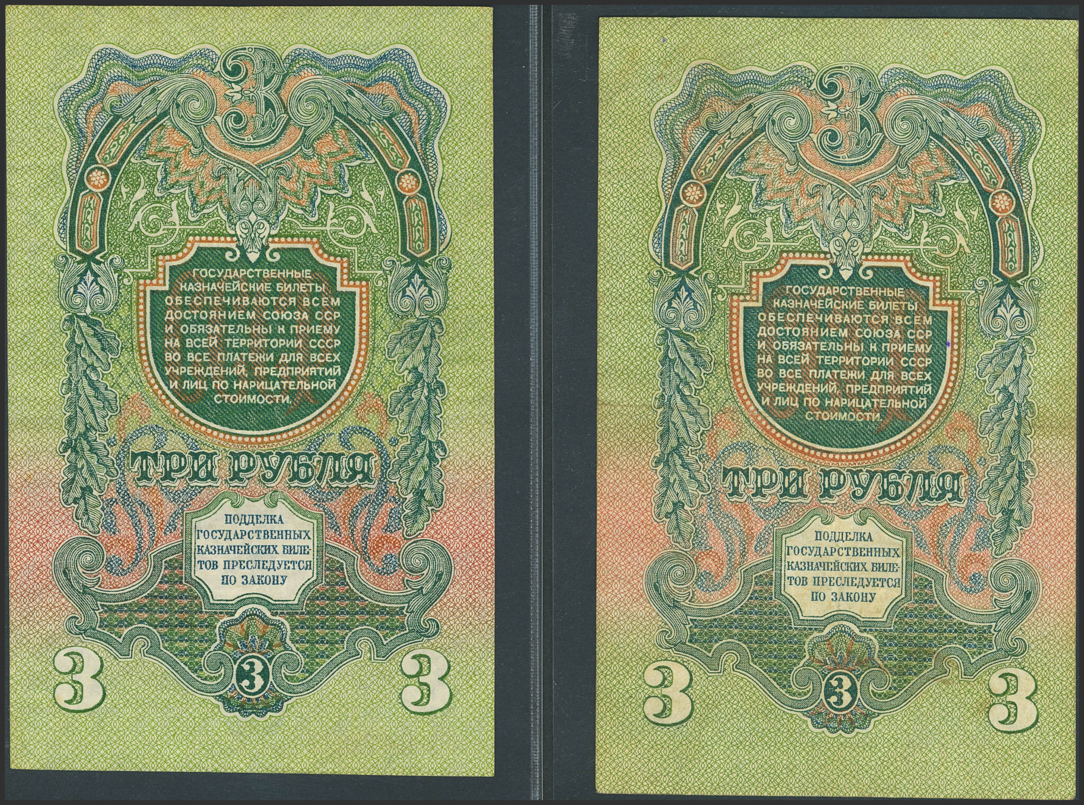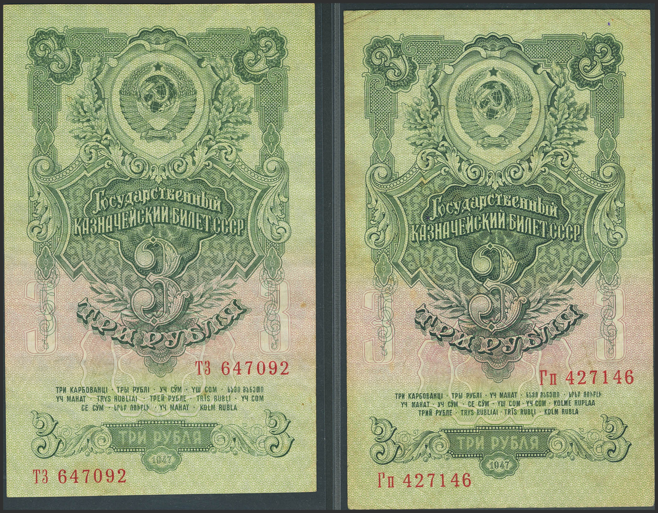 RUSSIA-SOVIET UNION. 3 Rubles. 1947. Treasury. Arms on front with 8 bands at left and Arms on front with 7 bands at left. (Pick: 218, 219). Very Fine.