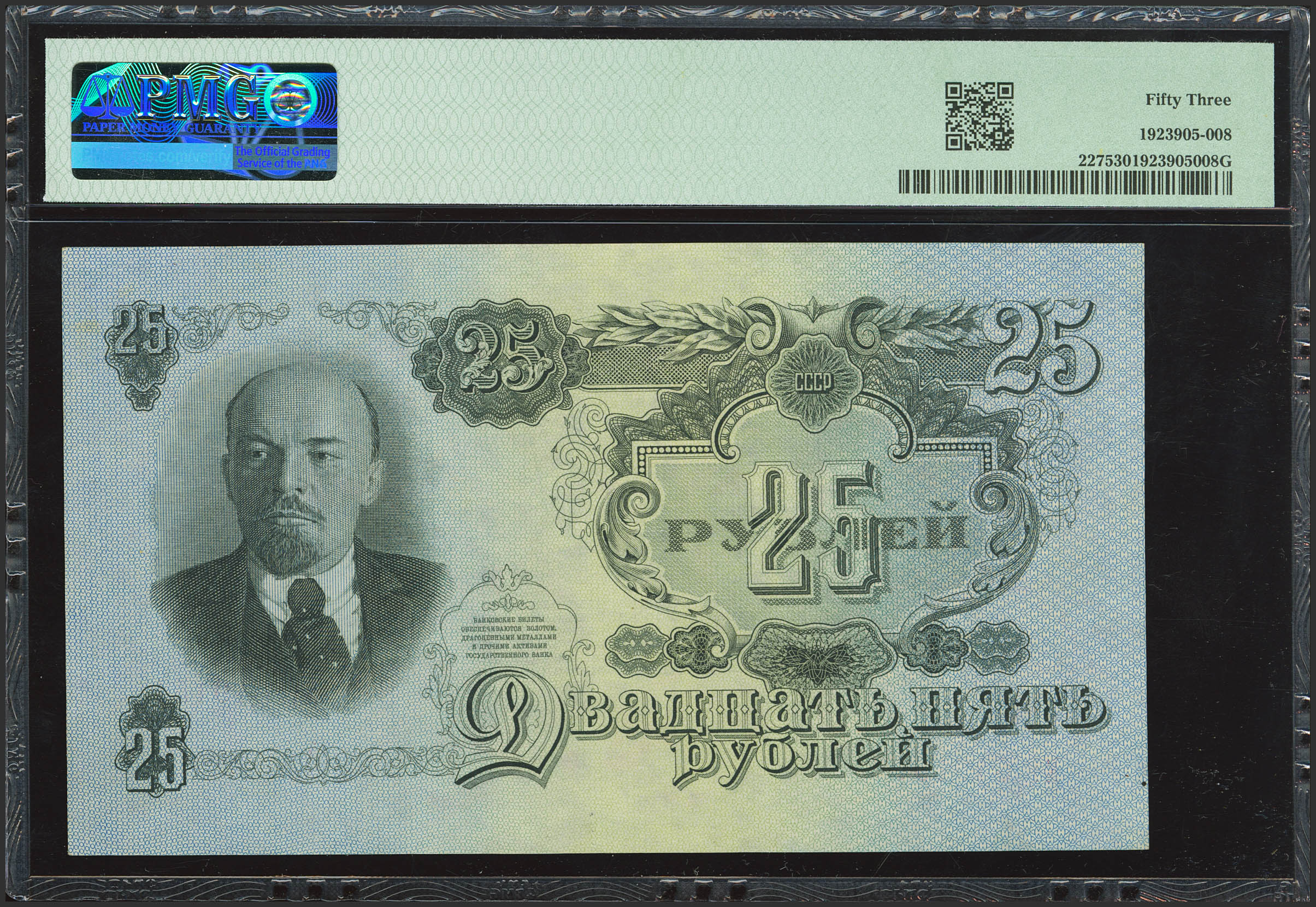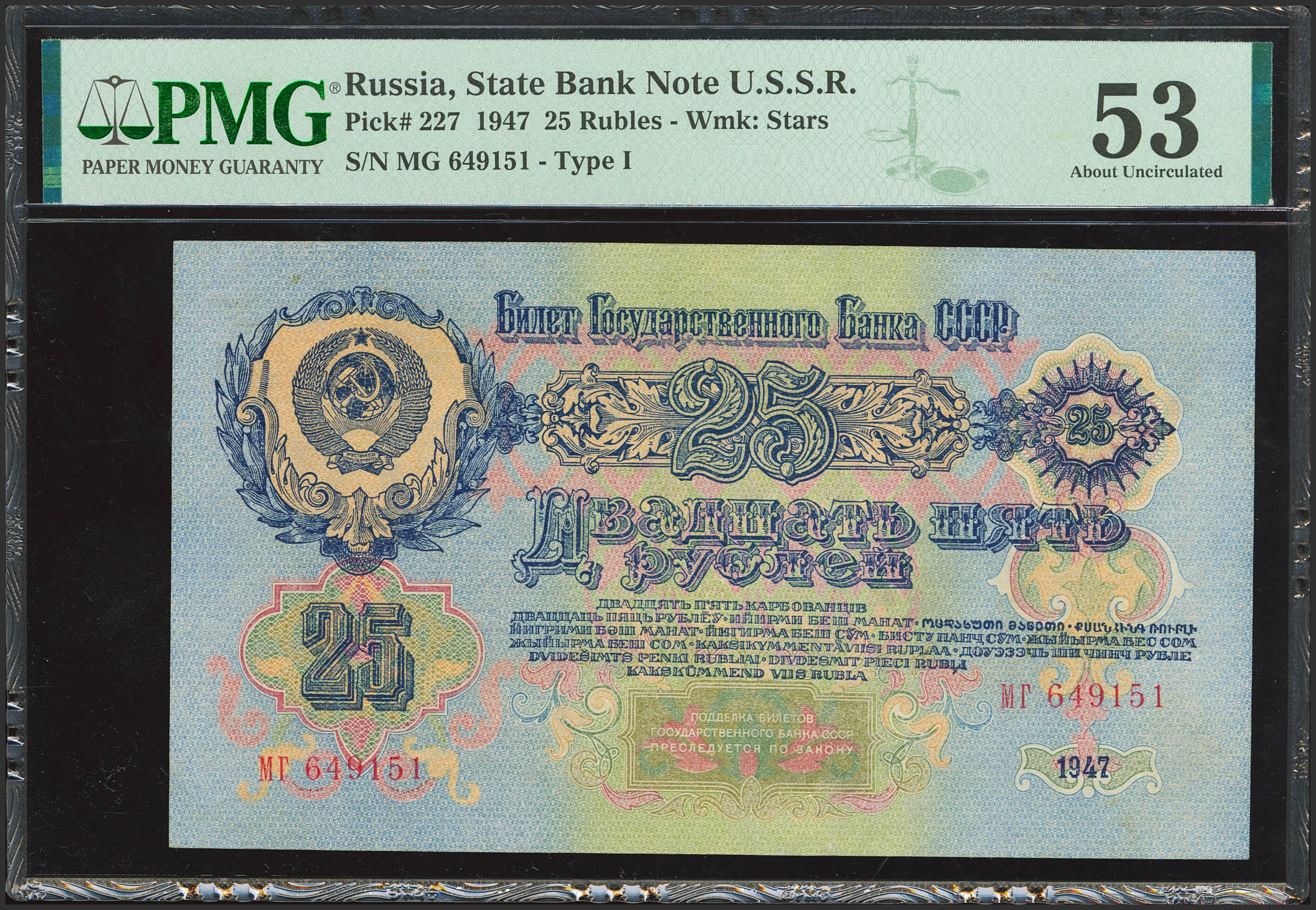 RUSSIA-SOVIET UNION. 25 Rubles. 1947. Gosudarstvenniy Bank SSSR. Arms on front with 8 bands at left. (Pick: 227). PMG53.
