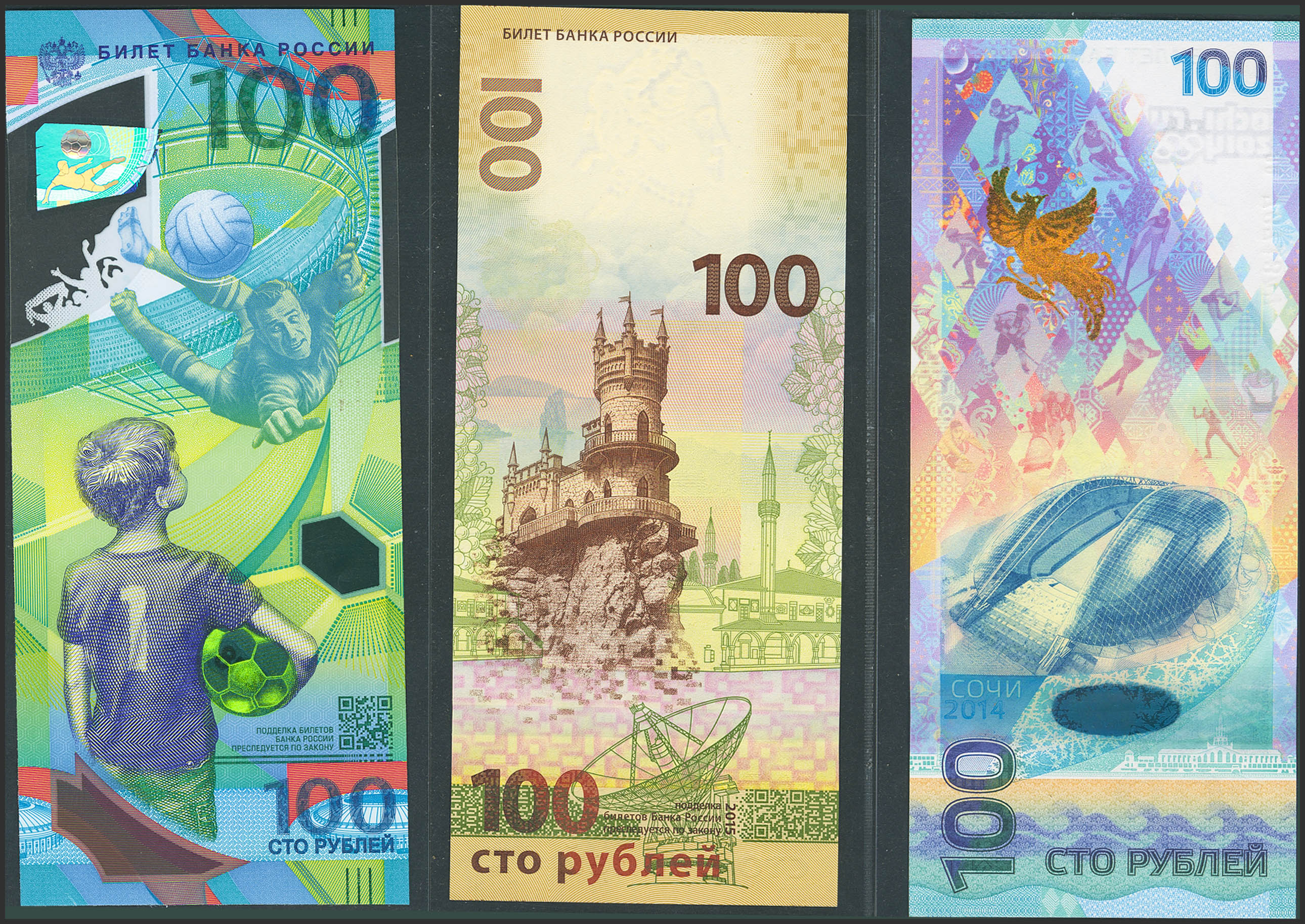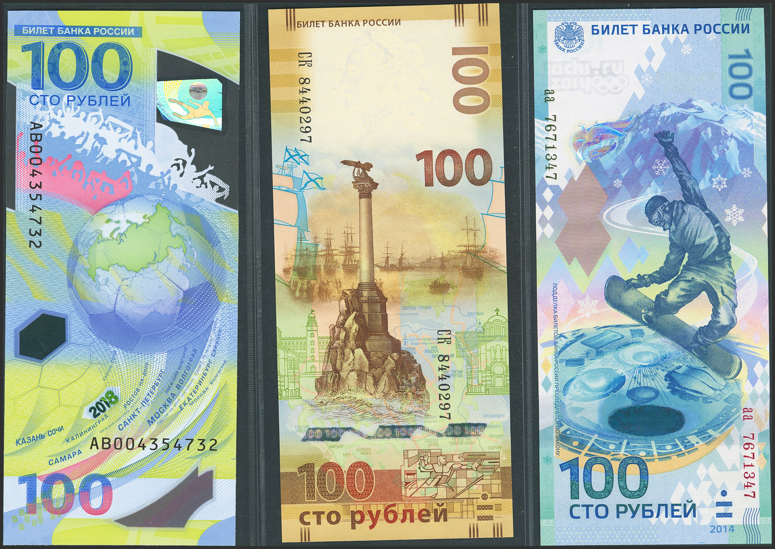 RUSSIA-FEDERATION. Lot of 3 notes of 100 Rubles. (2014ca). Bank Rossii. Commemorative Issues. (Pick: 274b, 275a, 280). Uncirculated.