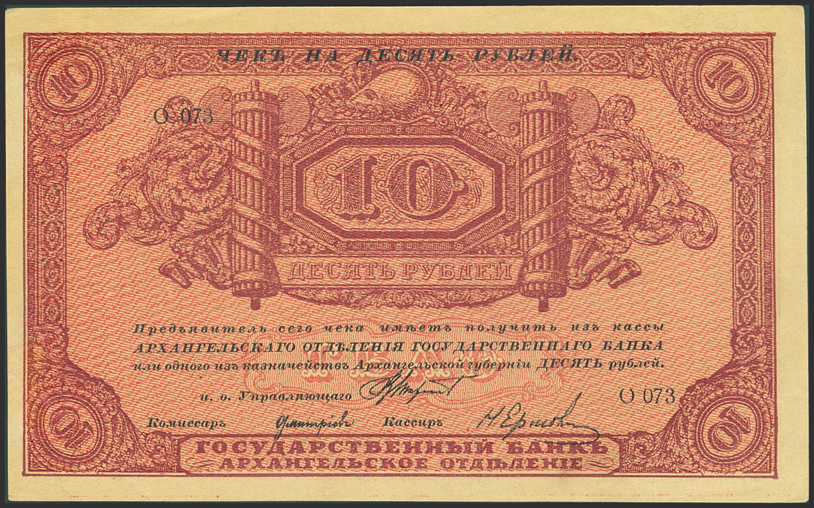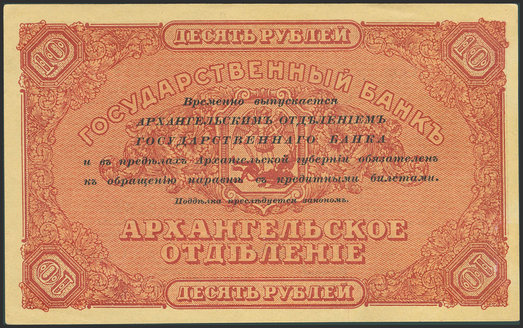 RUSSIA-NORTH. 10 Rubles. (1918ca). Gosudarstvenniy Bank. Arkhangel'sk Branch. Issue of the Red Regime. (Pick: S103). Almost Uncirculated.