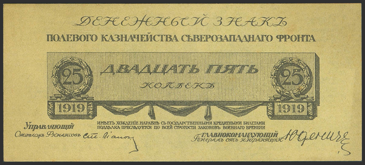 RUSSIA-NORTHWEST. 25 Kopeks. 1919. Field Treasury of the Northwest Front. Issue of General Nikolay Yudenich. (Pick: S201). Less than Uncirculated.