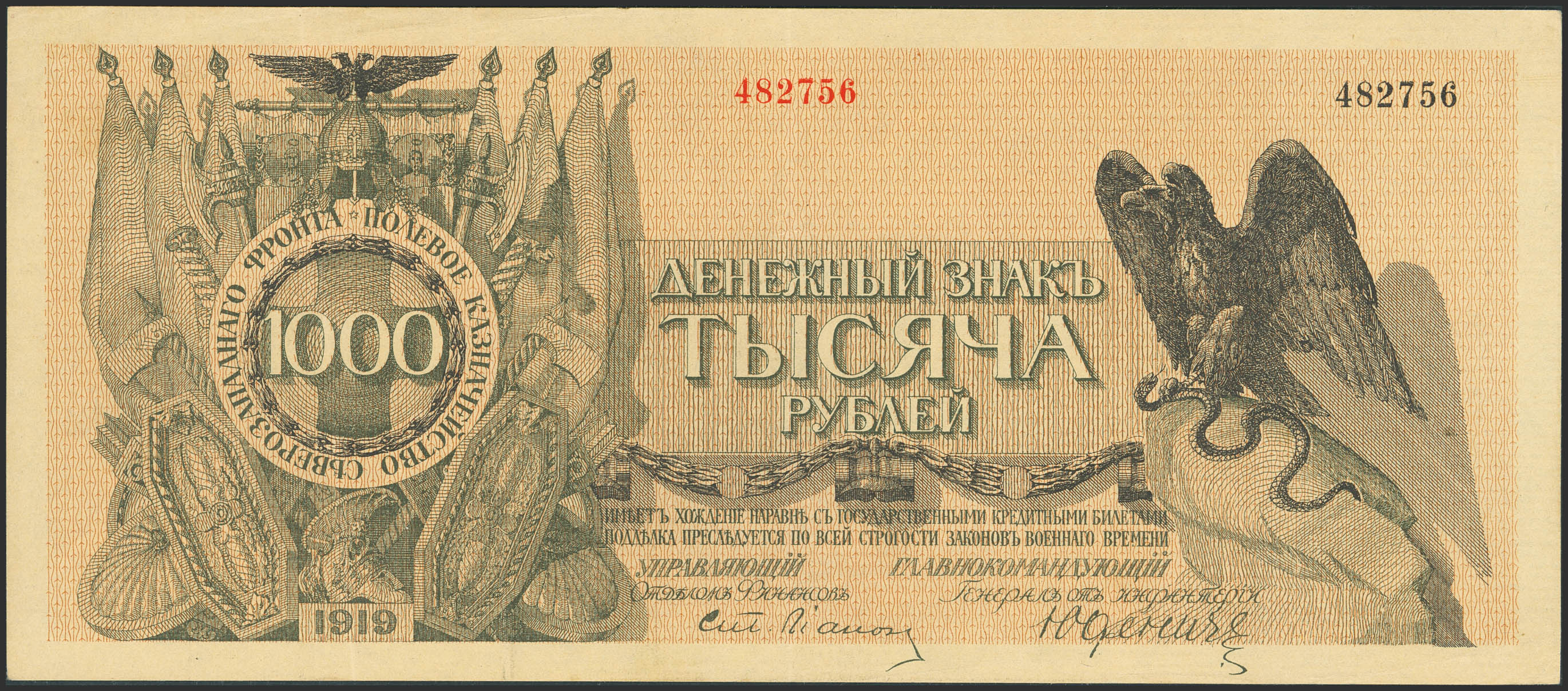 RUSSIA-NORTHWEST. 1000 Rubley. 1919. Field Treasury of the Northwest Front. (Pick: S210). Extremely Fine.