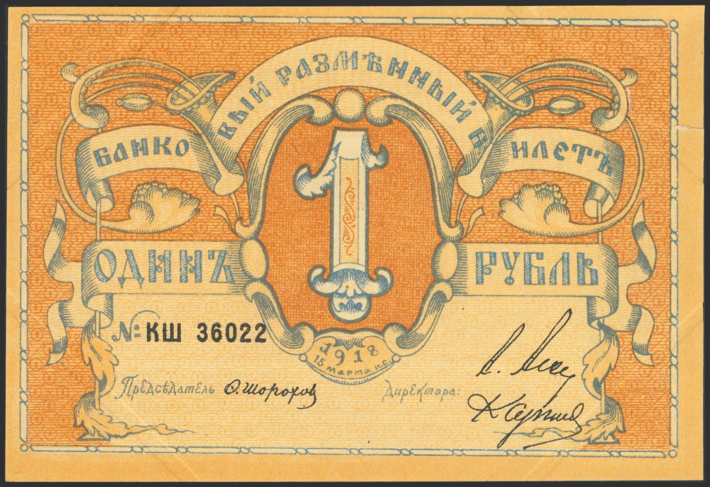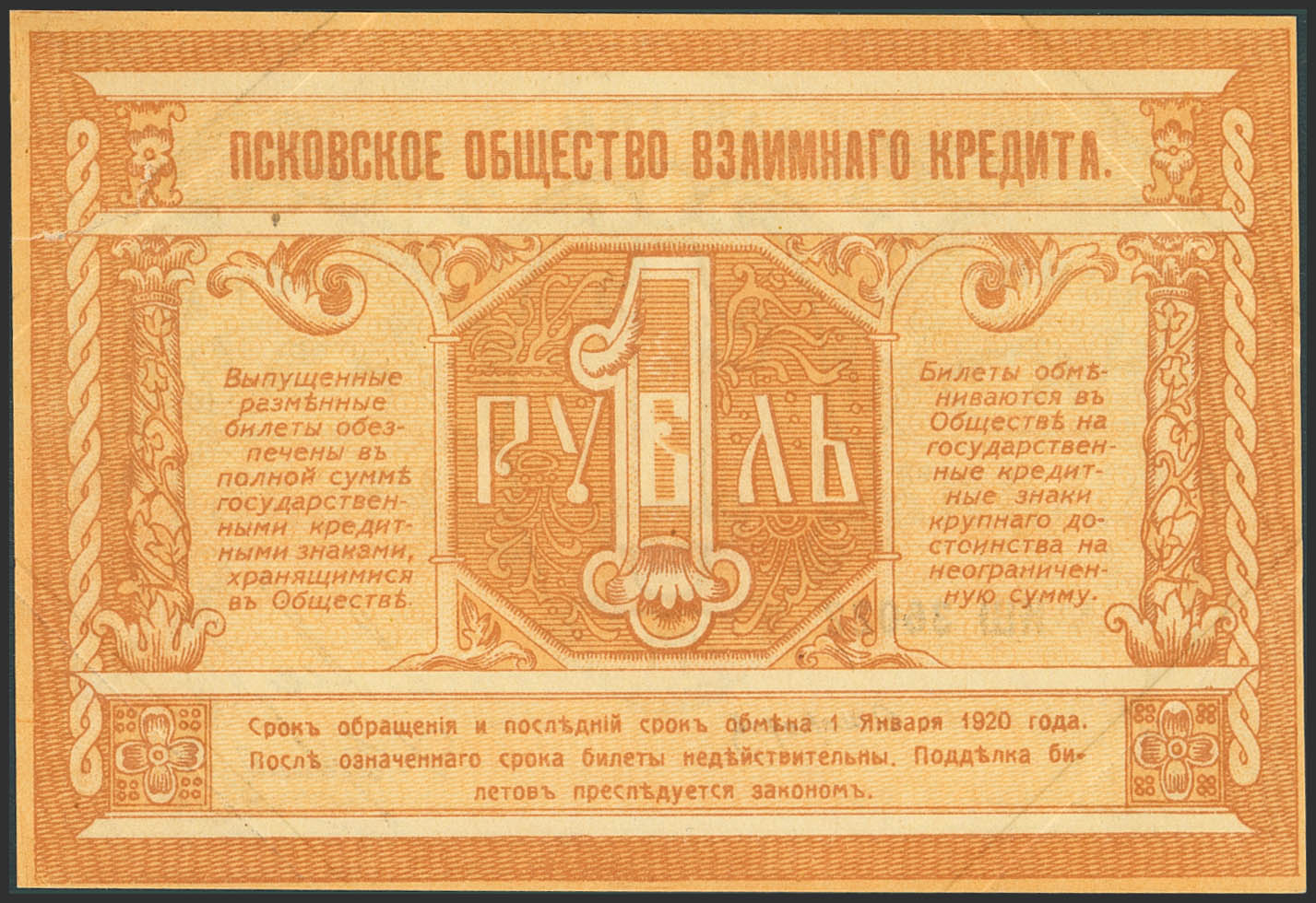 RUSSIA-NORTHWEST. 1 Ruble. 15 March 1918. Pskov Bank. (Pick: S212). Tear at left. Less than Uncirculated.