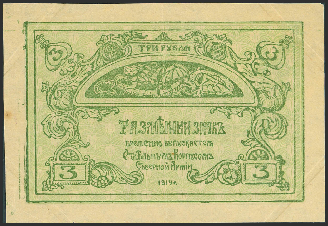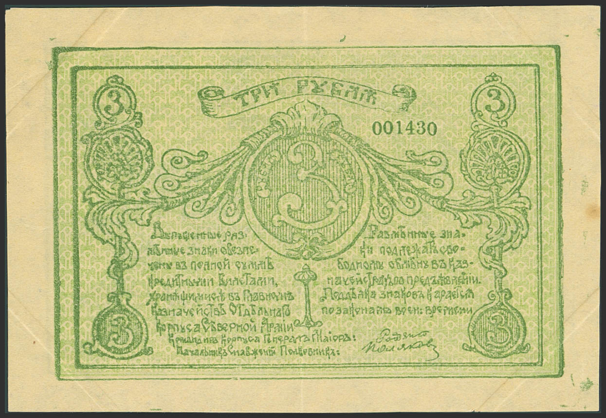 RUSSIA-NORTHWEST. 3 Rubles. 1919. Special Corps of Northern Army. General Rodzianko. (Pick: S220). Stain. Almost Uncirculated.