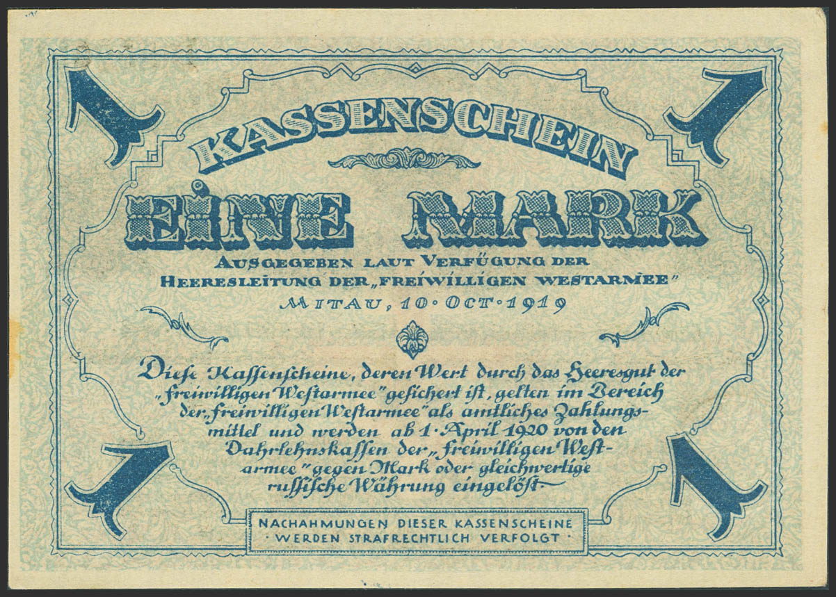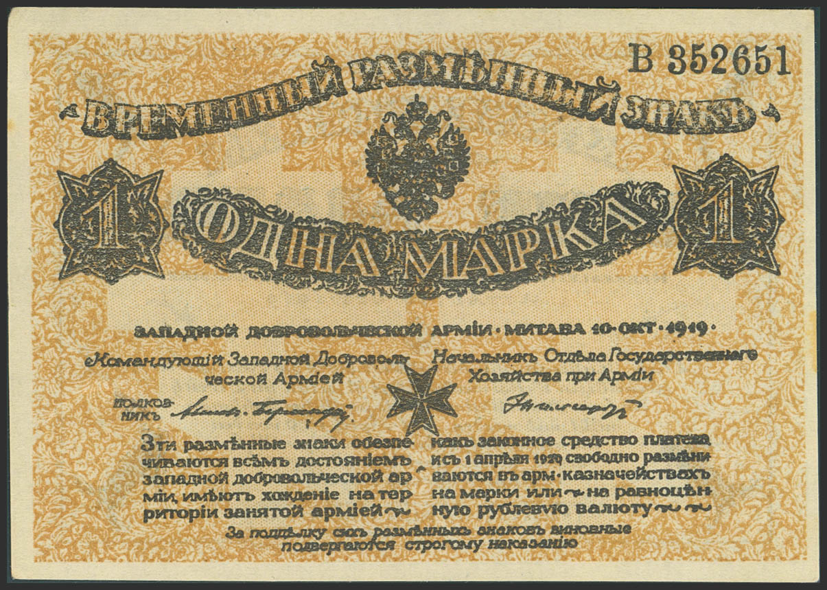 RUSSIA-NORTHWEST. 1 Marka. 10 October 1919. Western Volunteers Army. Mitava. (Pick: S226a). Less than Uncirculated.