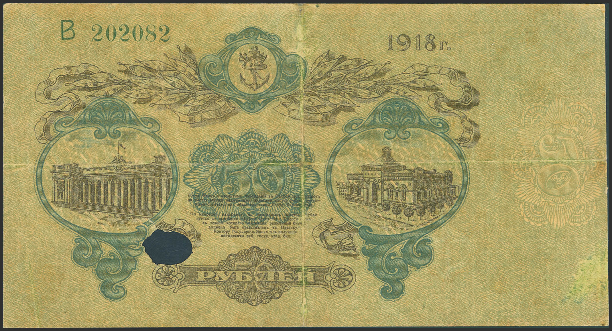 RUSSIA-UKRAINE AND CRIMEA. 50 Rubles. 1918. Town of Odessa. Exchange Note. (Pick: S338). Tears and big hole. More than Very Fine.