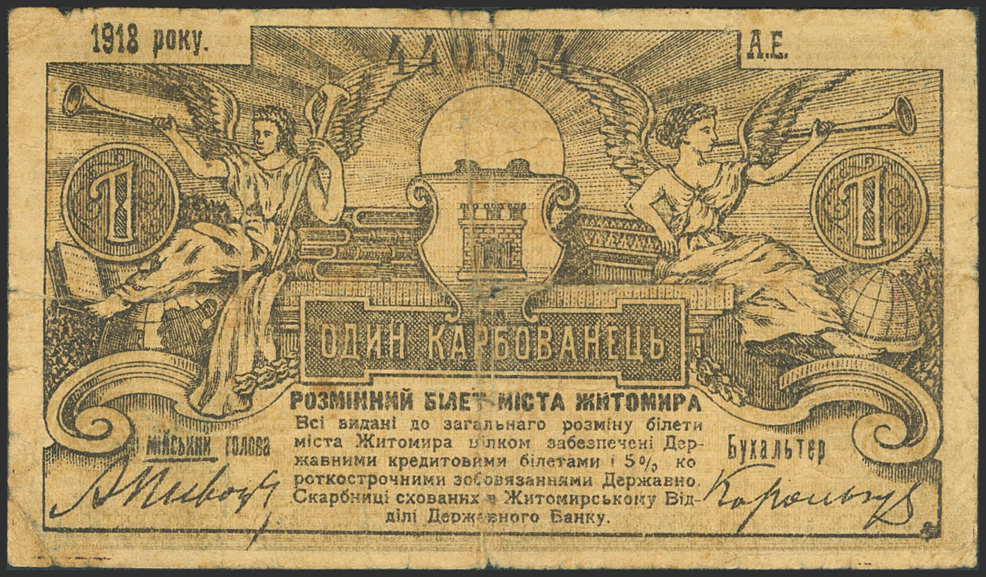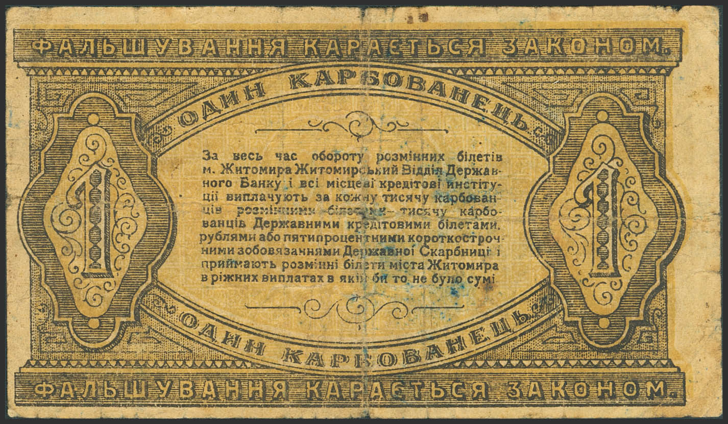 RUSSIA-UKRAINE AND CRIMEA. 1 Karbovanets. 1918. Municipality of Zhytomyr. Municipal Receipt. (Pick: S341). Tears, pinhole and central tear. More than Fine.