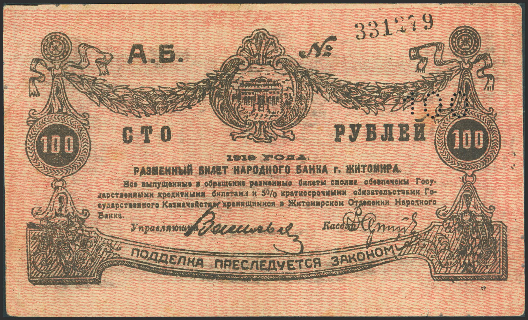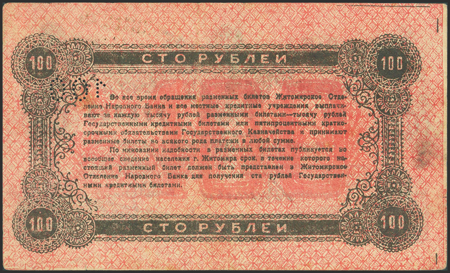 RUSSIA-UKRAINE AND CRIMEA. 100 Rubles. 1919. National Bank. Town of Zhytomyr. Exchange Note. (Pick: S346). Extremely Fine.