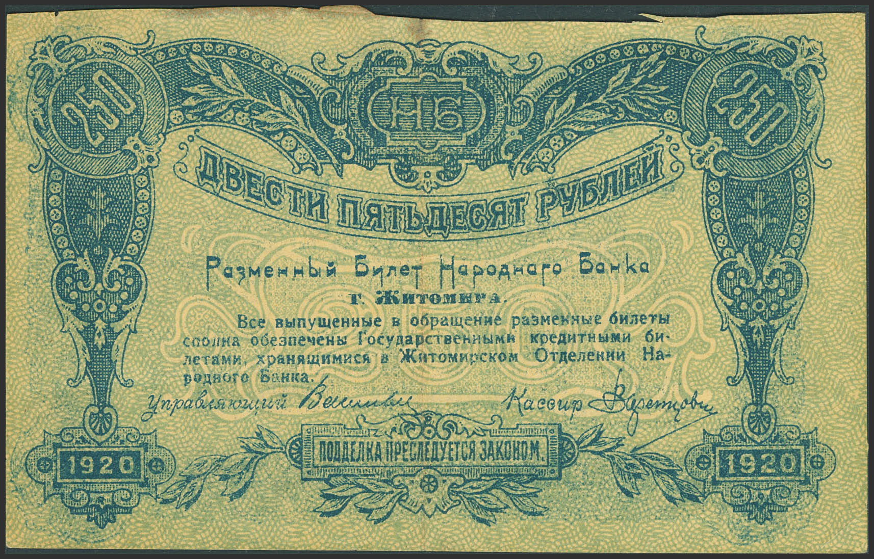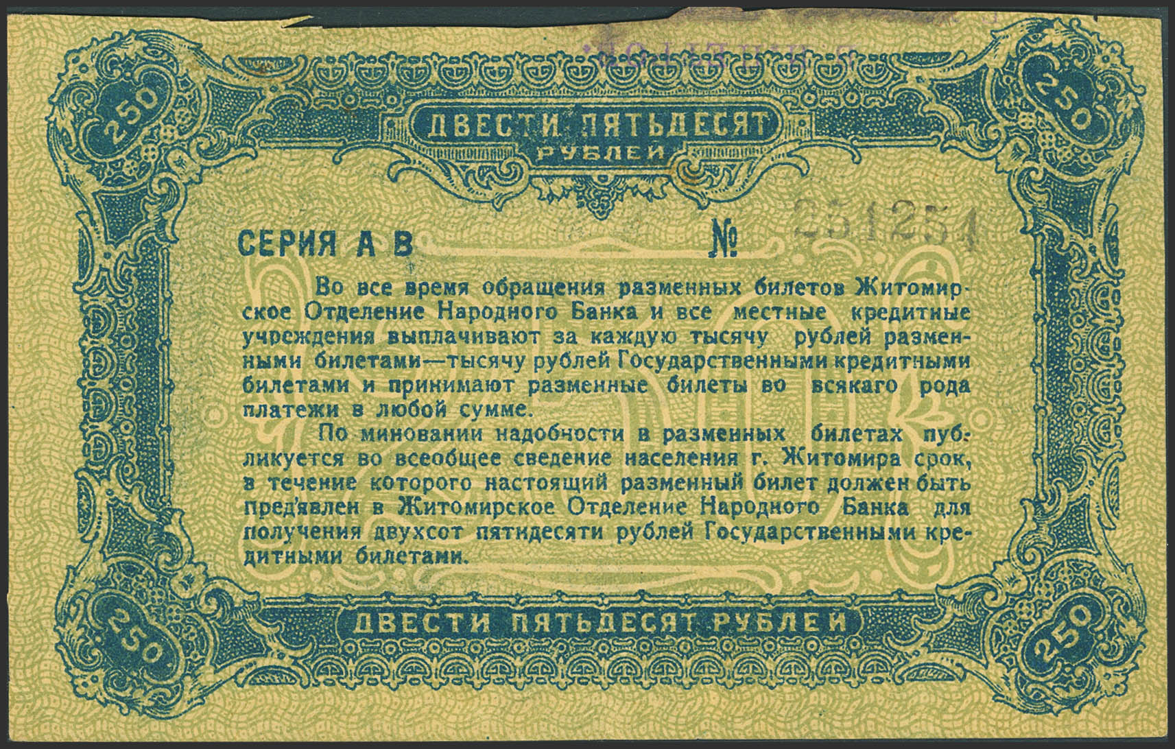 RUSSIA-UKRAINE AND CRIMEA. 250 Rubles. 1919. National Bank. Town of Zhytomyr. Exchange Note. (Pick: S347). Irregular cut on the upper edge. Extremely Fine.