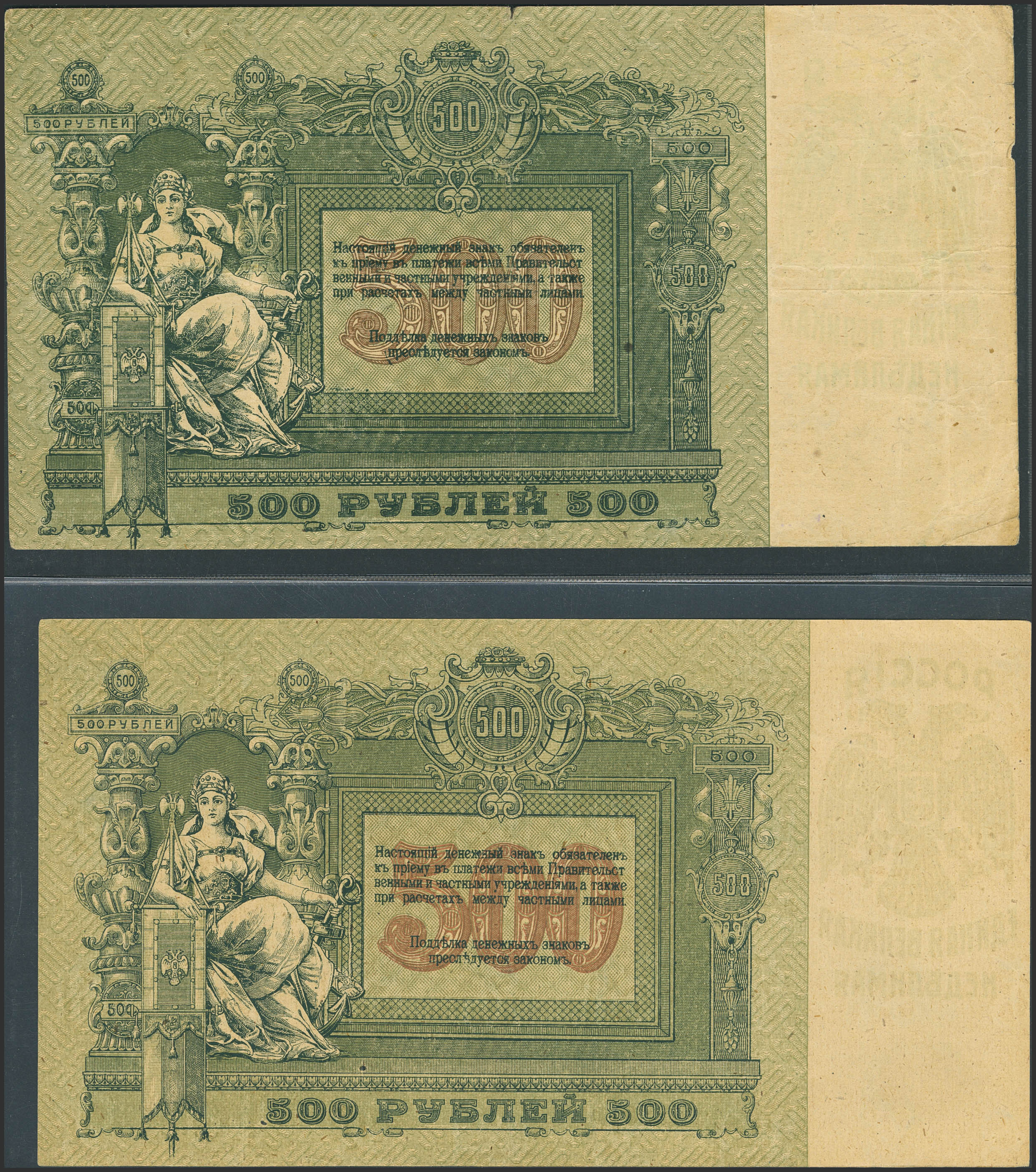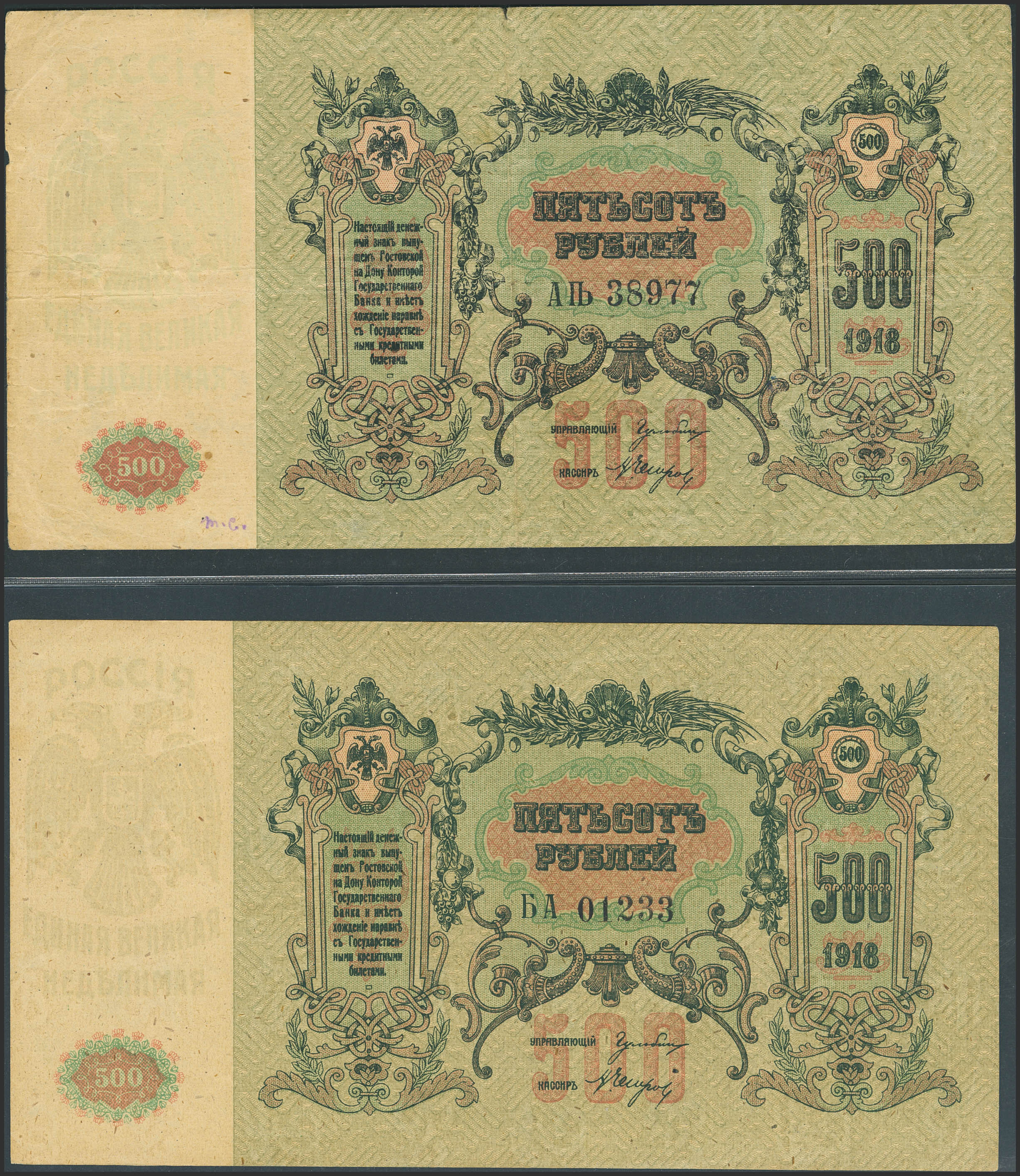 RUSSIA-SOUTH. Lot of 2 notes of 500 Rubley. 1918. Gosudarstvenniy Bank. With Watermark. (Pick: S415c). Almost Uncirculated and More than Very Fine.
