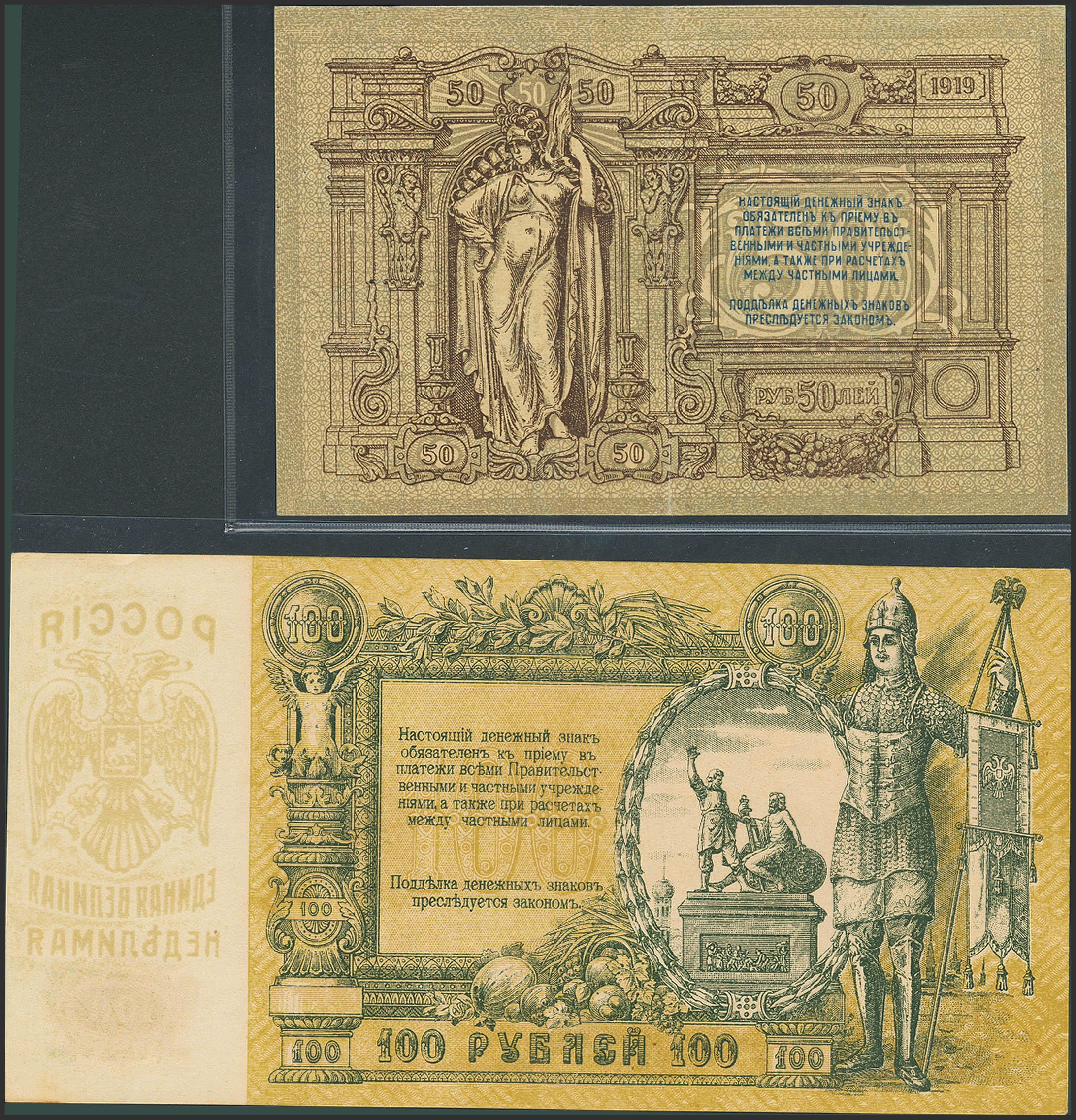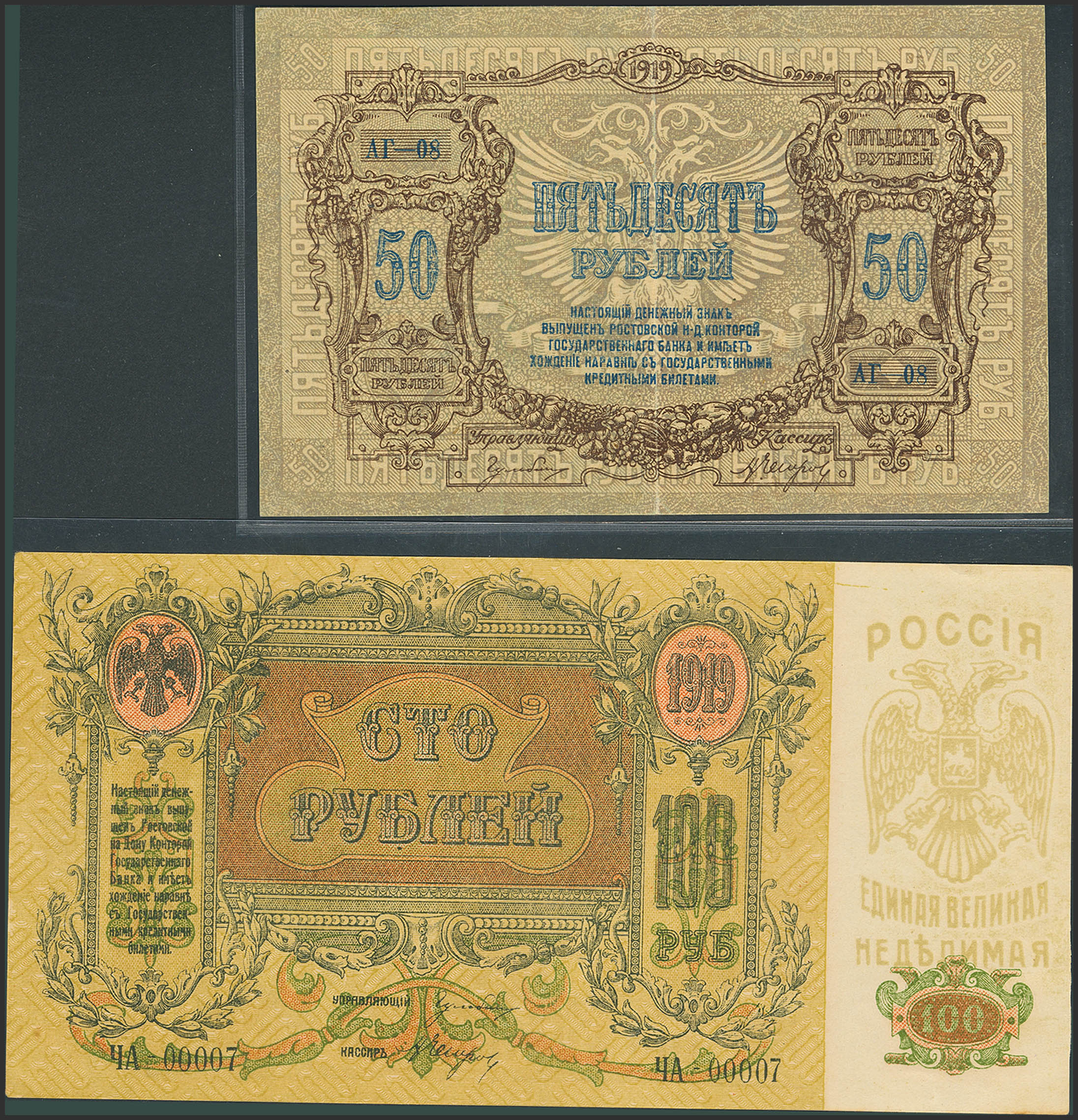 RUSSIA-SOUTH. Lot of 2 notes of 50 and 100 Rubles. 1919. State Bank. (Pick: S416a, S417a). Pinholes on the S416. Almost Uncirculated and Less than Uncirculated.