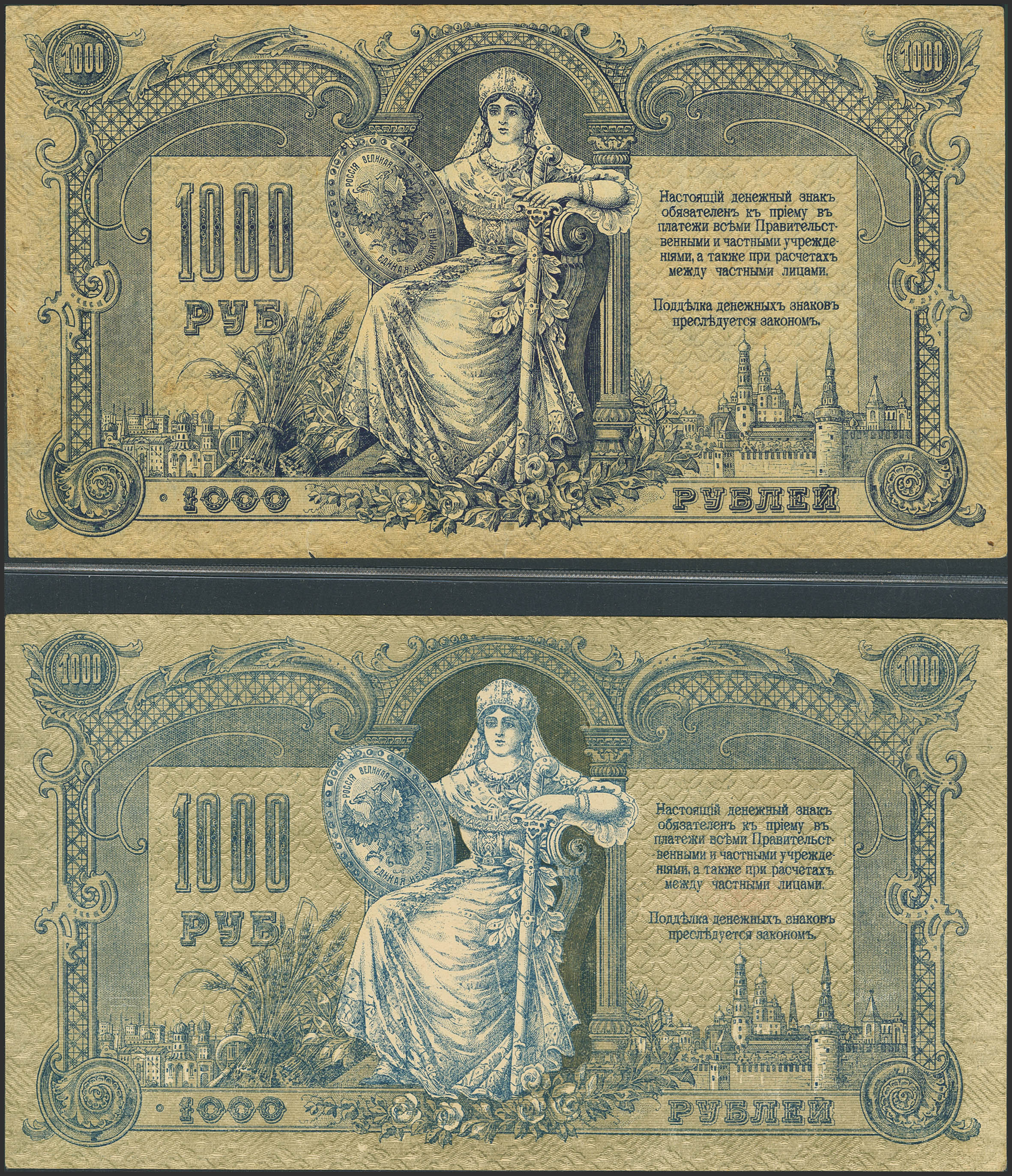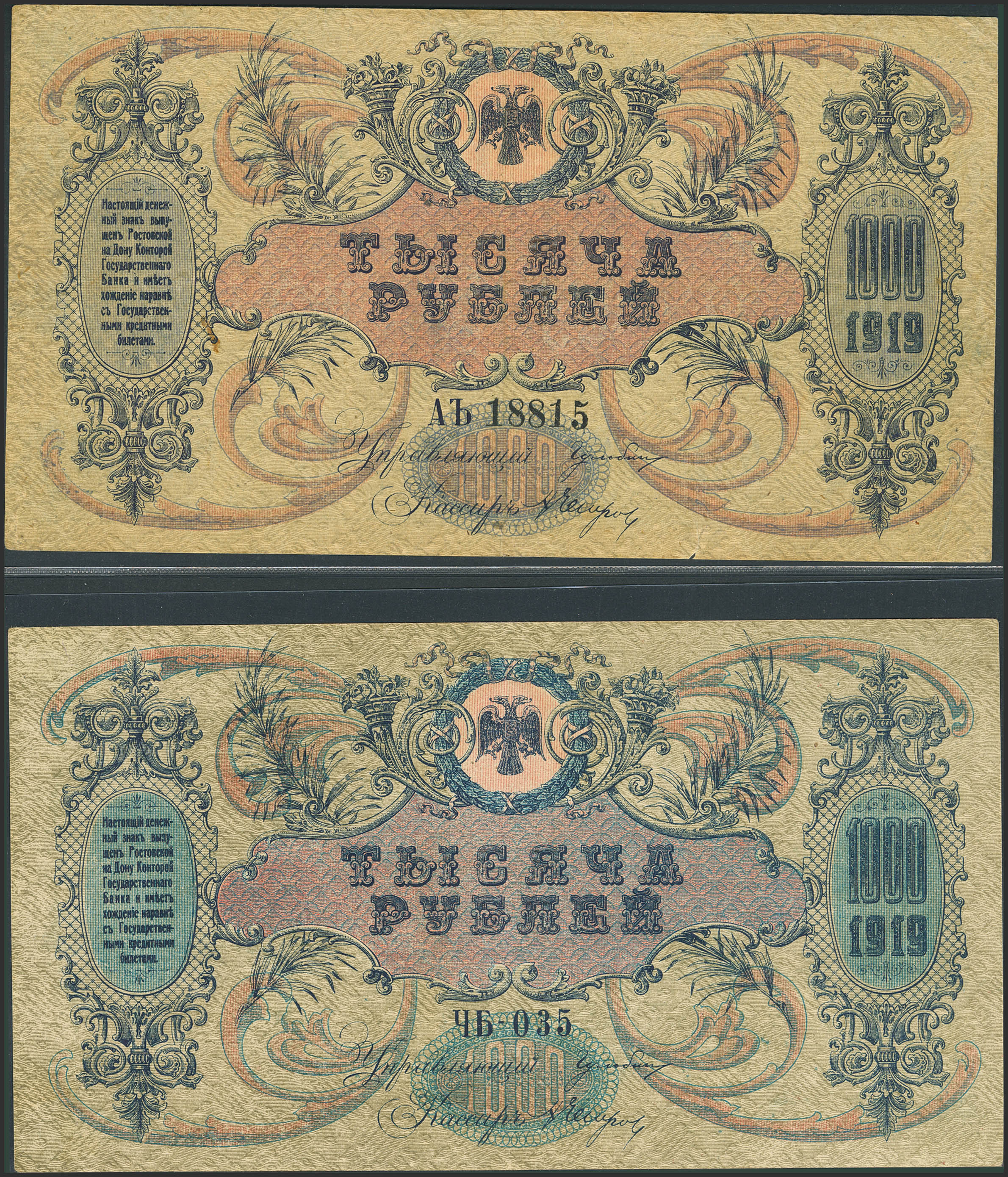 RUSSIA-SOUTH. Lot of 2 notes of 1000 Rubley. 1919. Gosudarstvenniy Bank. (Pick: S418a, S418b). Almost Uncirculated and Extremely Fine.