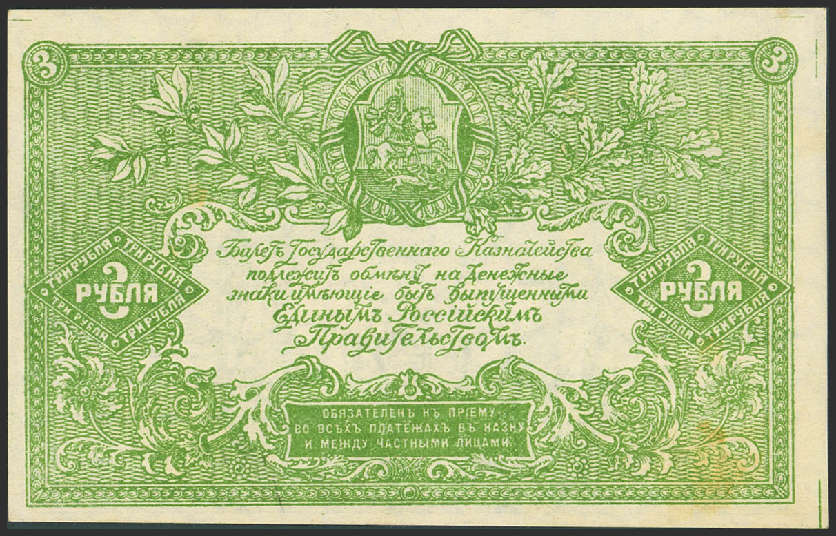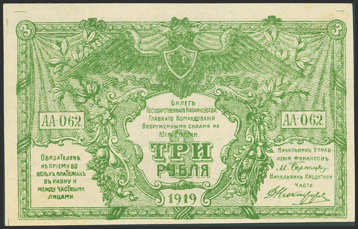 RUSSIA-SOUTH. 3 Rubles. 1919. State Treasury of High Command of the Armed Forces in South Russia. (Pick: S420a). Almost Uncirculated.